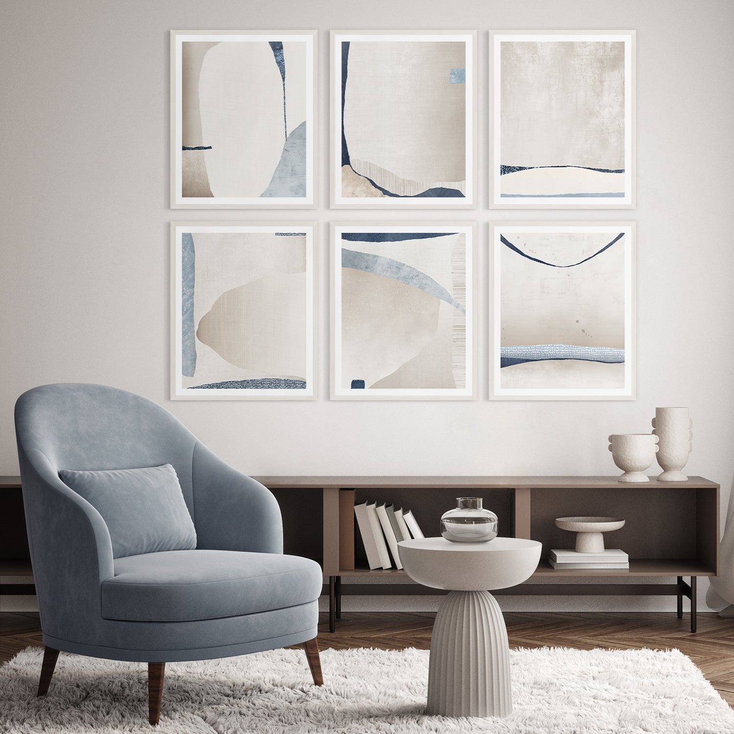 Soft tones of ivory, taupe, browns, blues, and white blend seamlessly to create a soothing, serene effect. The gentle combination of sand-inspired hues and calming blues evokes the tranquility of coastal landscapes, while the interplay of varied textures and patterns highlights the collage style. Each piece captures the essence of a peaceful retreat, making it a perfect addition to spaces in need of quiet elegance and natural beauty.