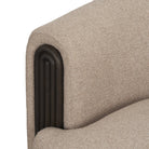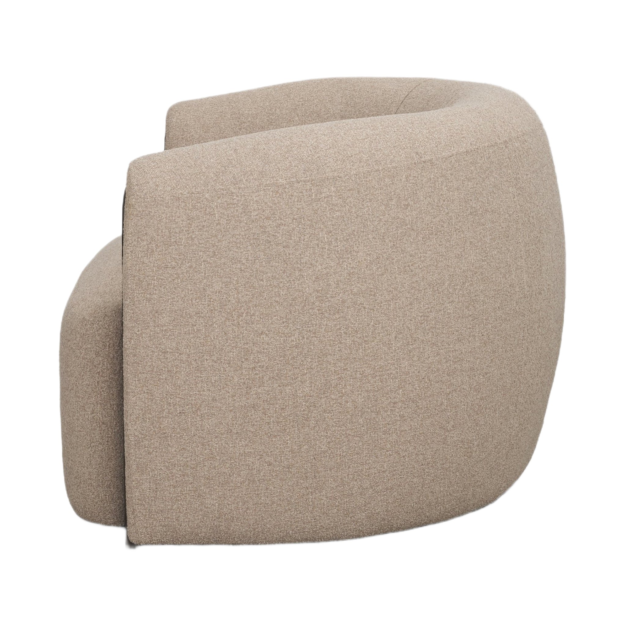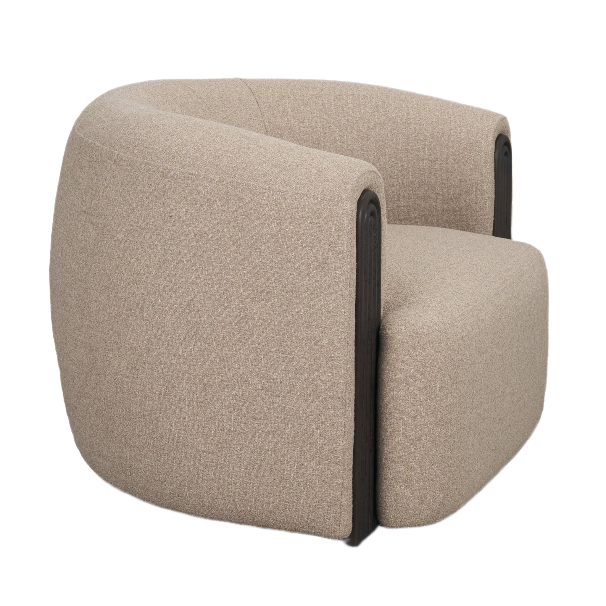 Kelley Accent Chair is upholstered in a textured mushroom gray fabric and espresso brown wood accents, featuring a curved silhouette and a barrel backrest.