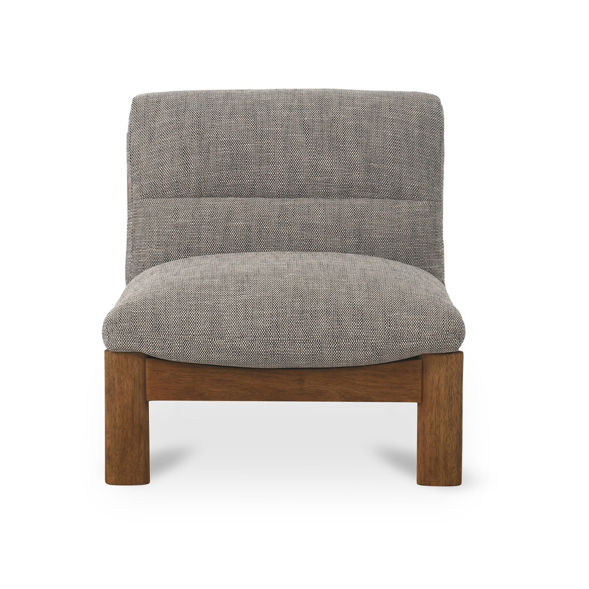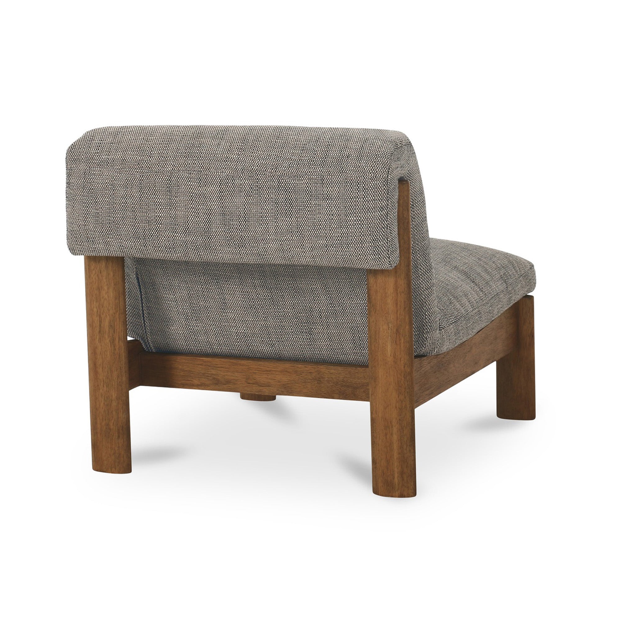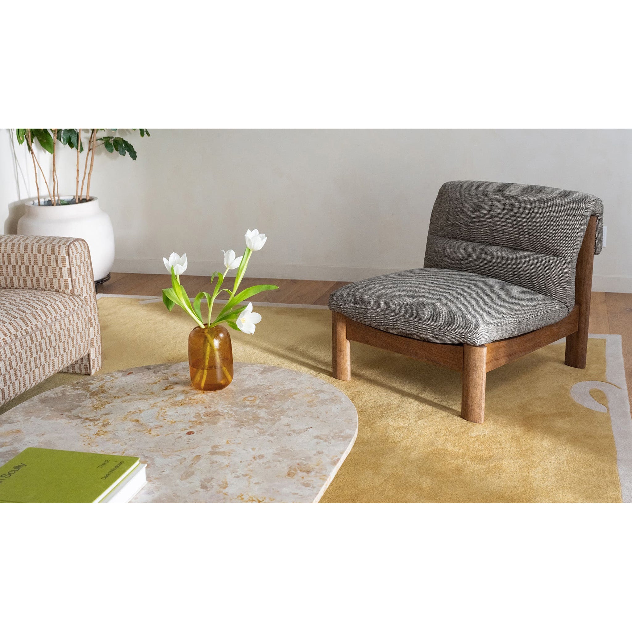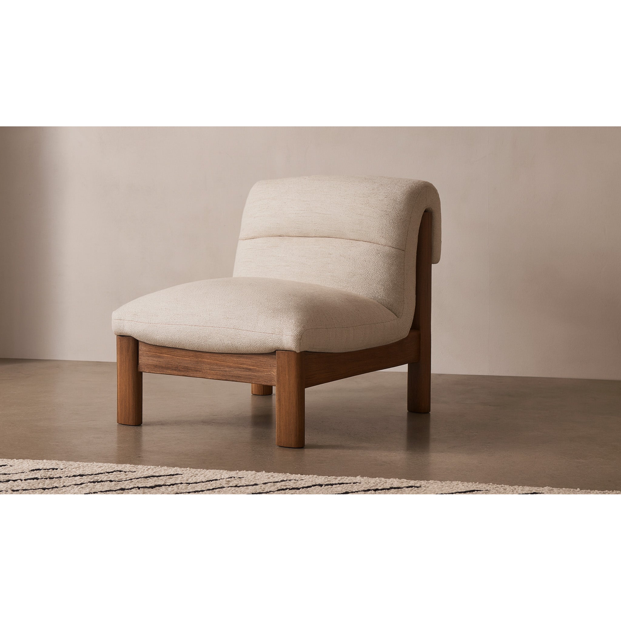 Folded to get noticed. Pierce leans into '70s spirit with its low profile, armless frame, and tufting. The foldover detail softens the structure, giving it shape and slouch in equal measure. Wrapped in a flecked fabric, it brings contrast with a solid wood base that keeps it grounded. The kind of seat that says, "stay a while"-and means it.