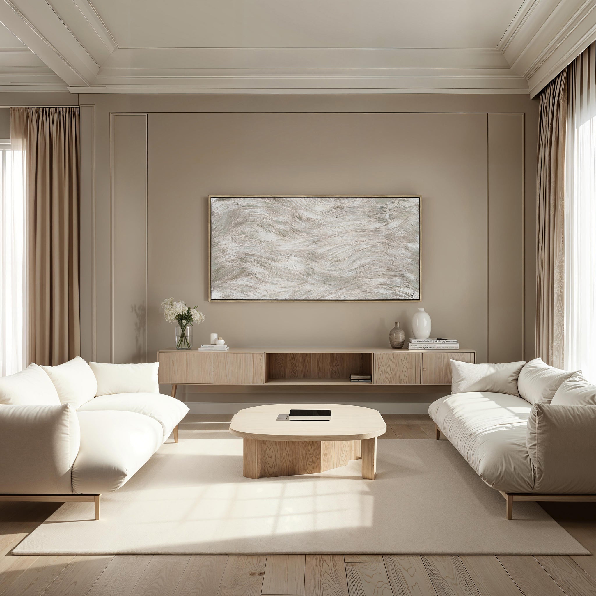 From guest designer, Steven Sabados, comes this hand-painted walnut-framed canvas, perfect for transitional or modern spaces. Composed with neutral shades of beige and brown, it brings warmth and texture to any room. Featuring oversized dimensions and 2-way hanging, display this wall art canvas vertically or horizontally to bring your vision to life.