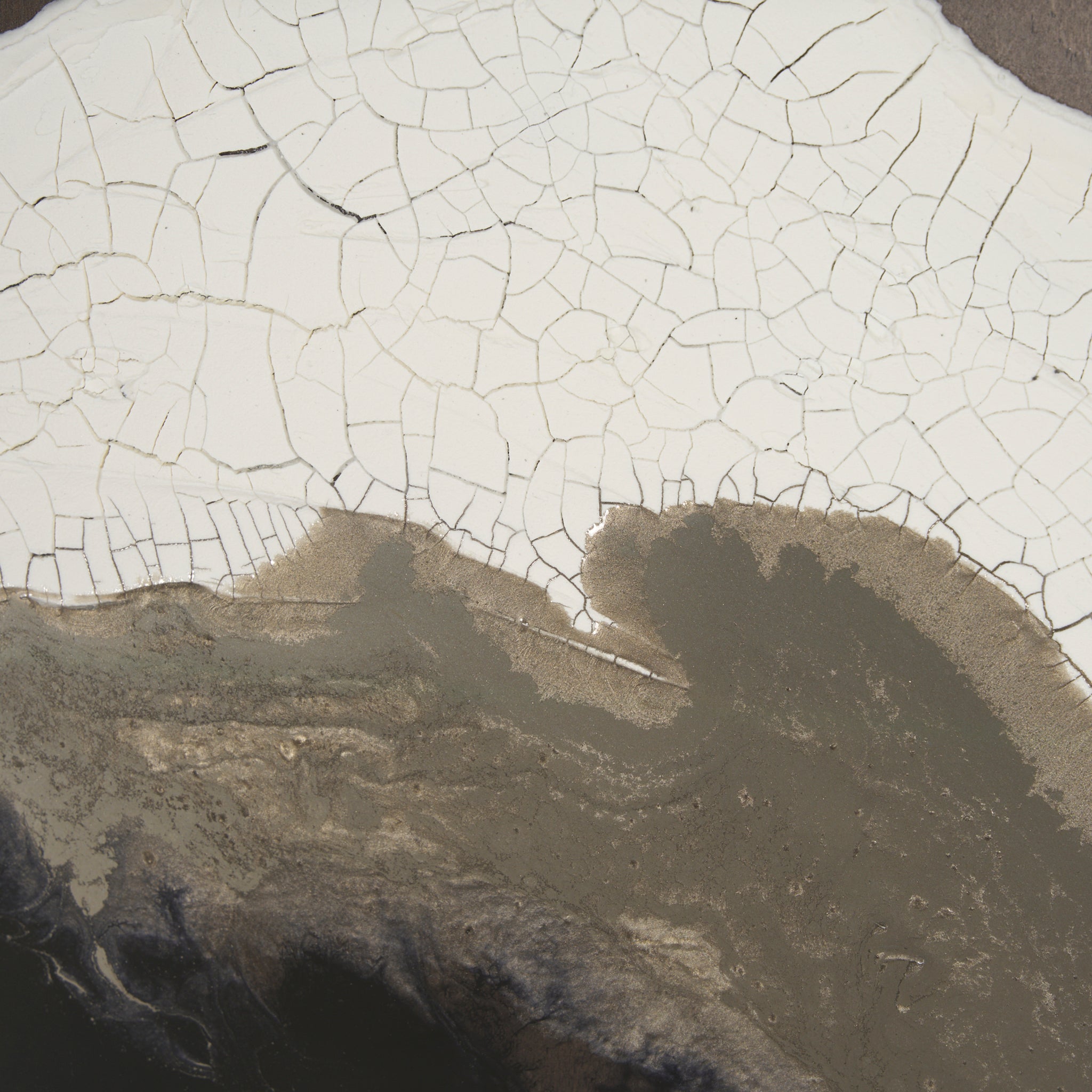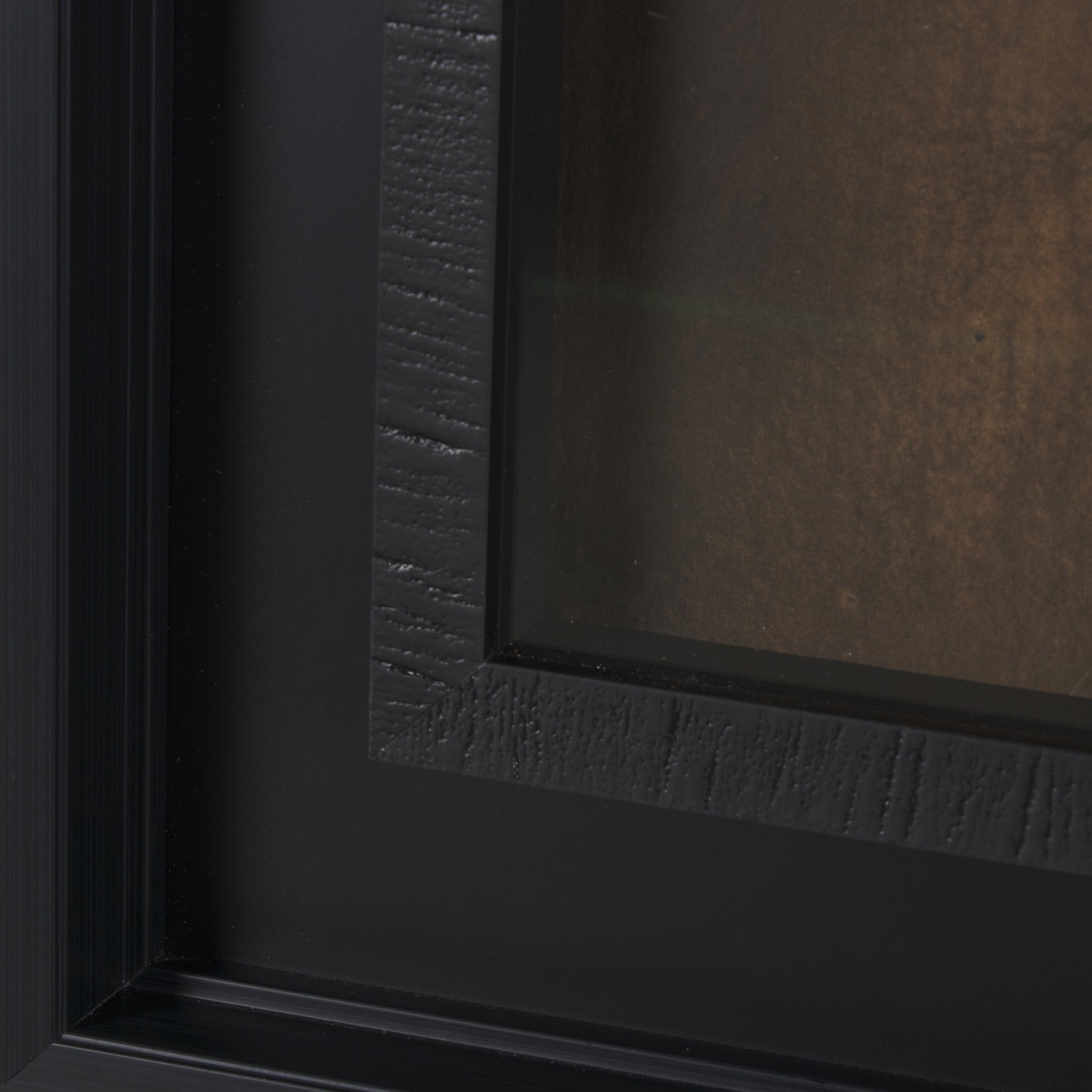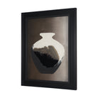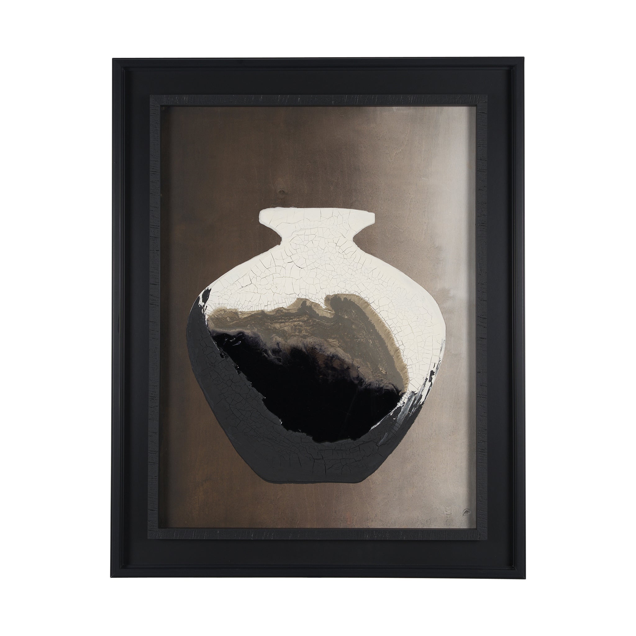 Introduce a unique blend of rustic charm and modern artistry with this captivating framed artwork. It features a striking abstract vessel, distinguished by its heavily textured, cracked white glaze contrasting with bold black forms and subtle swirling details, all set against a rich, earthy background. This piece creates a sophisticated and contemporary statement, perfect for adding an artistic focal point with intriguing texture to your decor.