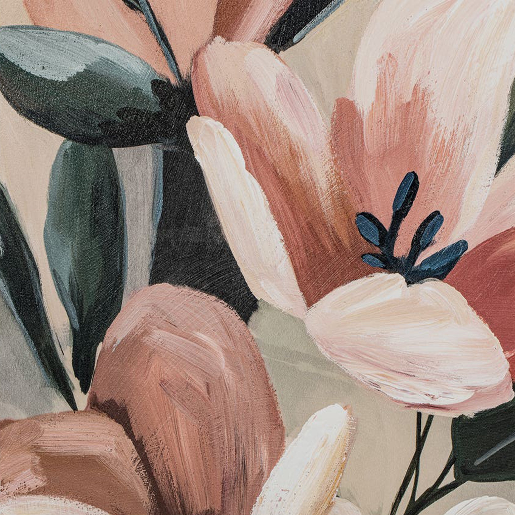 The Elegance II painting elegantly fuses the cool hues of green with warm, nostalgic pinks across florals that exude softness and romance. Its textured brushstrokes lend a tactile softness to each petal, enhancing the vintage charm of the piece. Ideally suited for transitional homes, the painting is a timeless testament to nature's enduring beauty.