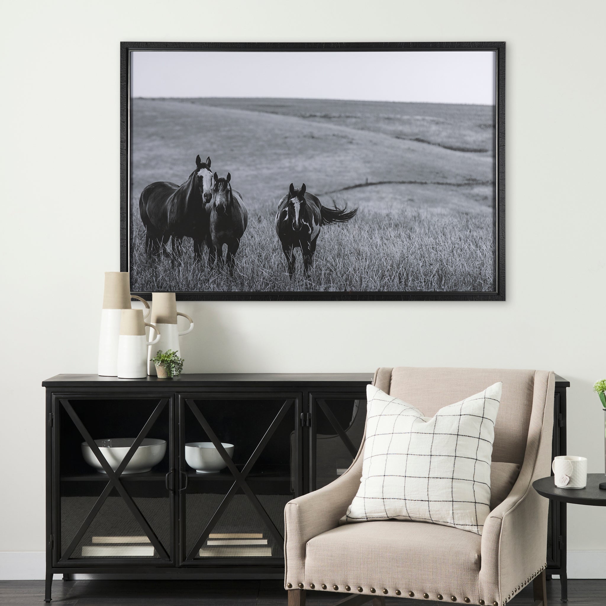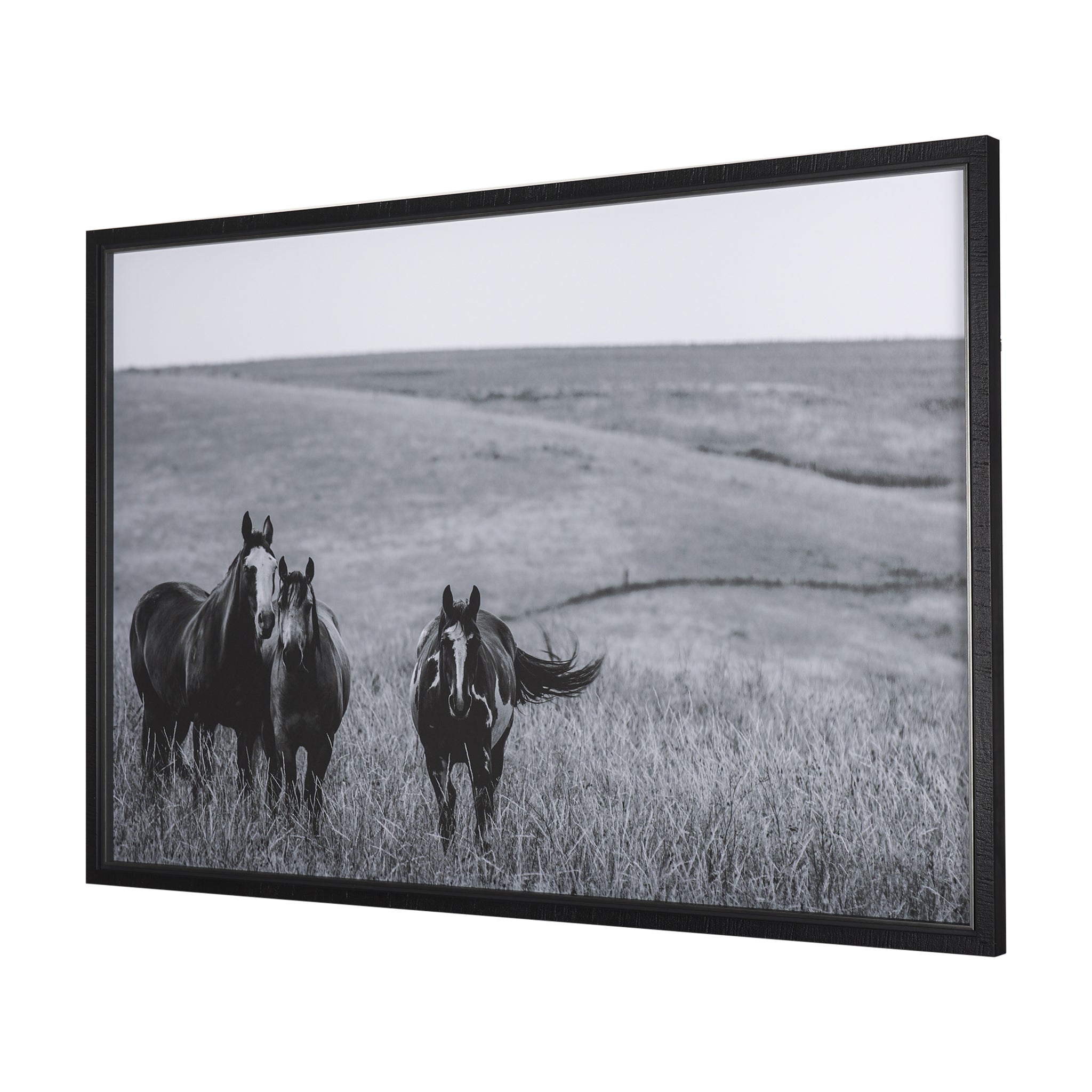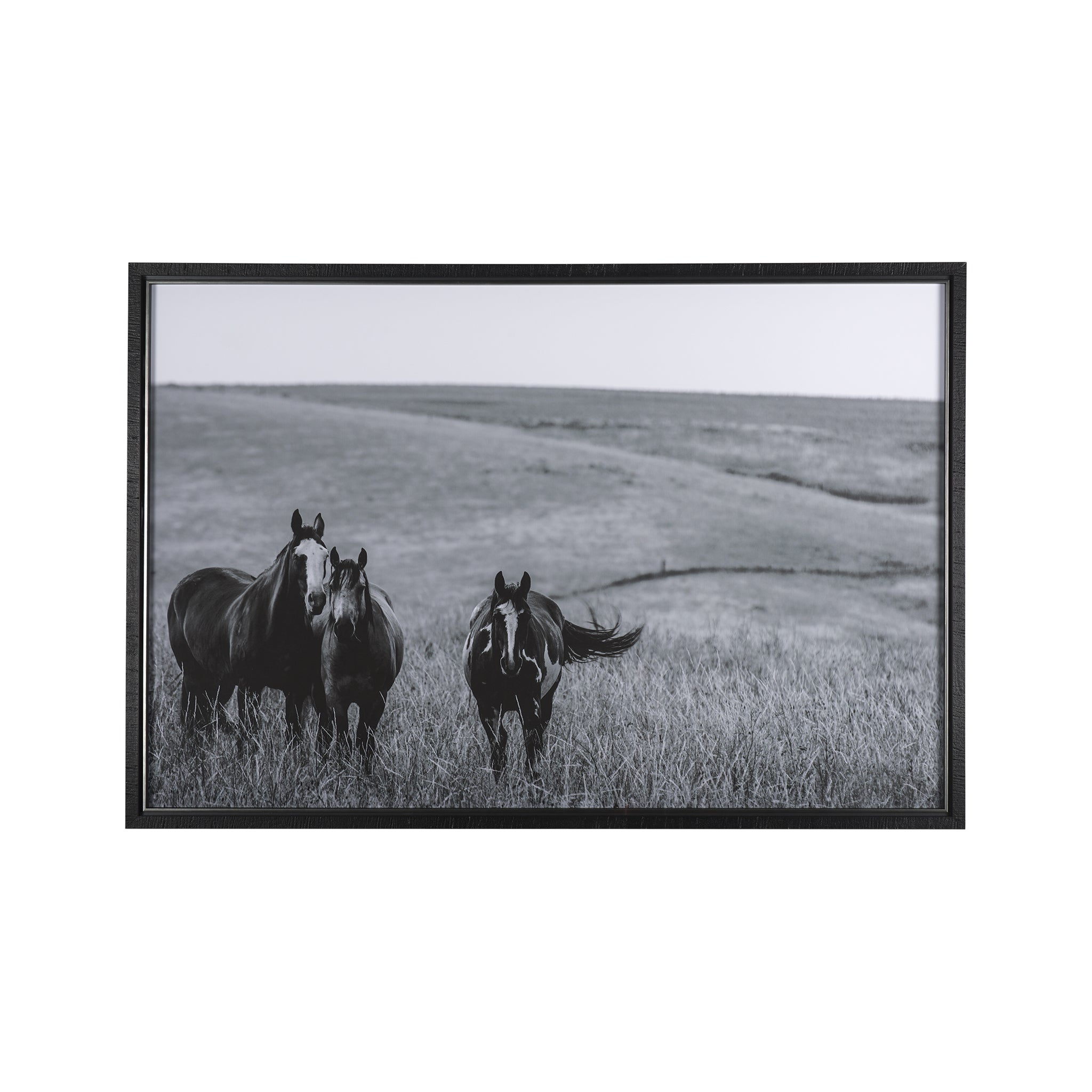 Bring the majestic serenity of the open plains into your home with this striking framed artwork. Captured in timeless black and white, three powerful horses stand amidst a windswept grassy field, evoking a sense of untamed beauty and quiet strength. This versatile piece adds a dramatic and classic natural element, perfect for a study, living room, or entryway.