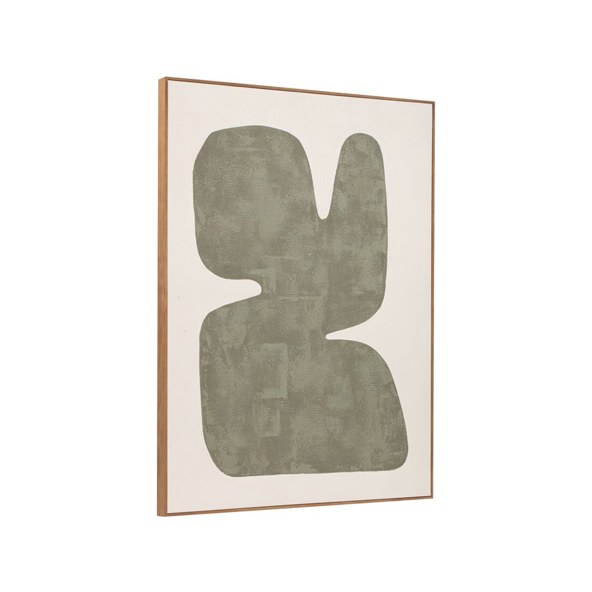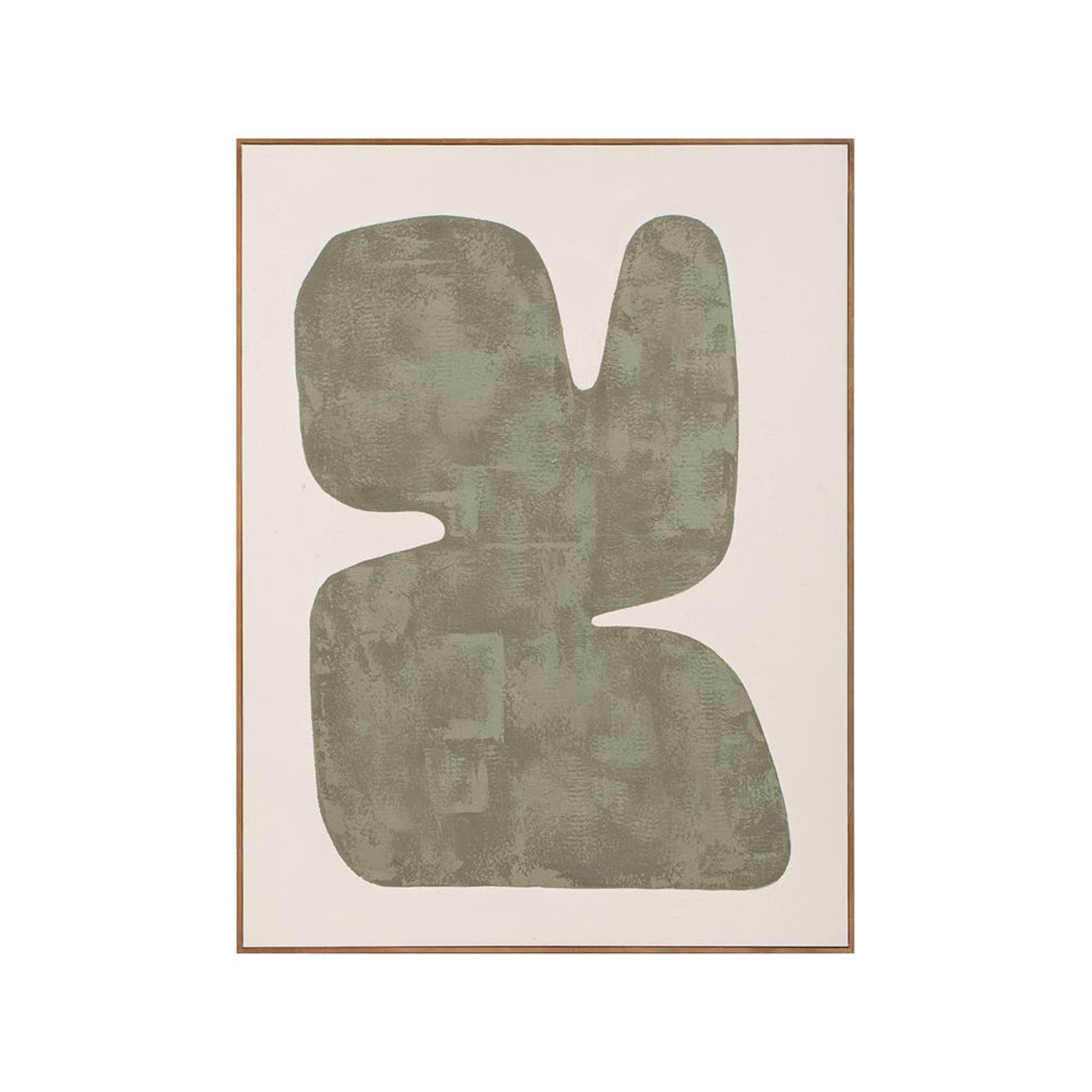 The Forms II framed painting bridges bold modernism and everyday sophistication. Rich sage green hues dance against an off-white background, creating a harmonious balance. This abstract, free-form painting is encased in a solid pine frame, adding warmth and natural charm.