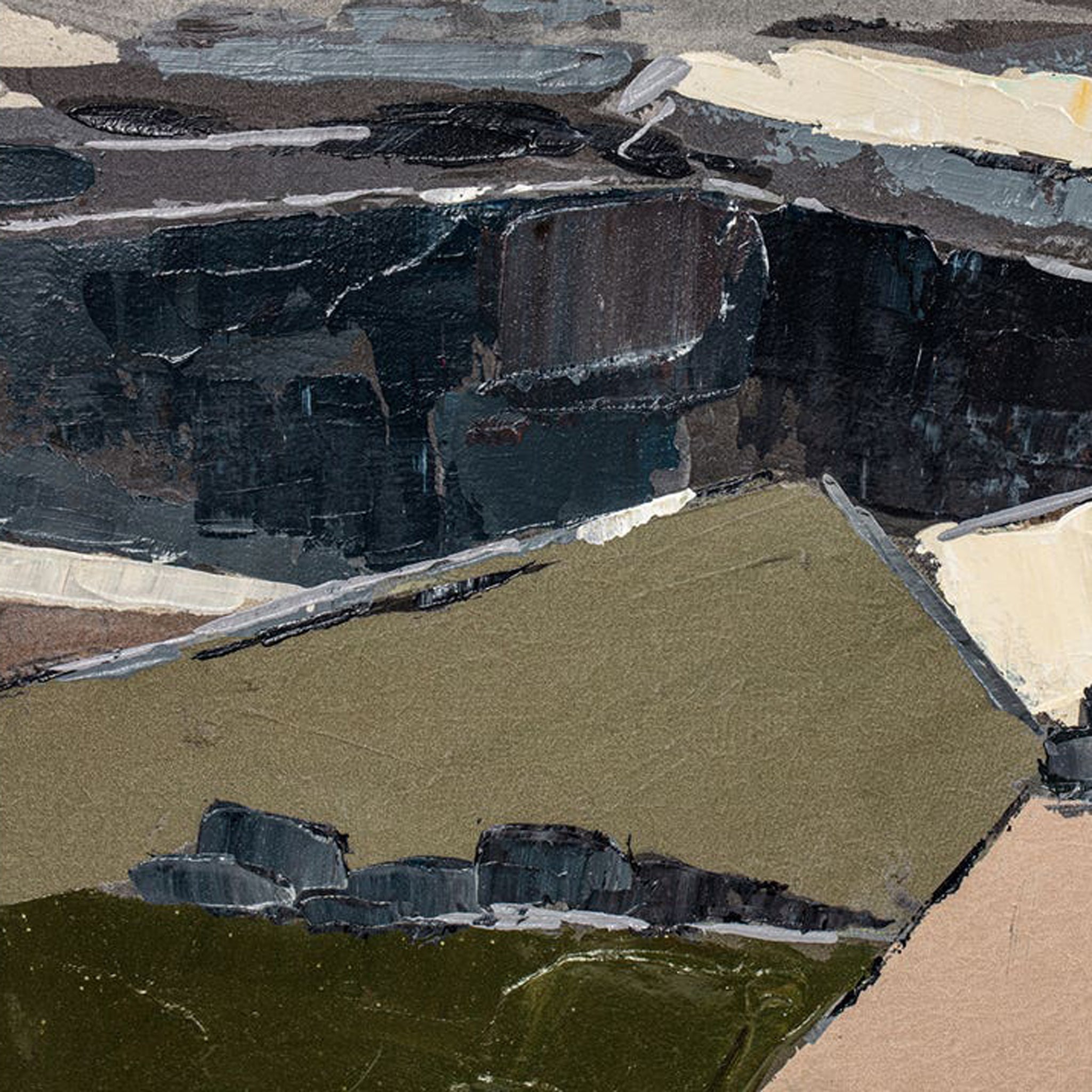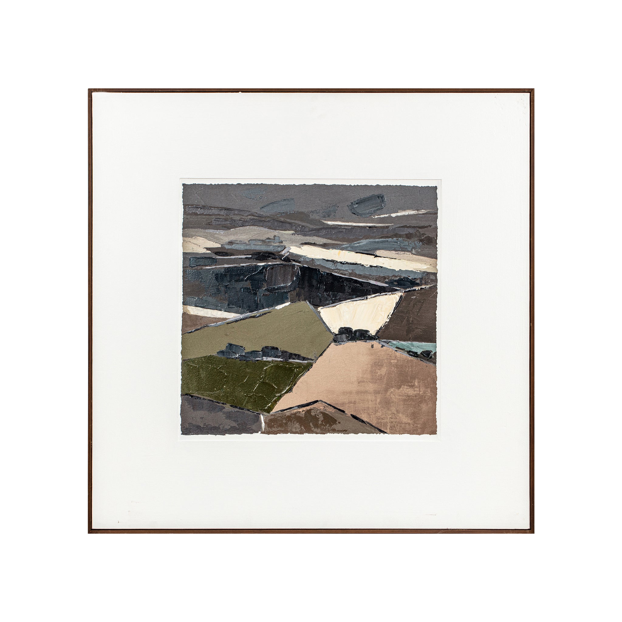 The Grounded framed painting captures an abstract landscape in a dance of cool and warm tones, suggesting a vintage essence and heritage richness. Dark grey blues meld with earthy warmth, creating a moody yet grounding atmosphere. A wide matte border elegantly encases the free-form natural elements, offering both focal depth and refined stability.