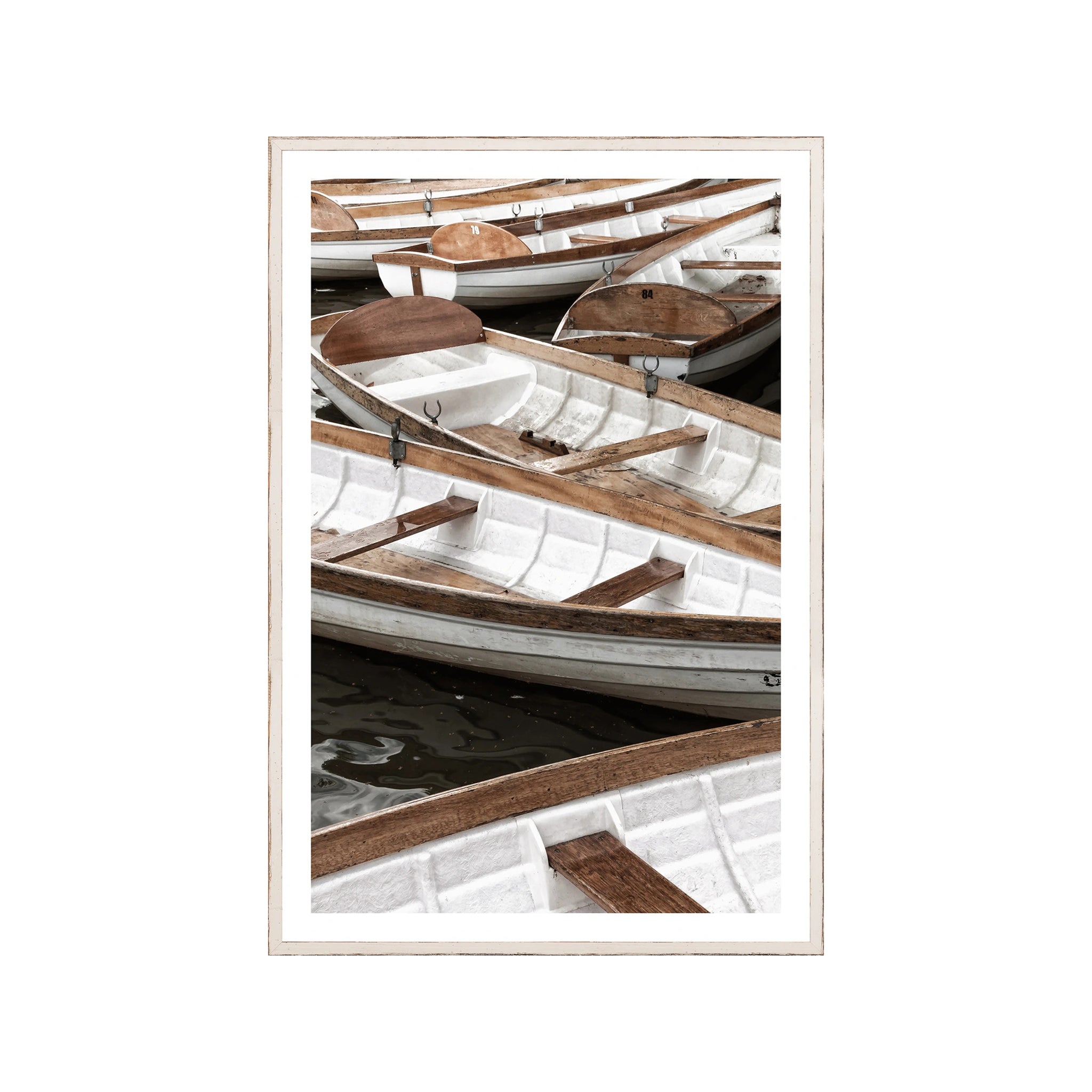A cluster of boats gently rests on tranquil waters, their forms creating a soothing composition of soft curves and reflections. The tones of brown, white, and cream blend seamlessly with the gently lapping water, evoking a sense of quiet calm and coastal charm.