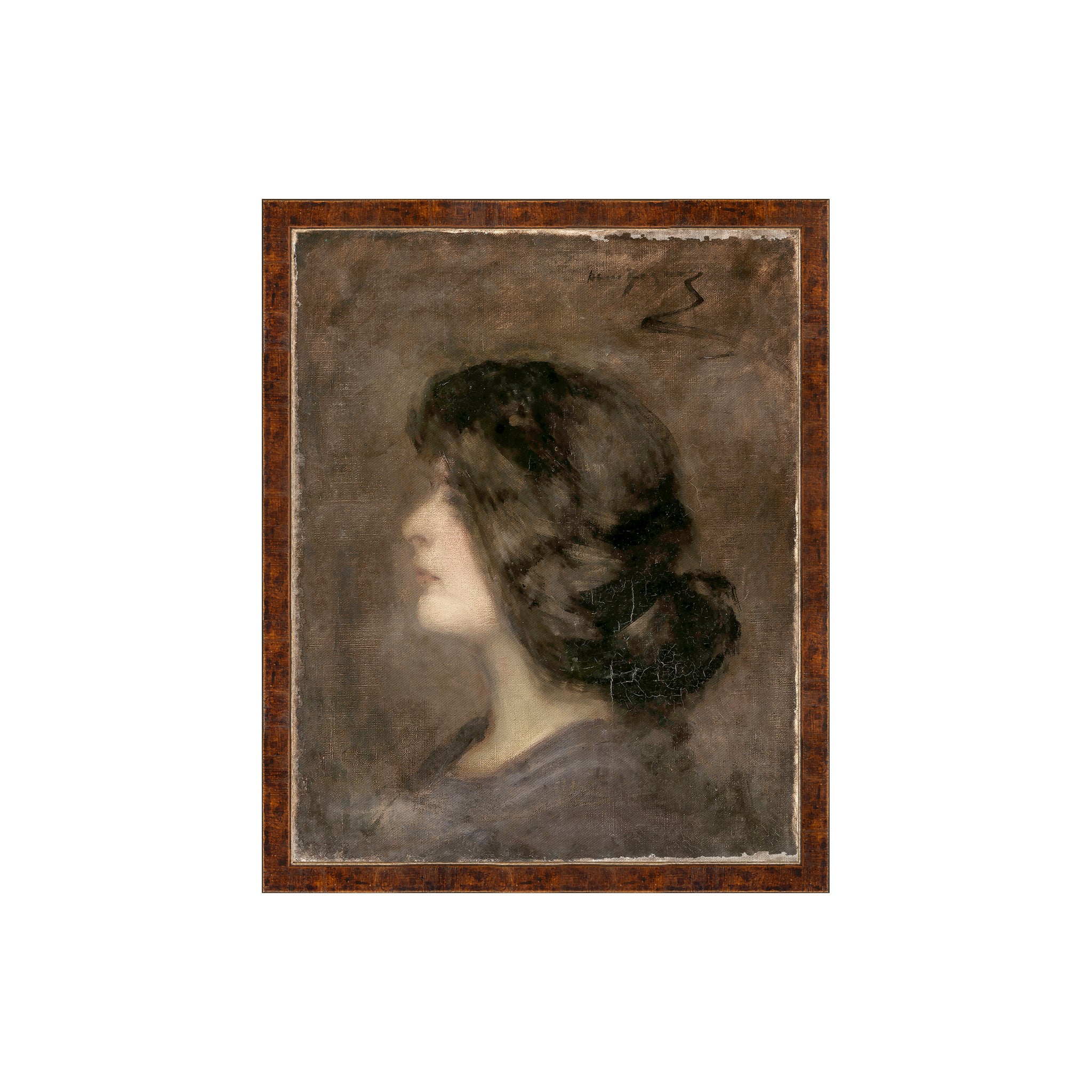 This moody painting portrays the creamy side profile of a teenage girl, with her face partially covered by the swoop of her hair. The brightness of her face juxtaposed on a shadowy background seems to shine, giving light to this stunning petite work of art. Feature this beautiful artwork on its own or make a bigger impact by grouping it with others from the series.
