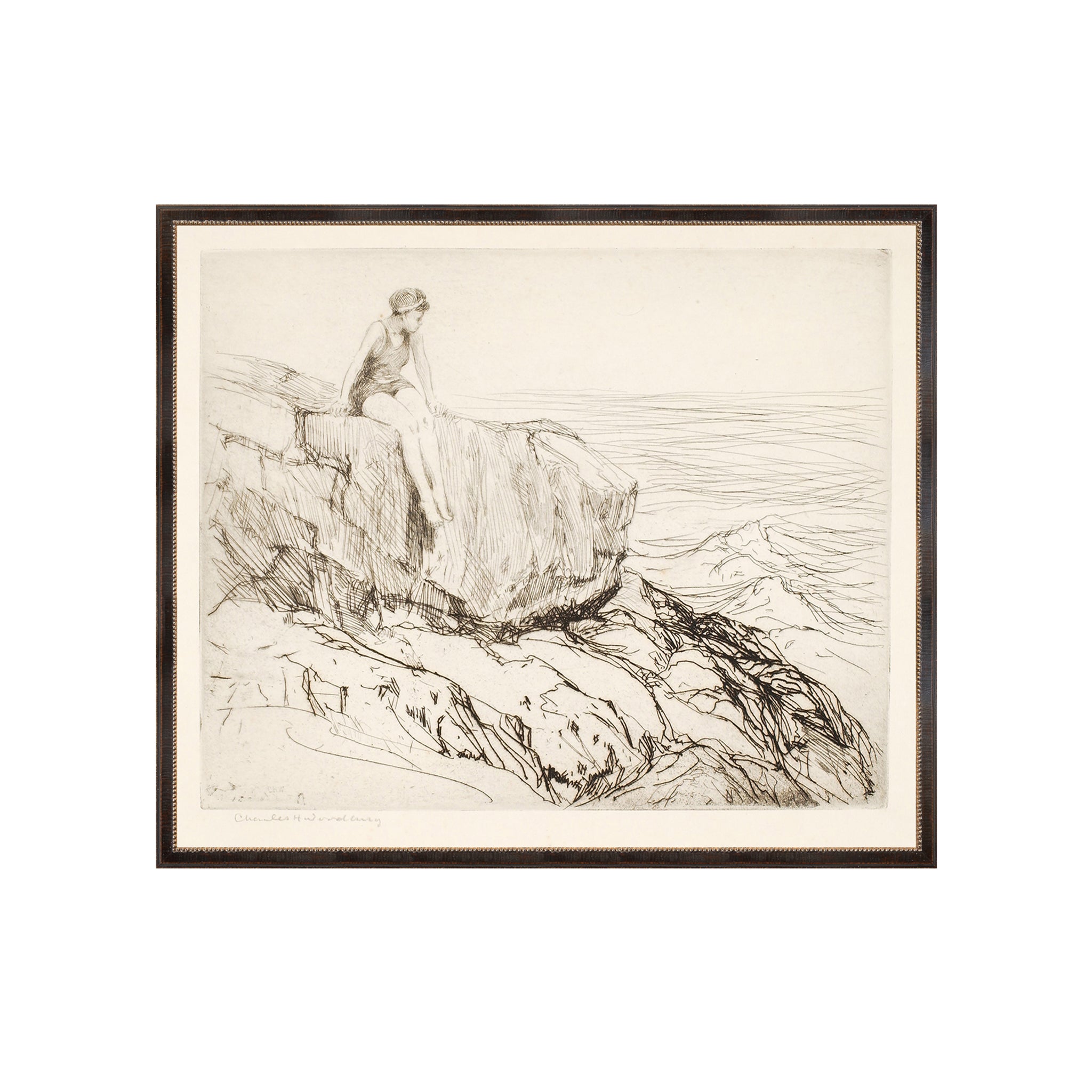 The Cliff is a beautiful etching, done in fine lines and neutral tones that will add layers of depth and interest to your wall. Artistically drawn in great detail, this masterpiece conveys rich texture matched with a calming subject matter of a swimmer looking out at the sea from the rocky hillside. Inject a warm sense of tranquility in your space with this striking etched work.