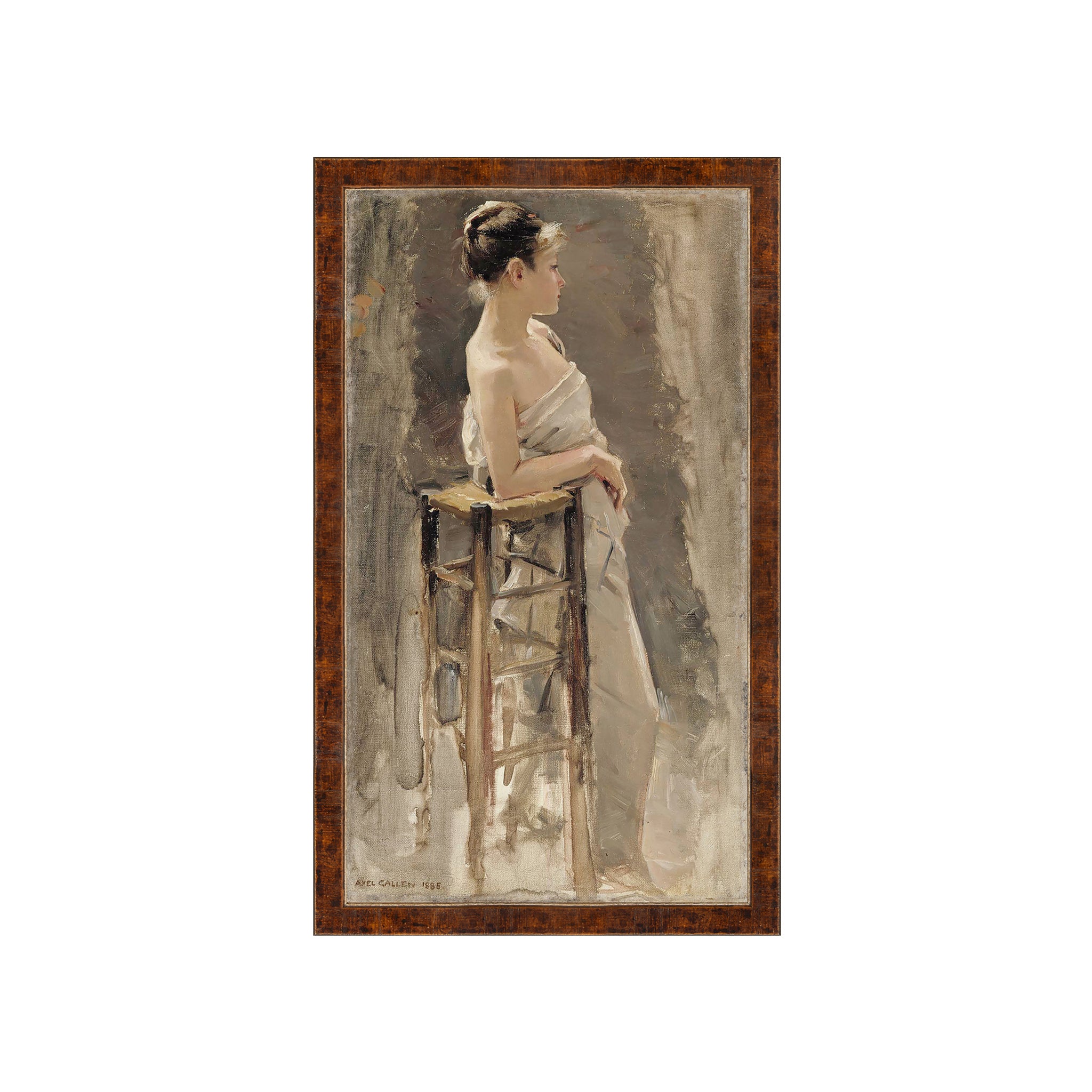 Clad in a classic toga and staring off into the distance, this stunning model study is painted in a traditional turn of the century style. Loose brushstrokes create an abstract and obscurred background while the subject leaning on a wood bench, is highlighted in the center ground. This petite artwork is the perfect piece to add a romantic, elegant vibe to your dining room, bedroom or living room, and when paired with other paintings from the collection, The Model truly shines.