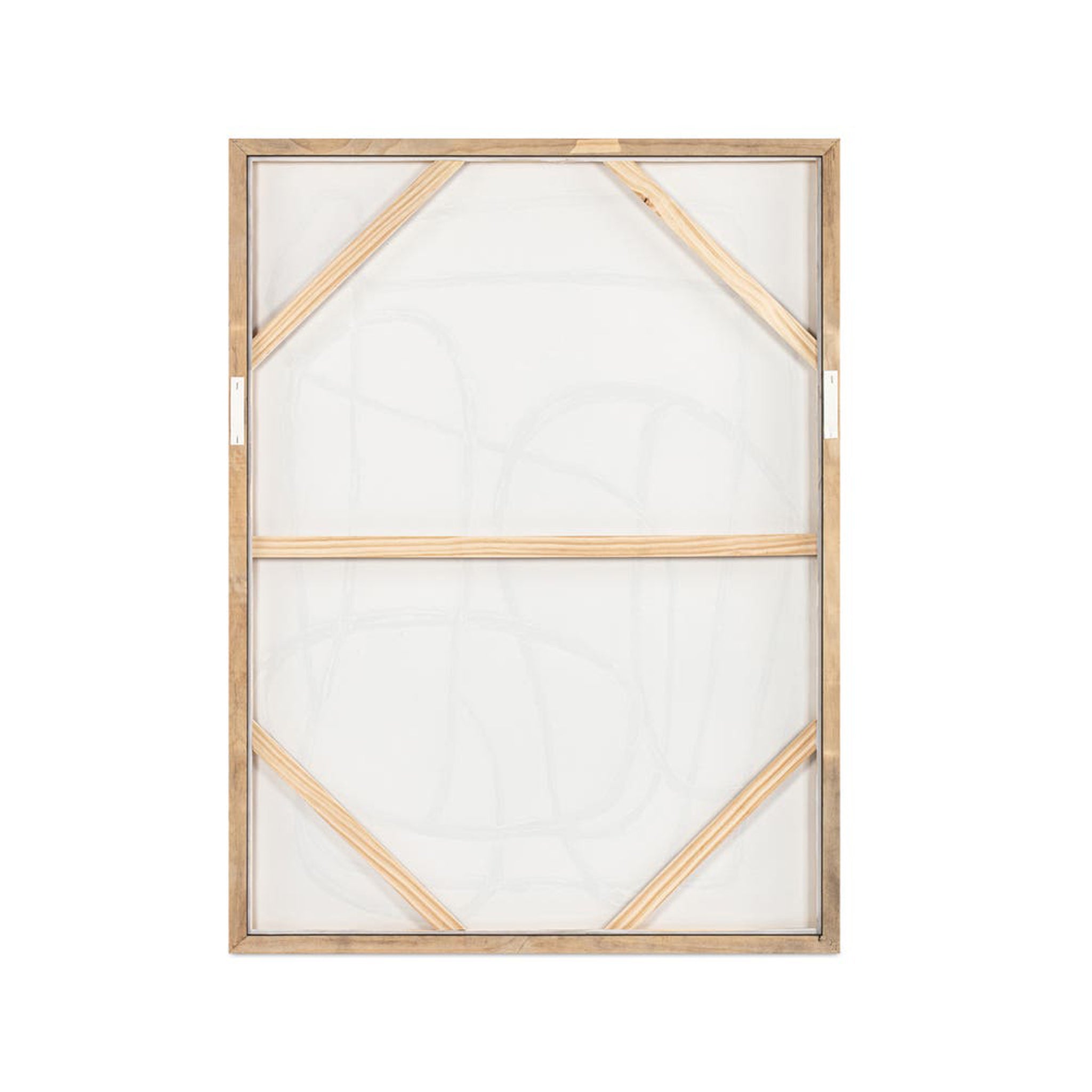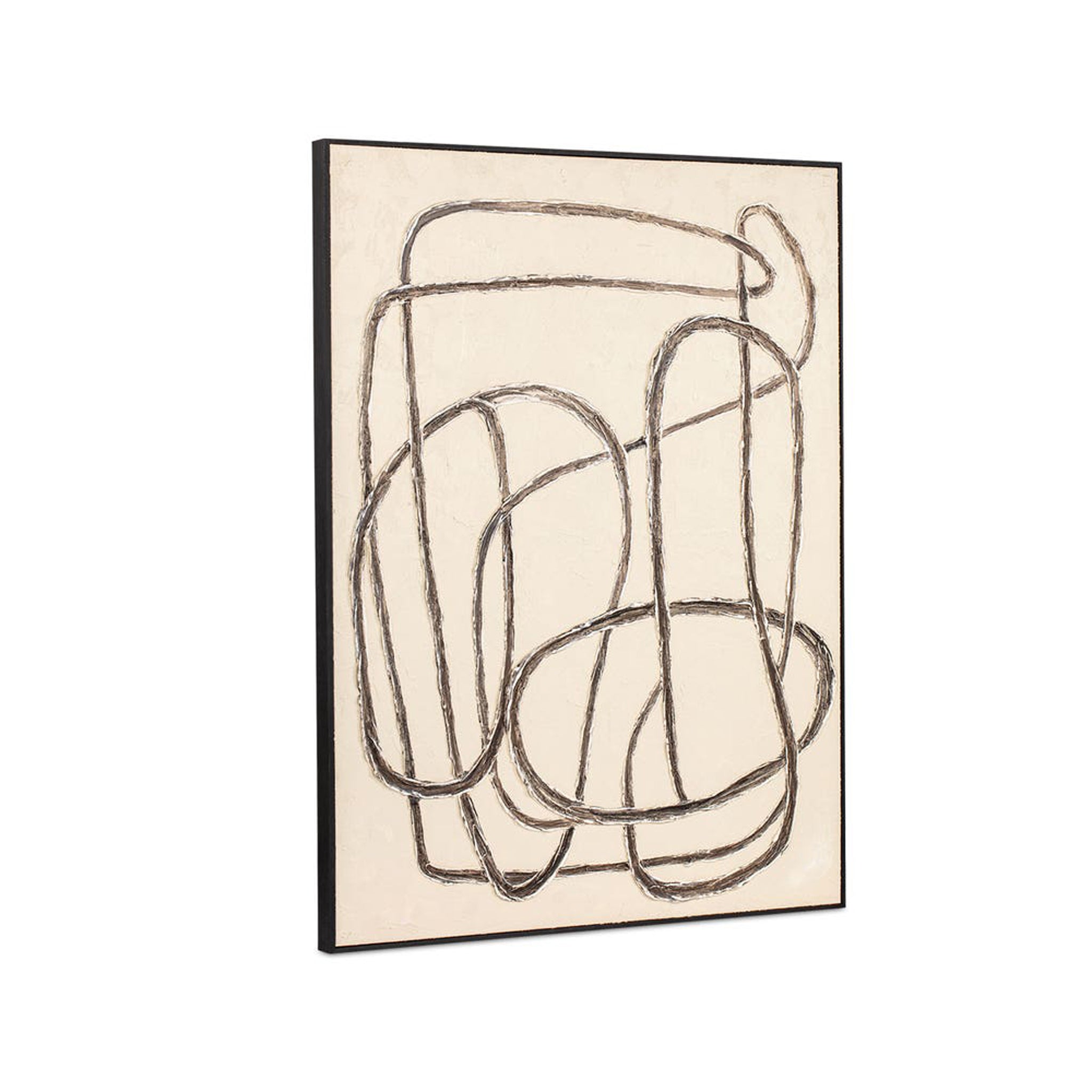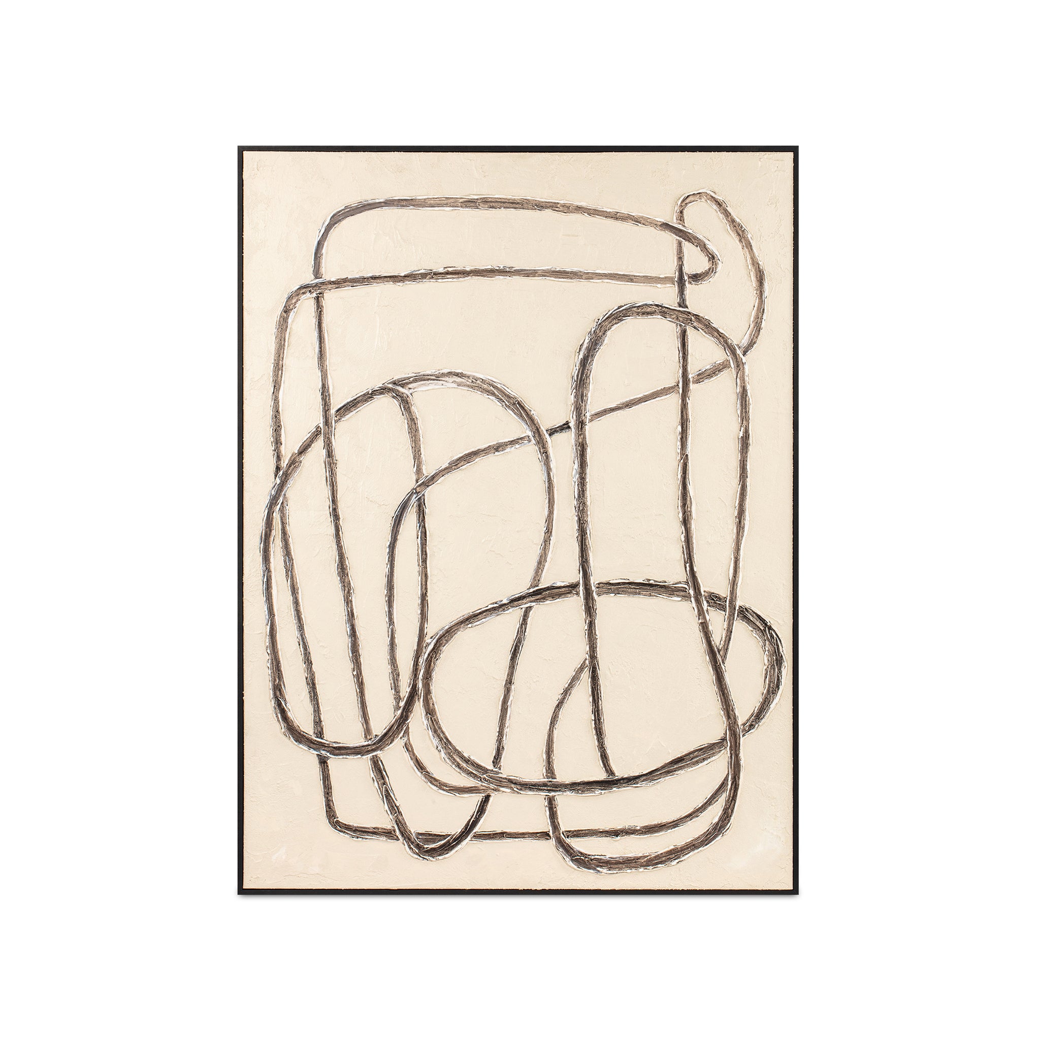 The Loops framed painting features a looping line that weaves over and under itself in a mesmerizing dance of self-interaction. Crafted with depth in mind, the line work is ingeniously integrated within the acrylic paint, creating a profound sense of dimensionality. At the same time, its neutral color palette ensures a seamless fit into transitional homes.