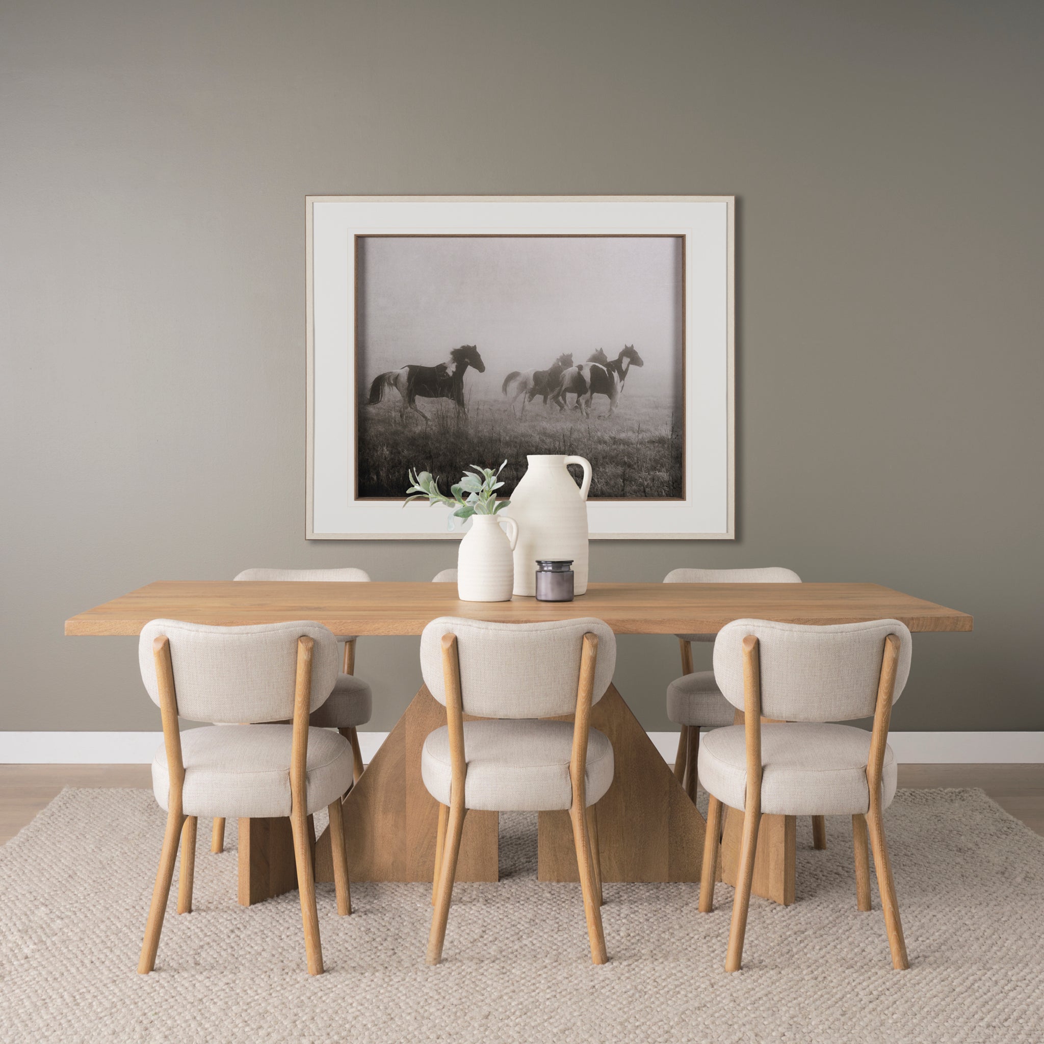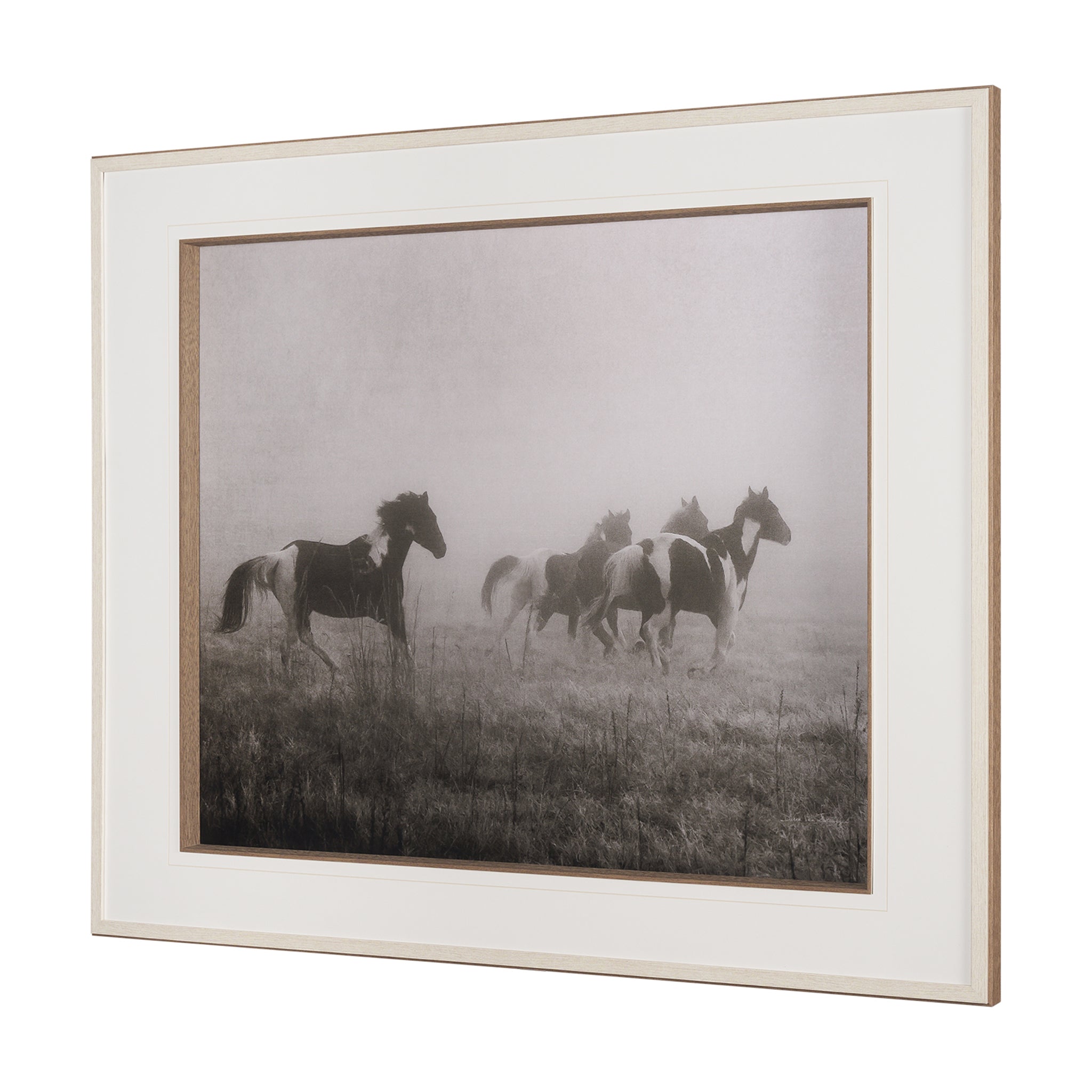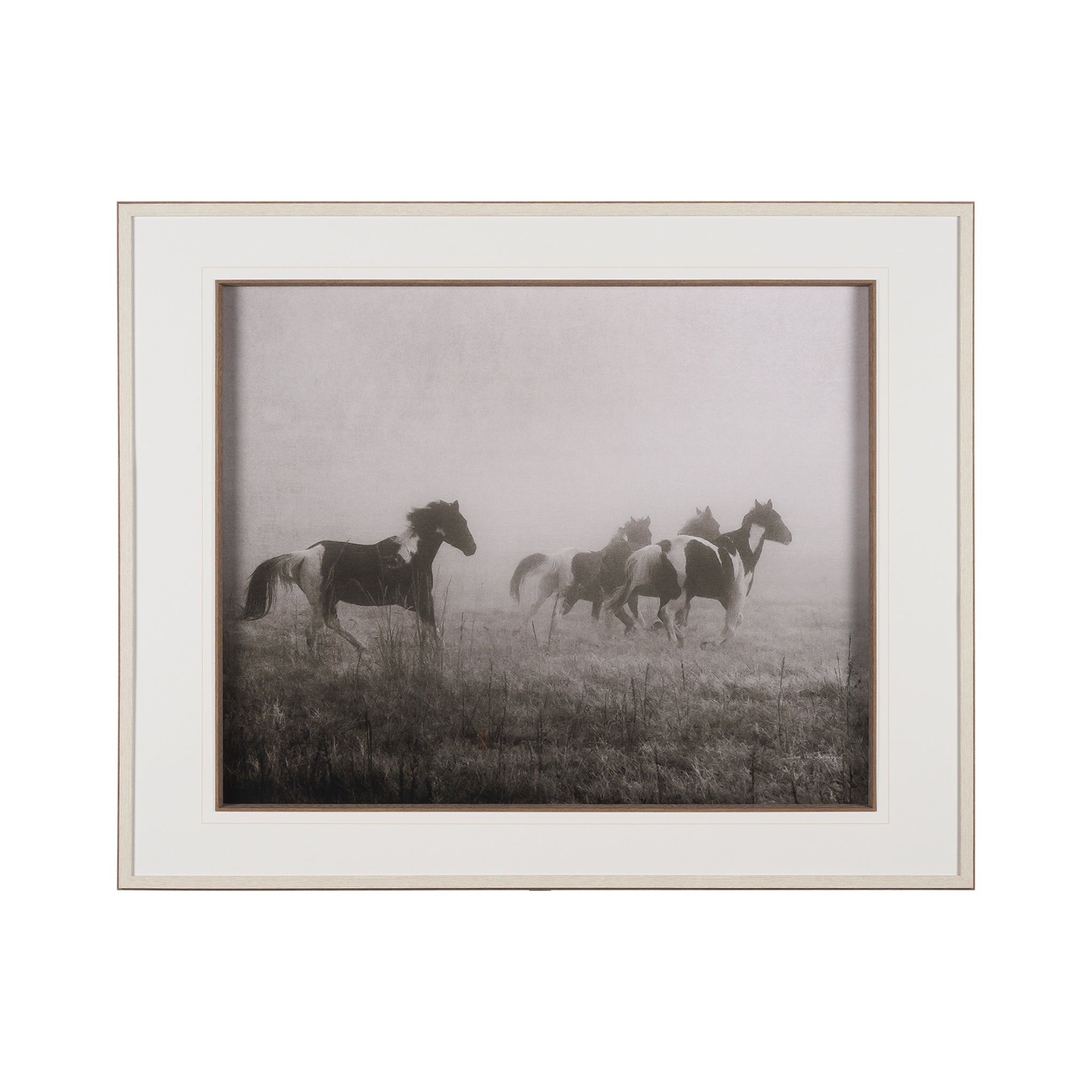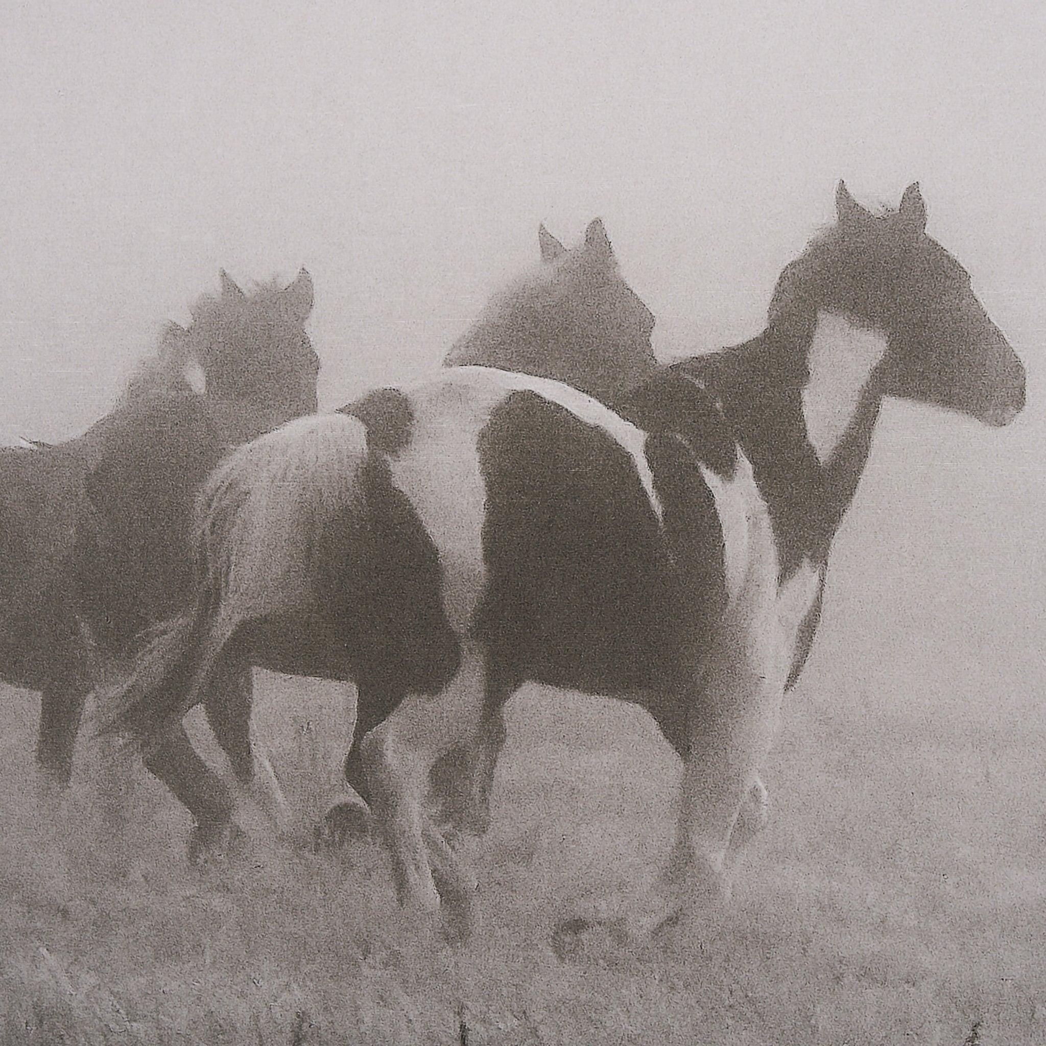 Capture the untamed spirit of the wild with this captivating framed artwork. Dynamic horses gallop through a dreamlike, misty landscape, their forms emerging from the haze in muted tones of sepia and grey. This evocative piece beautifully conveys a sense of freedom and ethereal movement, perfect for adding a majestic and soulful focal point to any living space or study.