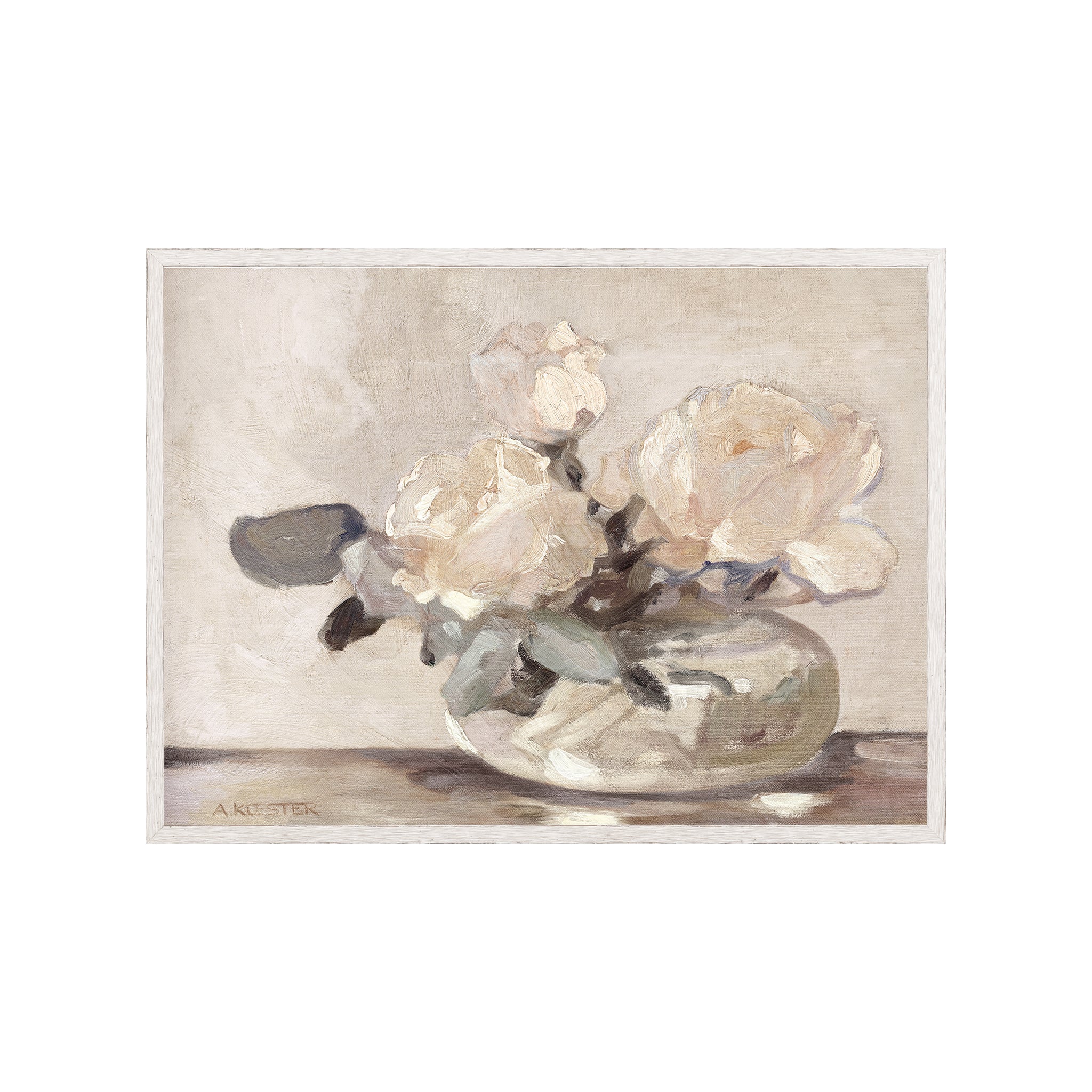 This 20th-century floral still life captures the delicate beauty of warm rose blooms arranged in a classic round vase. The artist's loose rendering suggests the graceful shapes and forms of the petals, creating a soft, dreamlike quality that invites quiet contemplation.