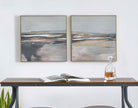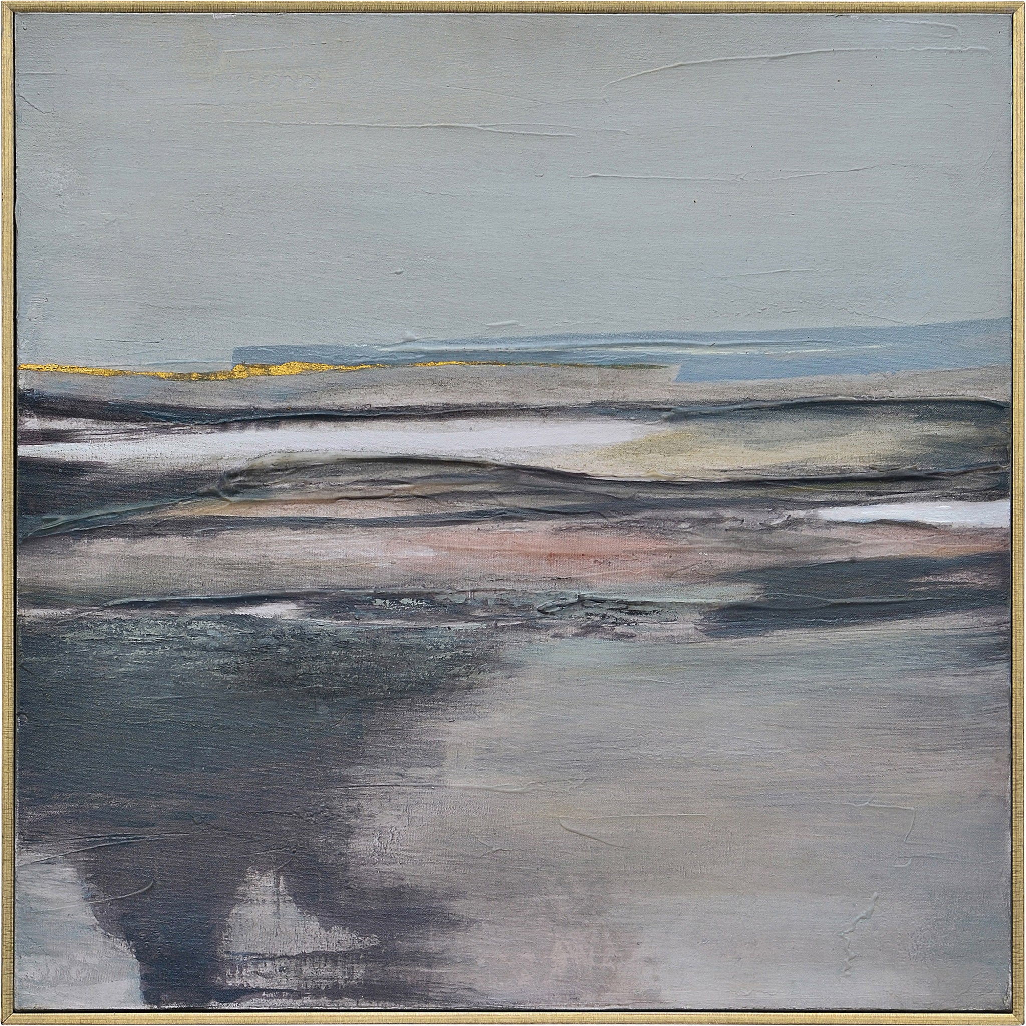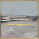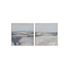 A set of two Cotton Canvas paintings allows for the classic interior to absorb the picturesque vision of a seaside landscape. A myriad of deep dark greys, soft pale blues, warm rosy tones, and gold leaf details, this work of art strikes the ideal balance of complexity and cohesiveness. Whether contrasted by bold dark paint tones or highlighted by stark white, it can't help but create the tone for the space.