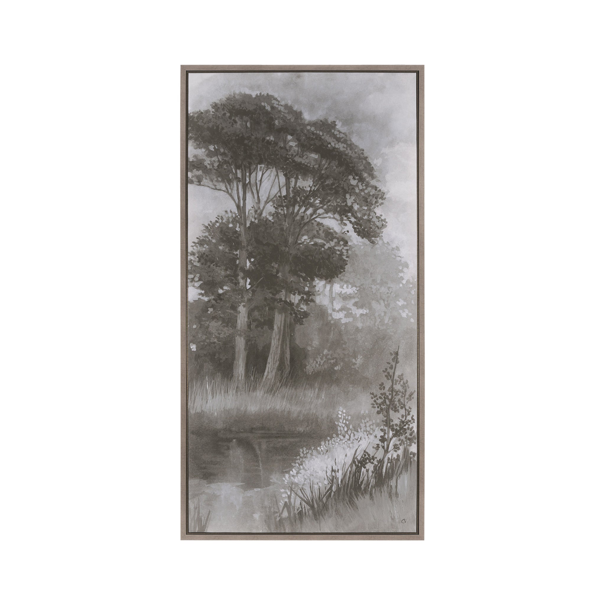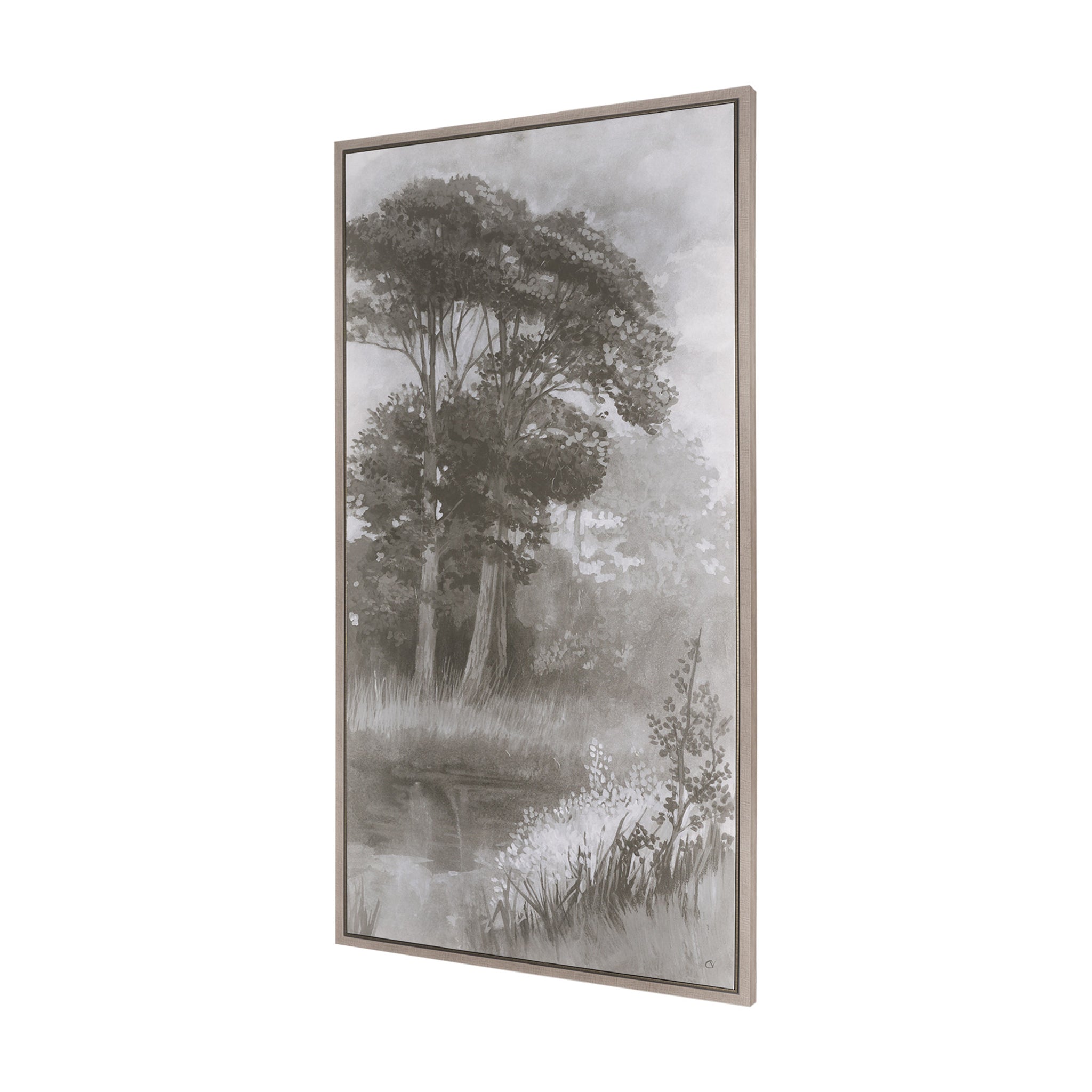Immerse your space in the tranquil beauty of nature with this captivating framed artwork. Rendered in timeless shades of grey, it depicts a serene forest scene where towering trees and lush foliage reflect softly upon still waters. This monochromatic piece brings a contemplative and sophisticated atmosphere, perfect for adding classic elegance and a sense of calm to any room