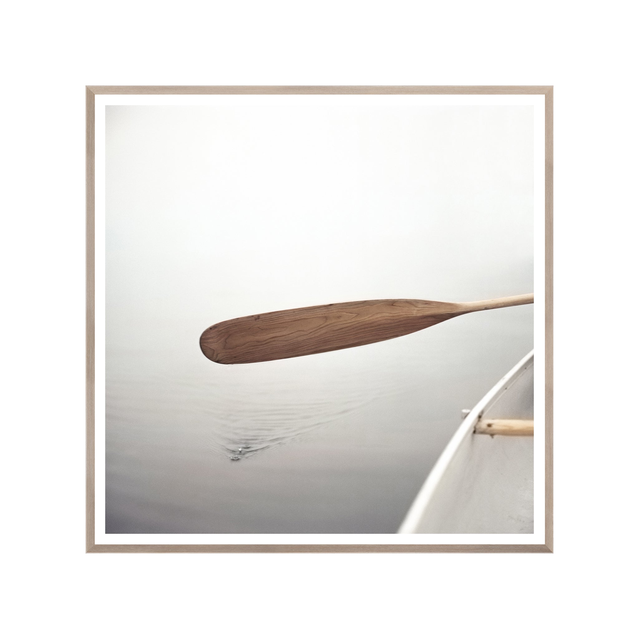 Captured from the heart of the lake, this serene photograph offers a tranquil view from a canoe. As water drips gently from the paddle, soft ripples expand across the glass-smooth surface, creating a delicate dance of motion and stillness.