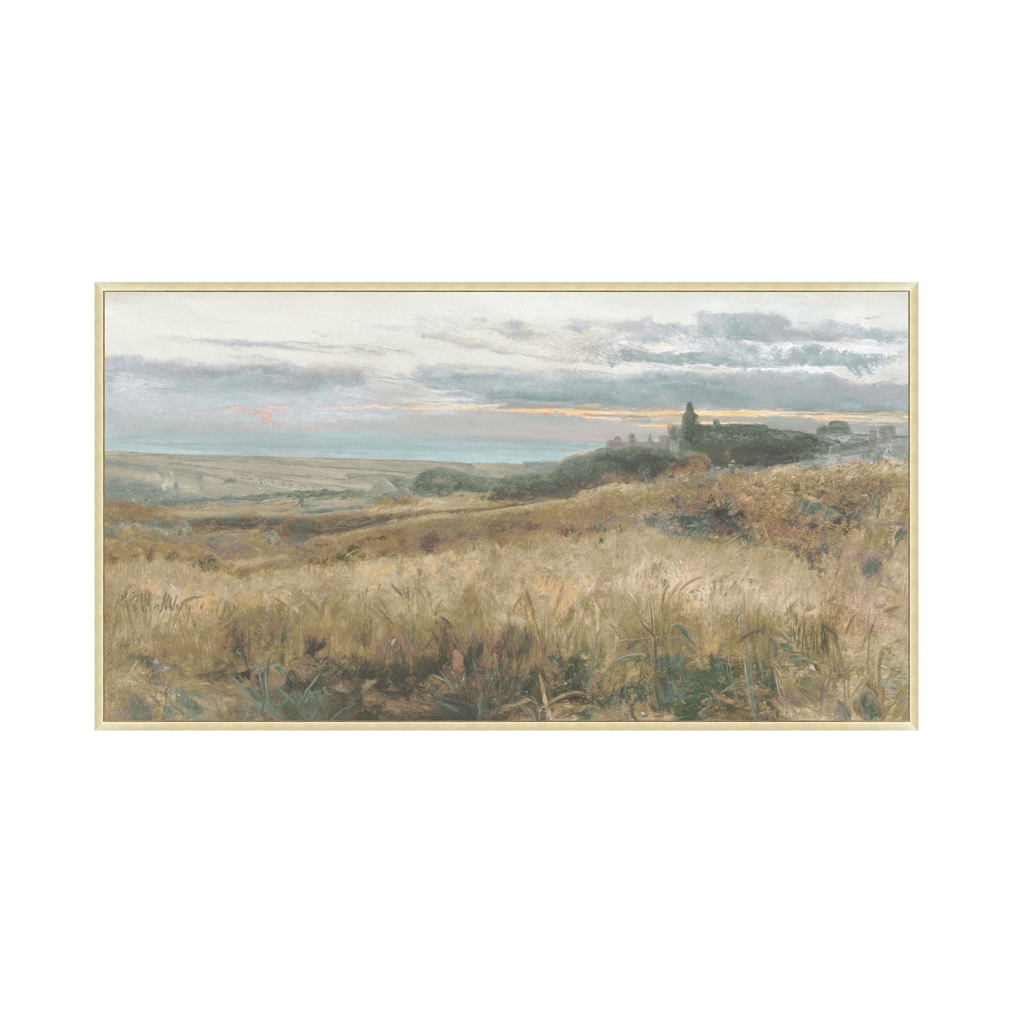 Sunset Fields is a calming work of art that transports you to the heart of a serene cornfield at twilight. Presented as a Giclée on Canvas, gallery wrapped, and artist enhanced. With its tall beige grasses swaying gently in the wind, adorned with subtle light green hues, Sunset Fields evokes a sense of serenity. The subtle sunset on the cloudy horizon adds a touch of warmth to the scene. Offset with a floating antique silver frame.