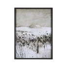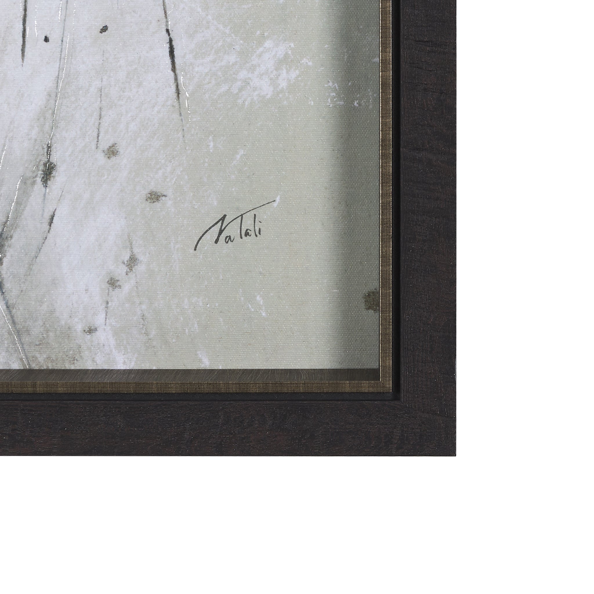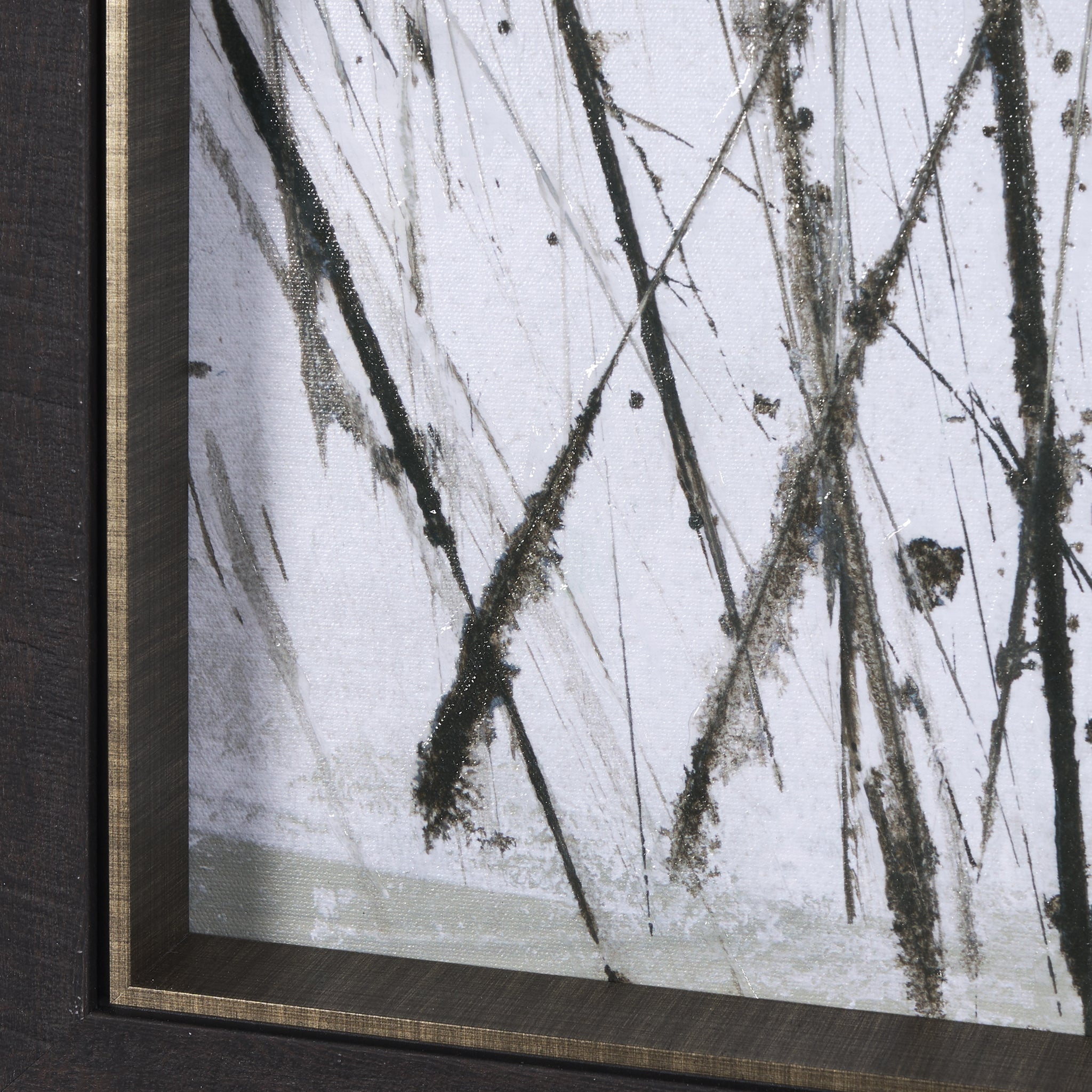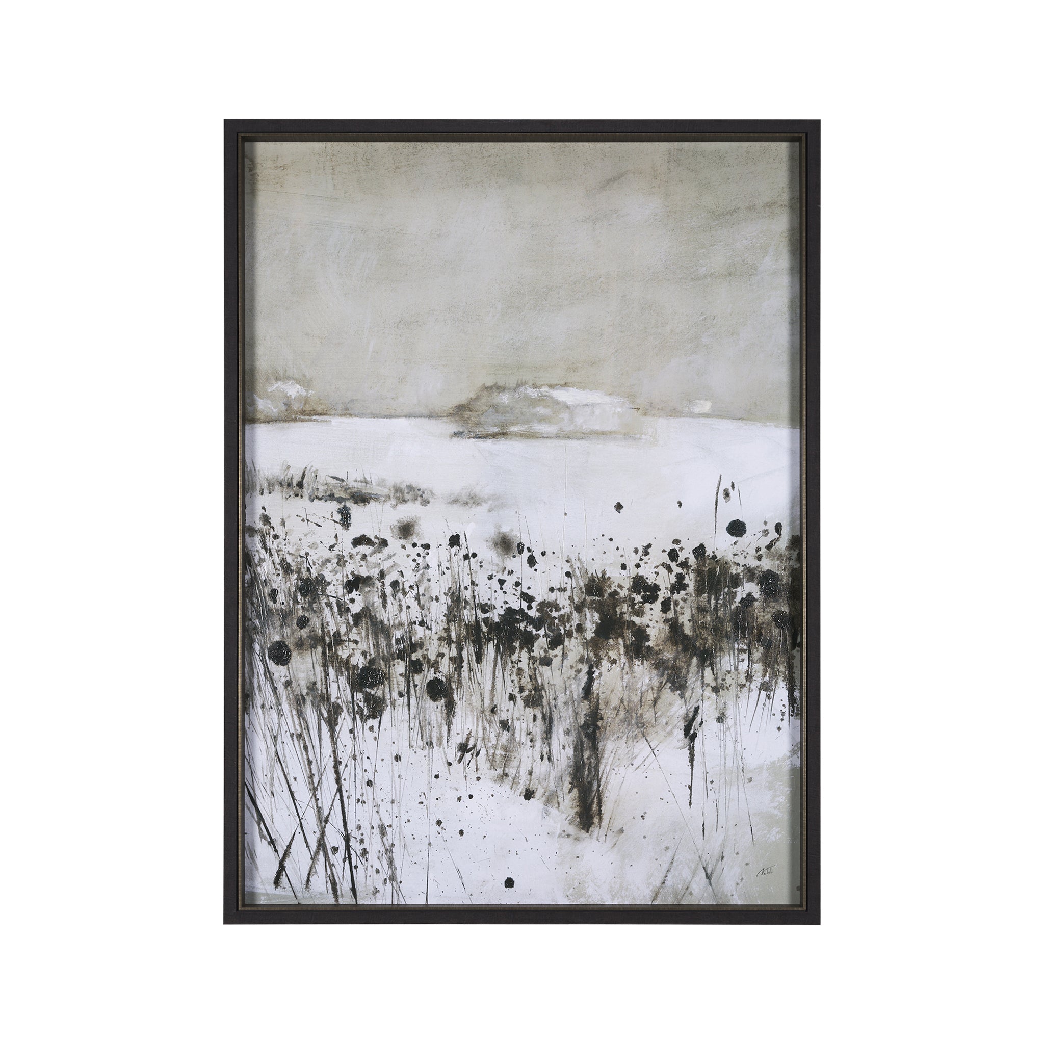 Introduce dramatic texture and serene starkness to your space with this captivating framed artwork. Bold black and dark brown strokes and splatters rise from a crisp white landscape, suggesting a windswept field or a frozen marsh beneath a muted sky. This abstract piece offers a powerful yet contemplative statement, perfect for contemporary interiors seeking a touch of natural drama and unique artistic expression.