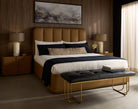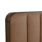 With its super plush design, the Lopas bed is as soft as it is inviting. Upholstered in milliken cognac faux leather with channel tufting on the extra thick headboard. A brown solid oak wood frame beautifully complements the look.