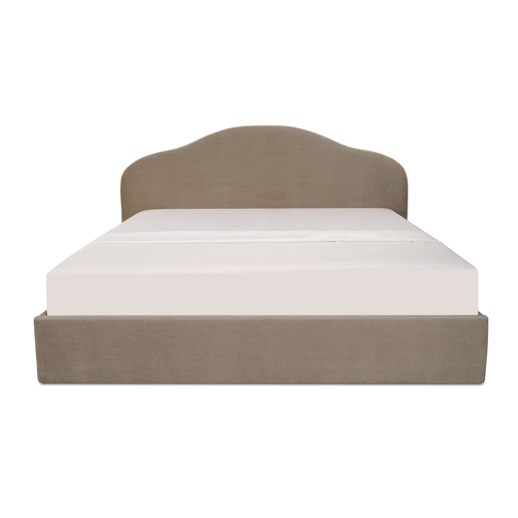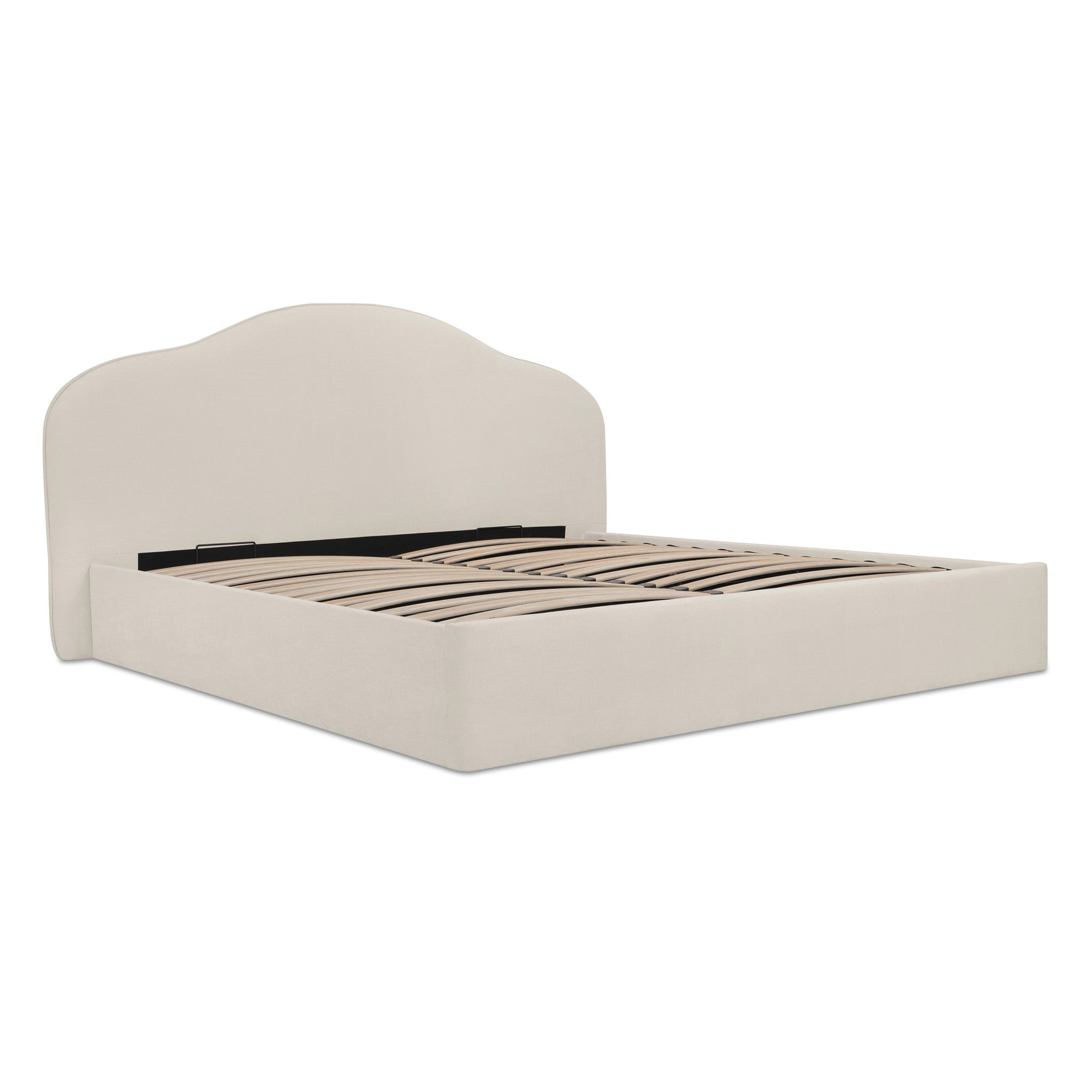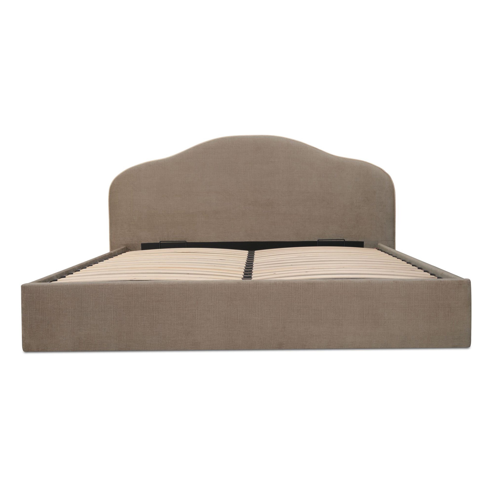 A softer take on tradition. The Maggie Bed reimagines a classic arched headboard with a tapered silhouette and contrasting twisted trim for subtle detail. Upholstered in polyester, the rounded footboard mirrors the headboard's softness for balance. Beneath the mattress, a hydraulic lift reveals hidden storage, showing how timeless curves can deliver everyday practicality.