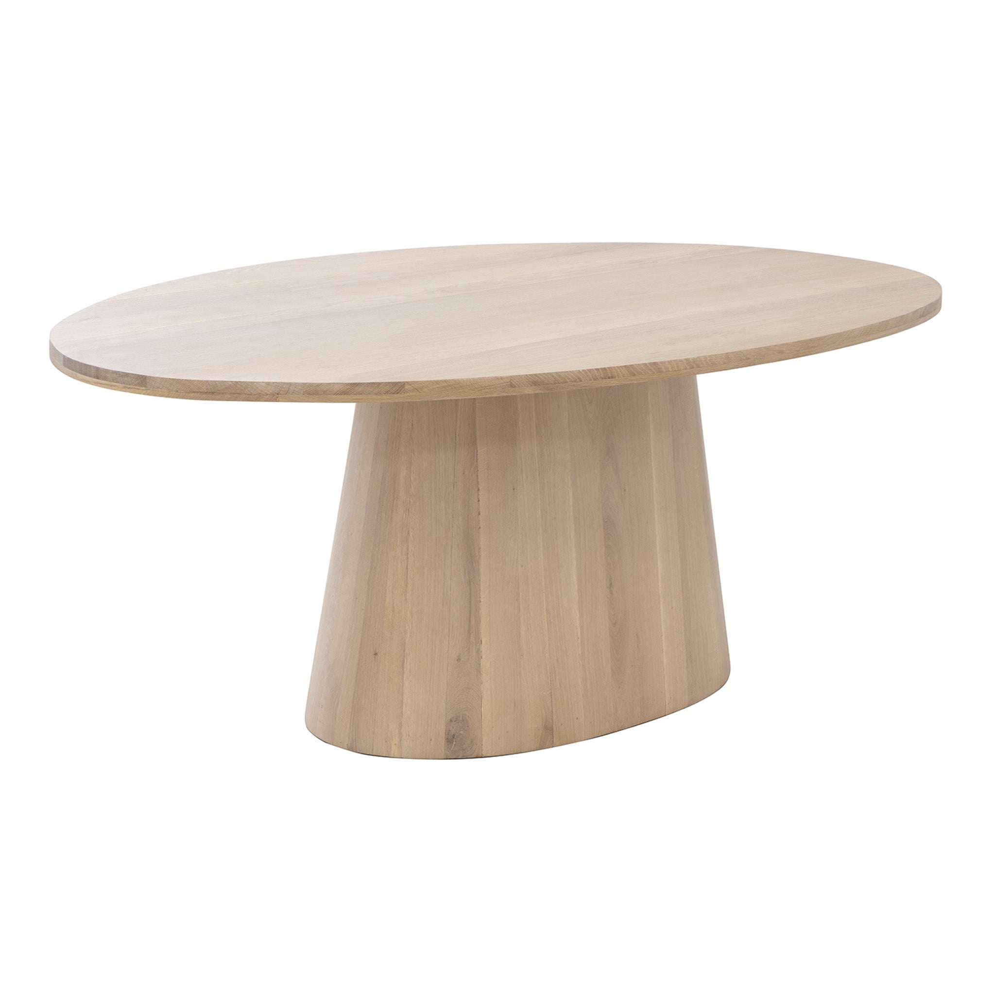 A classic oval dining table that takes inspiration from modern mid-century design for a tasteful addition to any dining space. Made from natural solid oak wood with a whitewash finish. As wood is an organic, porous material, these pieces will contain natural variation of texture and may also exhibit fine indentations and cracks. Wood pieces will also display a disparity of colour and grain, and visible knots and burls that add to the character of each piece. Made in India. With refined craftsmanship, this design was brought to life by skilled local artisans. Due to the nature of handcraftsmanship, unique imperfections such as fissures, markings and variations in colour and shape are welcomed and appreciated characteristics for a truly one-of-a-kind piece.