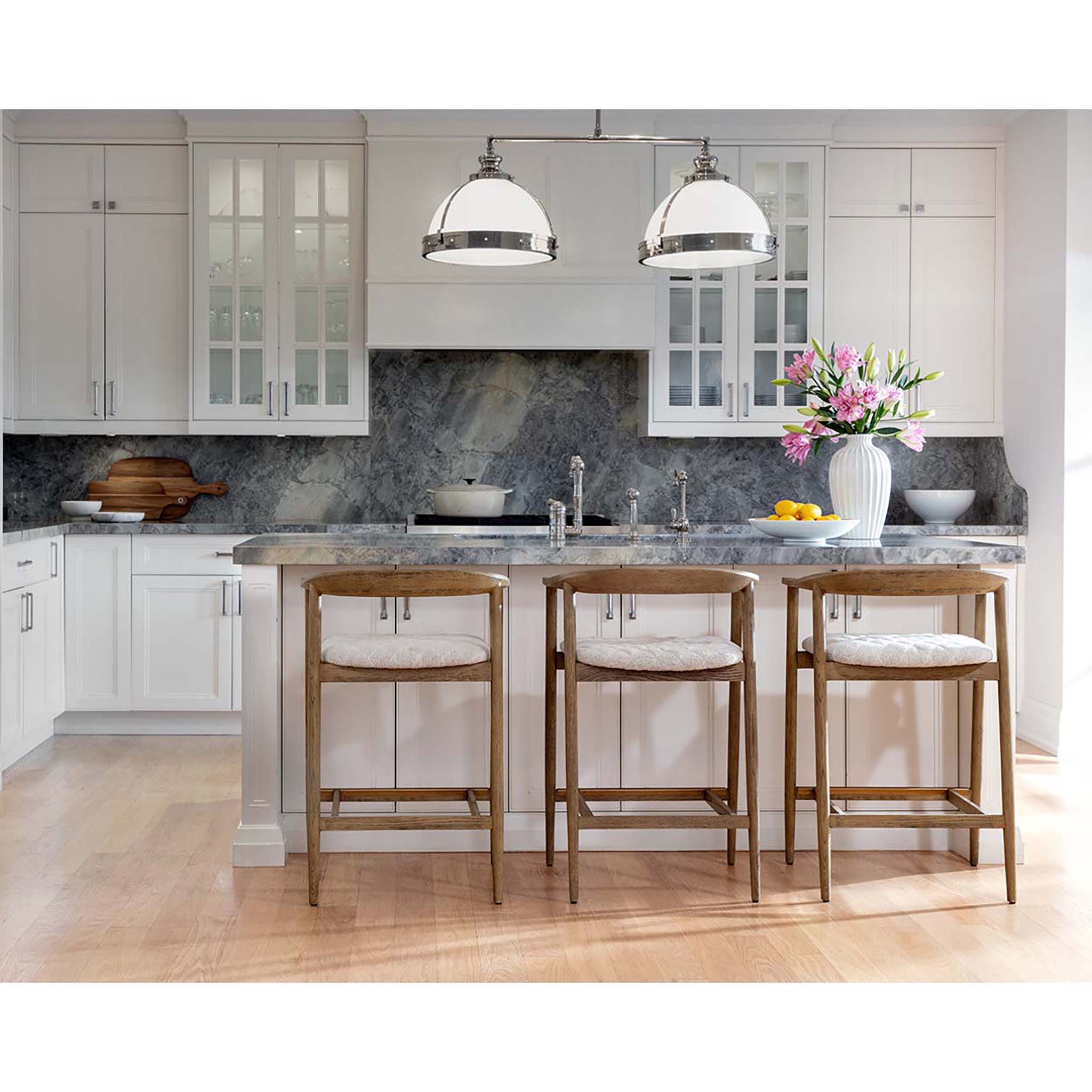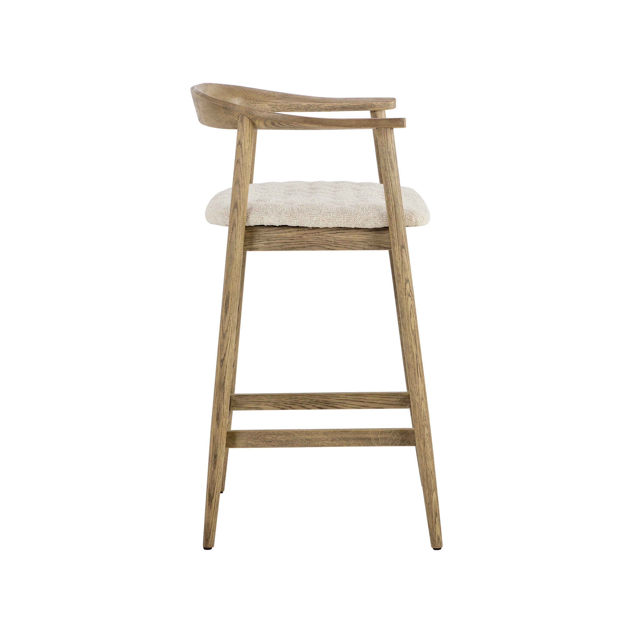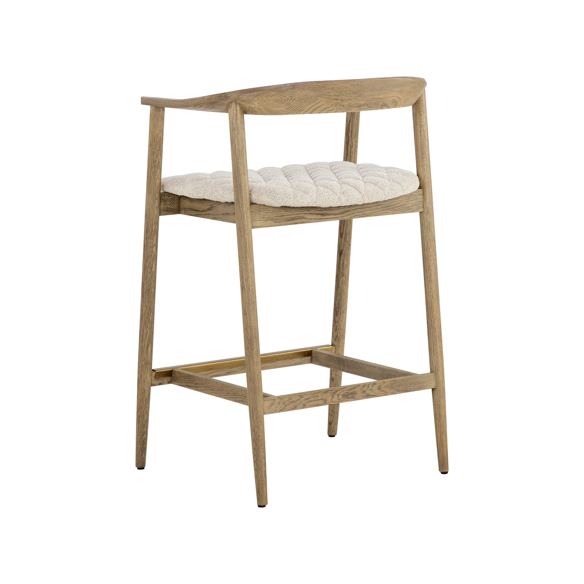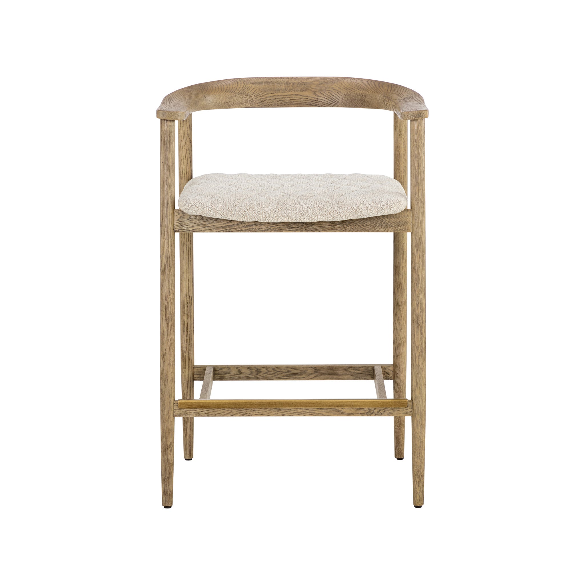 An alluring mid-century counter stool that embraces the beauty of simplicity. Features a comfortable, quilted cushion in dove cream fabric. Completed with a brown, weathered solid oak wood frame and a powder-coated metal footrest in an antique brass finish. As wood is an organic, porous material, these pieces will contain natural variation of texture and may also exhibit fine indentations and cracks. Wood pieces will also display a disparity of colour and grain, and visible knots and burls that add to the character of each piece.