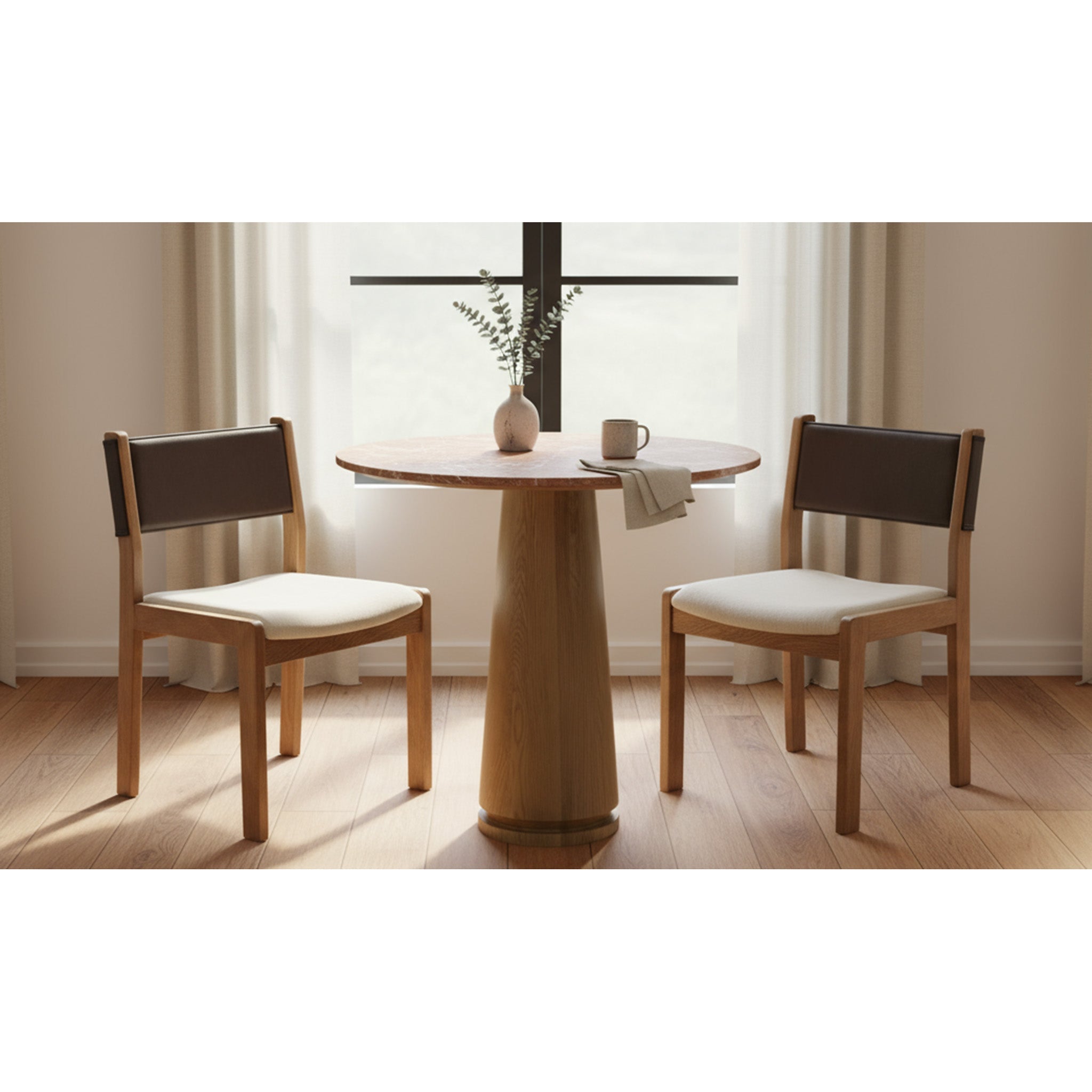 The chair that brings ease to the table. Carol pairs a rounded oak frame with a fabric seat and a top-grain leather back. A carved-back detail highlights craftsmanship, while the stretcher-free base keeps the profile clean. Built for comfort and longevity, Carol brings a grounded, inviting presence to any dining space-clean, modern, and ready to settle in.