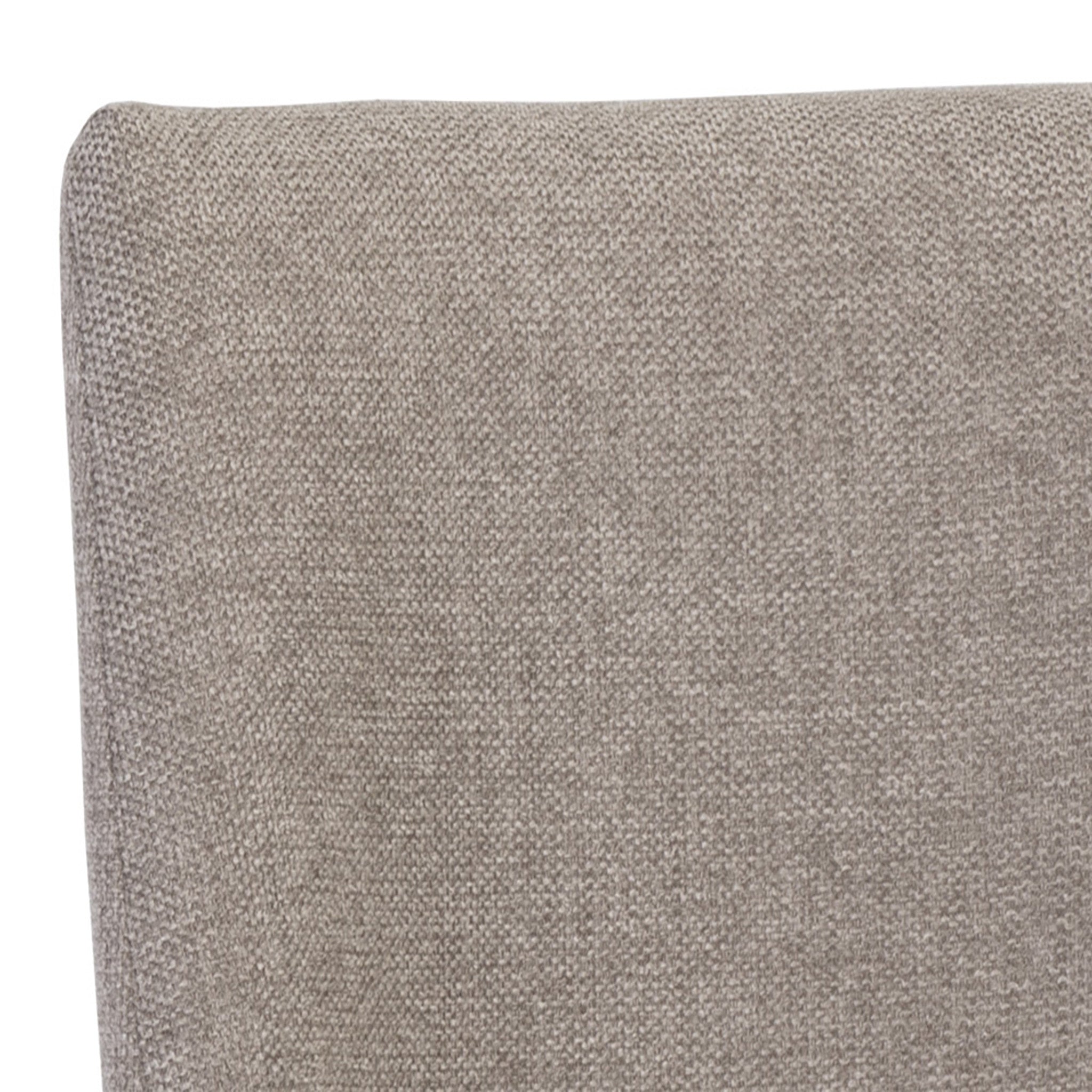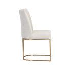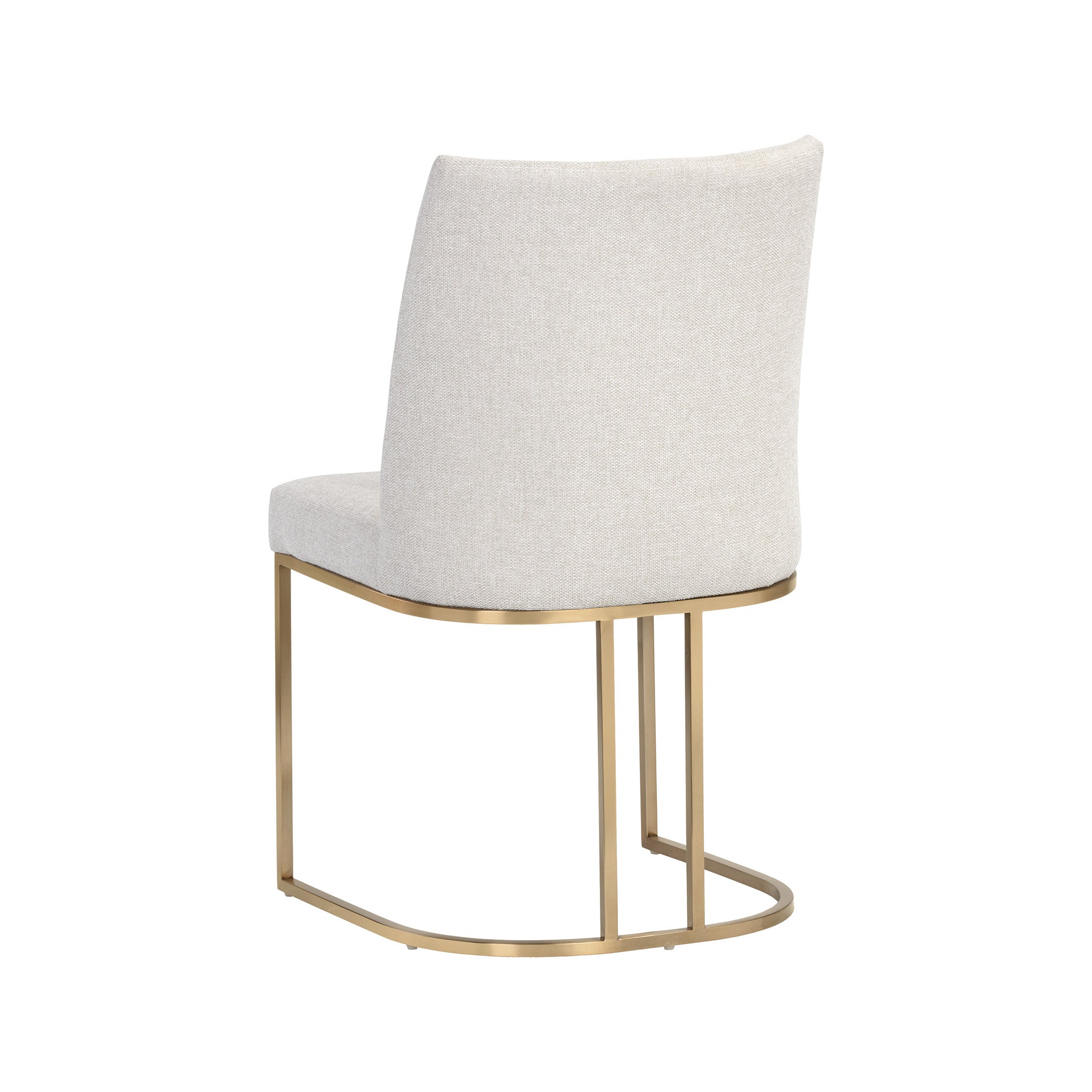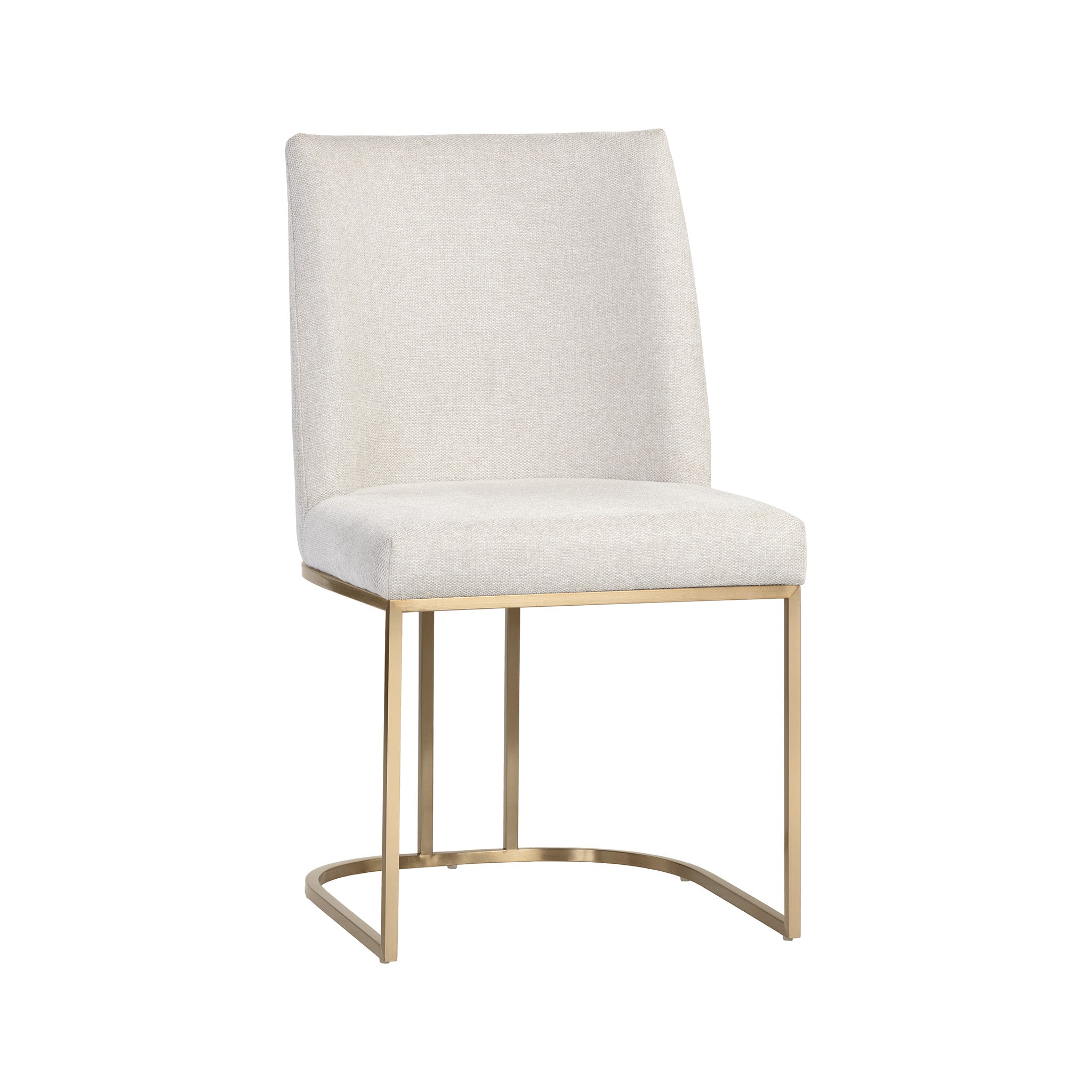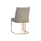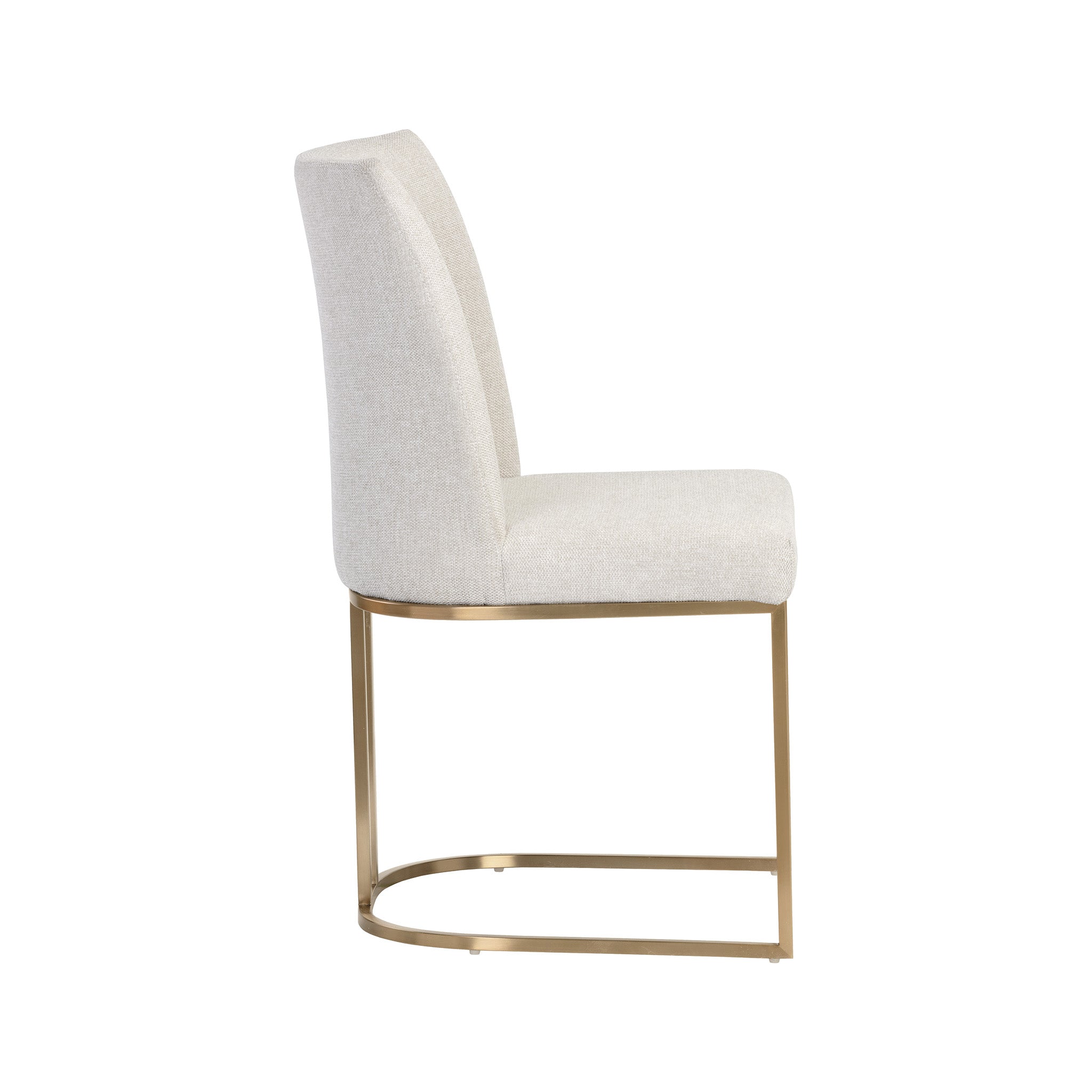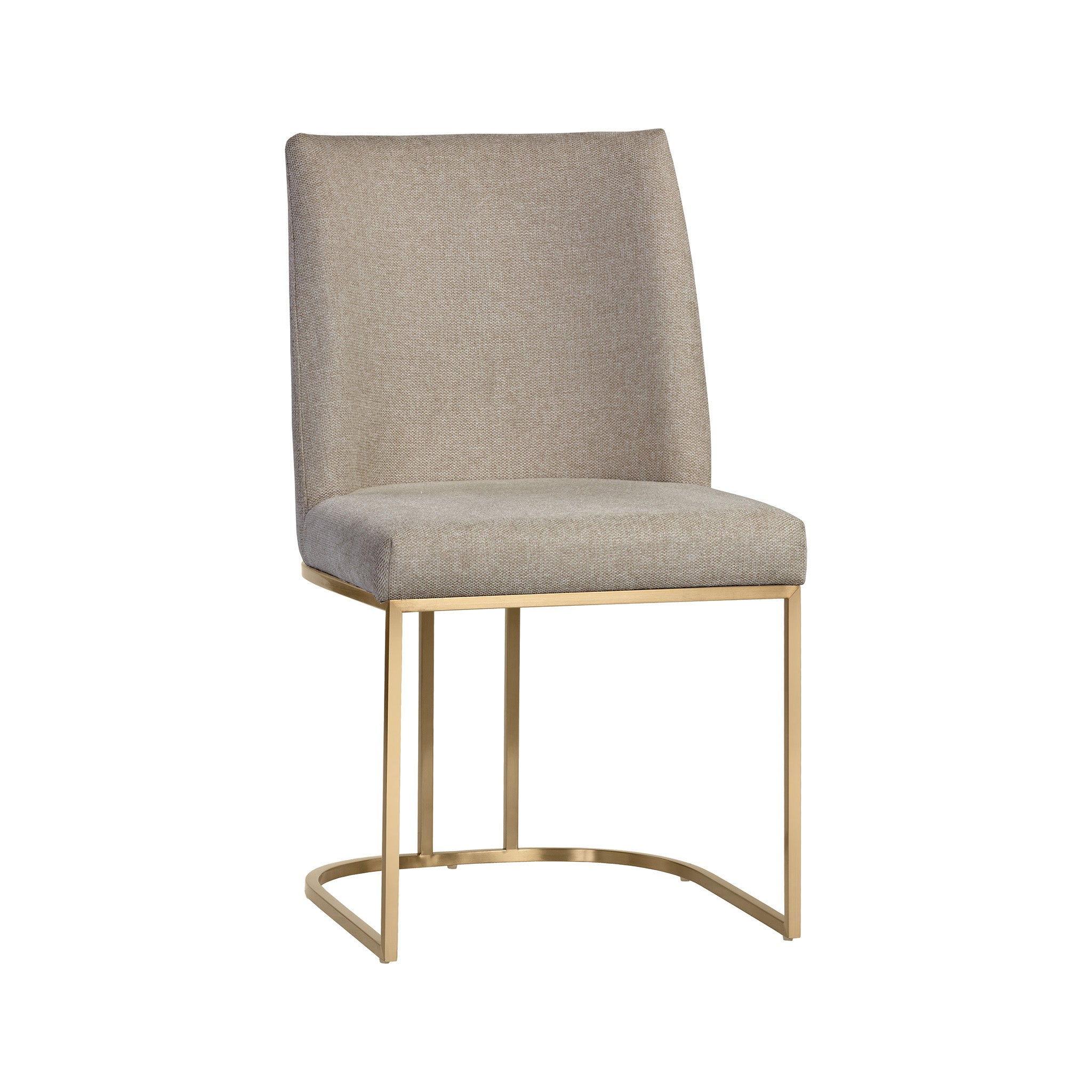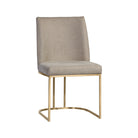 An elegant cantilever dining chair designed with soft, textured belfast fabric and an exposed antique brass stainless steel frame.
