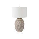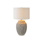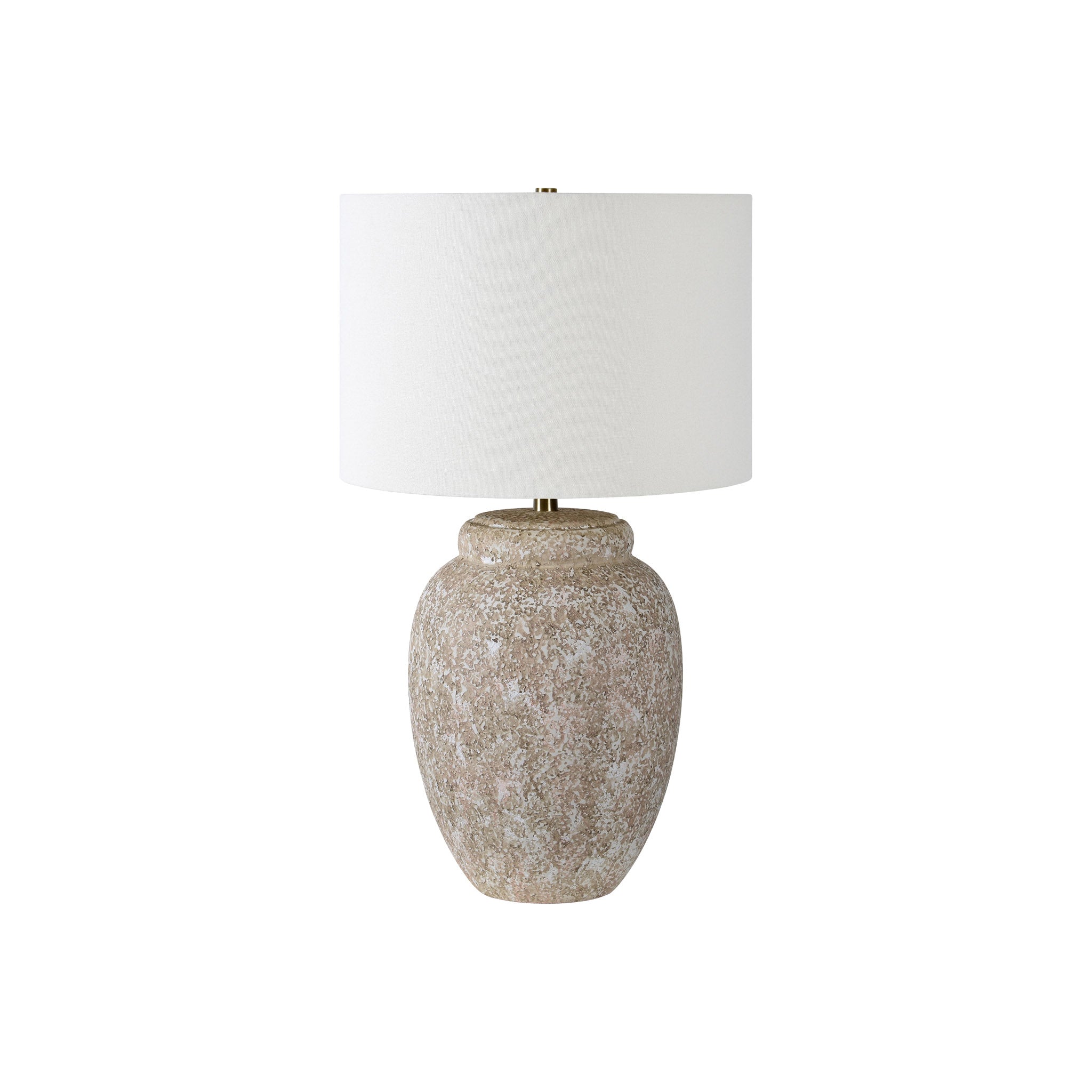 The creativity and inherent charm of this table lamp's painted ceramic base stands out in the traditional home interior. It is perfectly sized for end table or night stand arrangement. The plated antique brass metal elements and off-white linen drum-shaped shade, bring a crisp quality that is pleasing to the eye on every occasion.