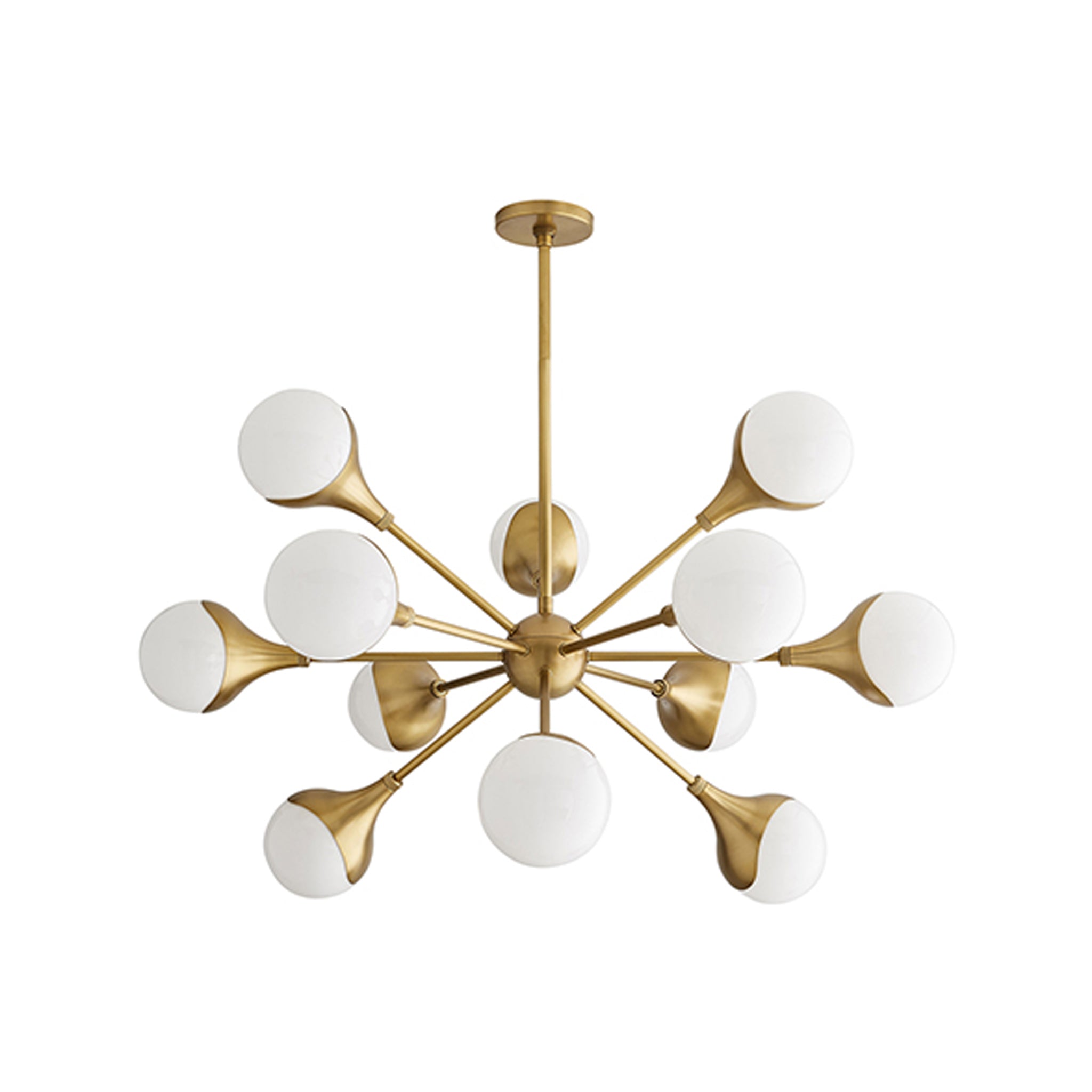Balancing opal glass globes against an antique brass foundation, this chandelier boasts a traditional sputnik design that is more organic in form. Twelve steel arms spider out from a central sphere to cradle the glass globes and to showcase their spherical shape. A subtly sophisticated and strikingly stylish foundational piece for a modern design scheme.