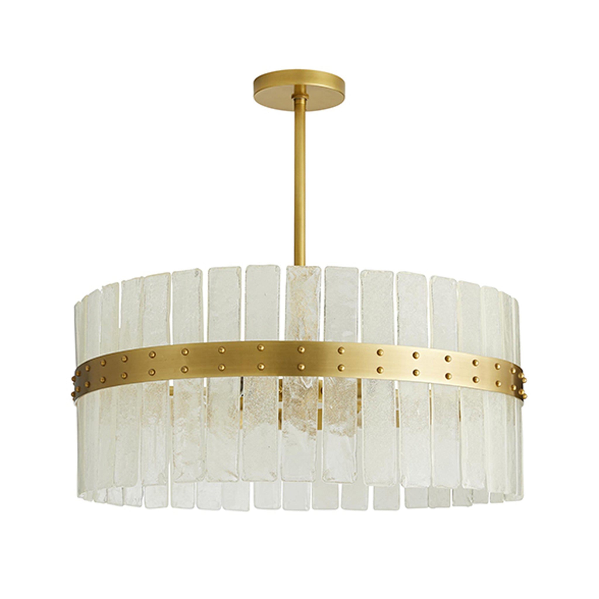 This timeless chandelier has a beauty all its own. Constructed of over twenty panels of organic seeded glass, each is formed by hand, so they will feature their own individual forms and natural edges. The outer steel band shines in an antique brass finish, with rivet details that offer an unexpected edge to the refined aesthetic.
