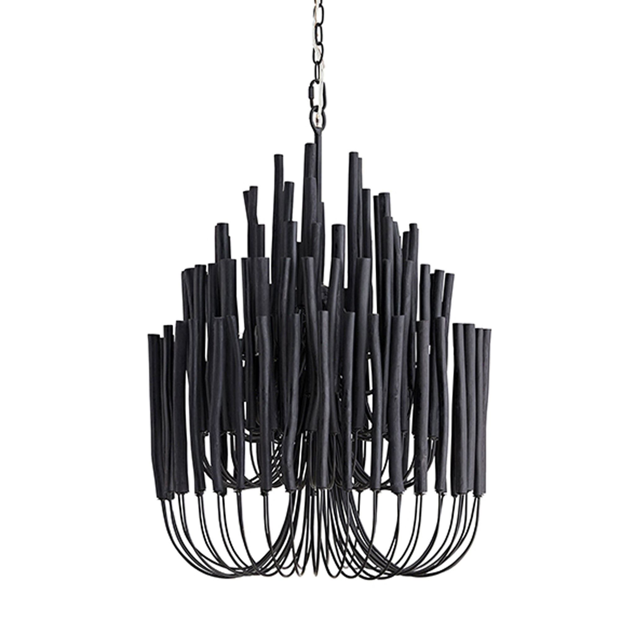This rustically refined chandelier instantly transforms a space. The multi-tiered form features wooden dowels, finished in black, on curved and pliable iron arms. during installation, please ensure that all bulbs are not touching the dowels. If they are, gently press the arm one inch away from bulb to allow heat to properly disperse. Additional chain available (chn-242). Finish will vary. Due to the organic nature of the wood used to create this piece, each piece will vary in size and shape. the wooden sticks will eventually crack and is an inherent feature of solid wood of this proportion.