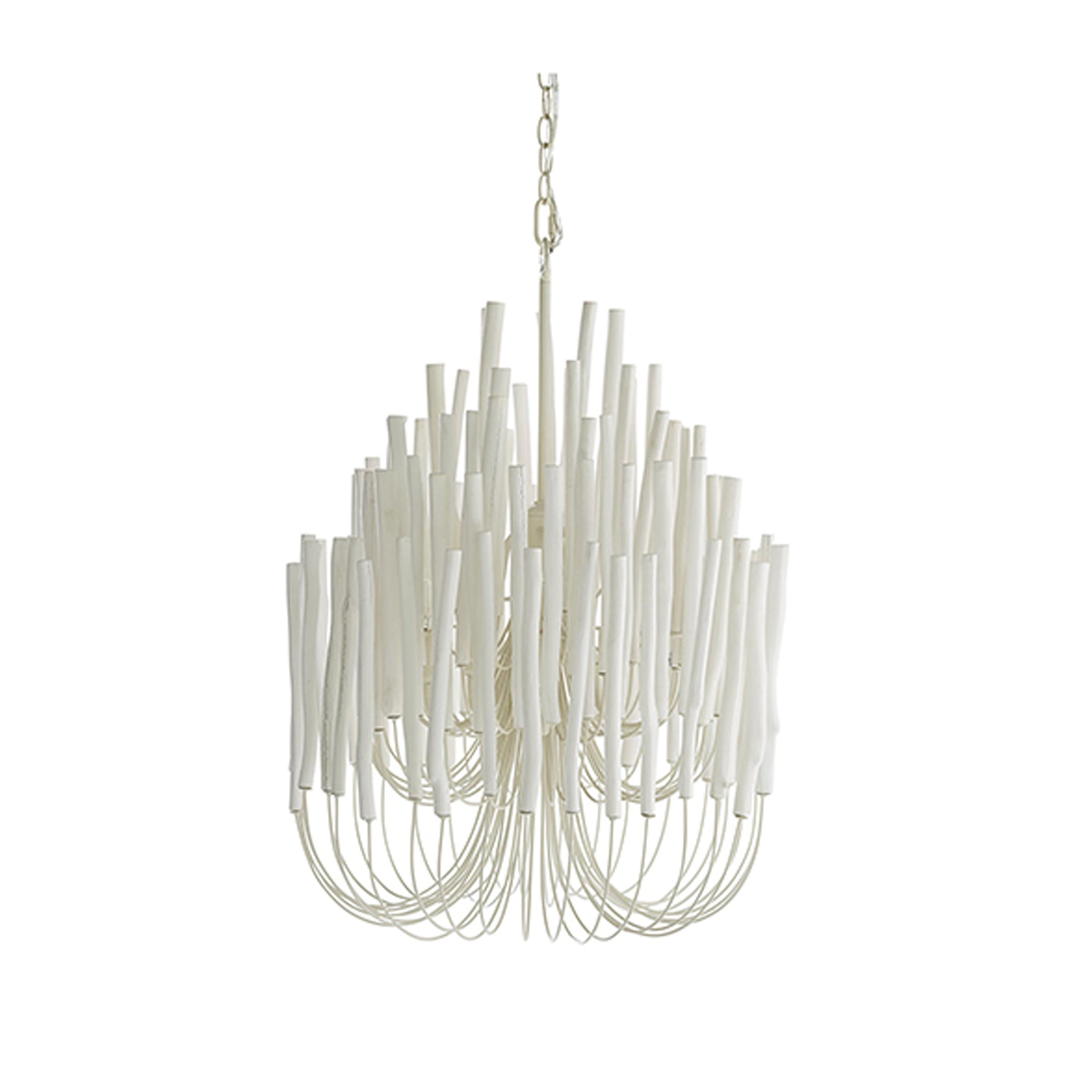 The Tilda 5-light chandelier has five tiers of wooden sticks on curved iron arms, all in a whitewash finish. the wooden dowels are placed atop pliable arms. During installation, please ensure that all bulbs are not touching any of the wooden dowels. If they are, gently press the arm away from the bulb about an inch to allow heat to properly disperse. Due to the organic nature of the wood used to create this piece, each piece will vary in size and shape. The wooden sticks will eventually crack and is an inherent feature of solid wood of this proportion.