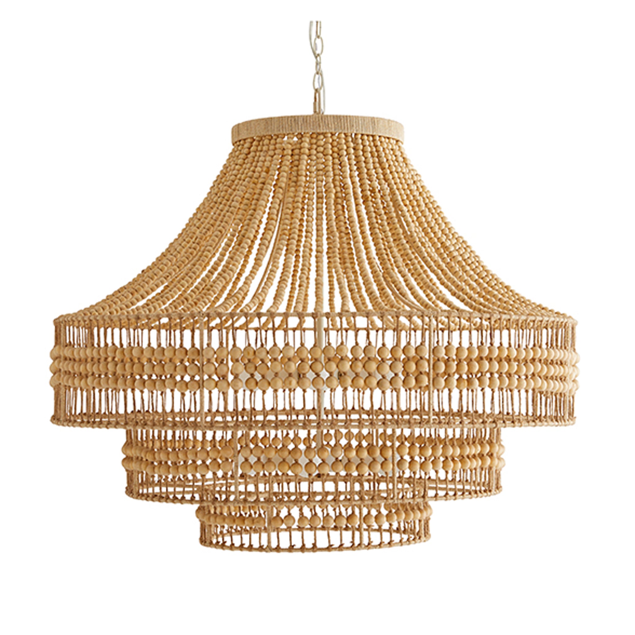 A twist on the traditional Tulane chandelier, the tremblay establishes a strong presence while remaining light and airy. The tiered construction is crafted from hand-cut wooden beads strung along an abaca-wrapped frame, delivering a rustic element to its feminine form. The large-scale, open-form structure allows light to cascade down each layer and brilliantly light up its surroundings. due to the handmade nature, slight variances may occur.