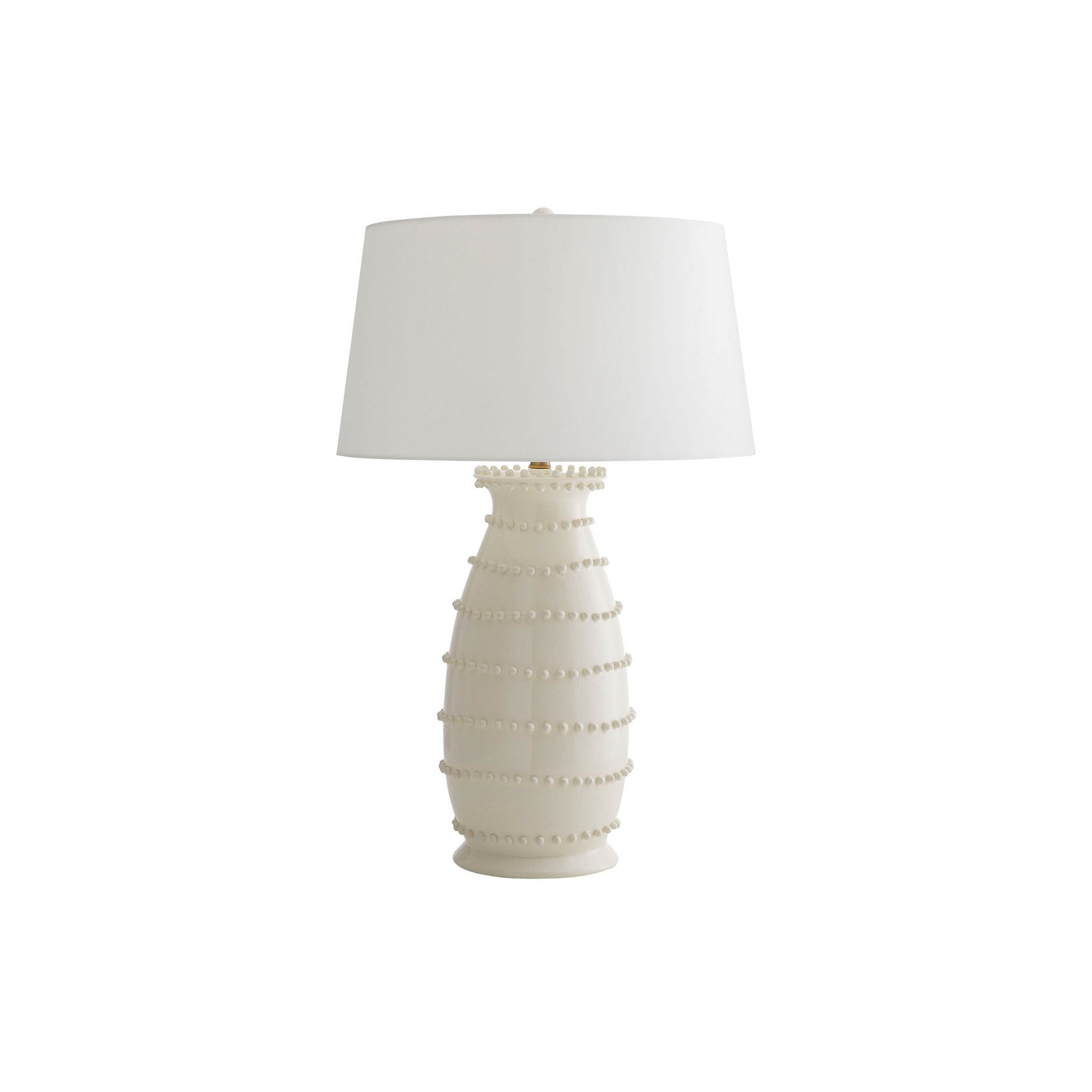This elegant ivory crackled ceramic table lamp is accented with hand-applied soft beaded bumps. topped with a matching ceramic finial and an off-white microfiber shade lined in matching off-white cotton for a subtle glow. finish will vary.