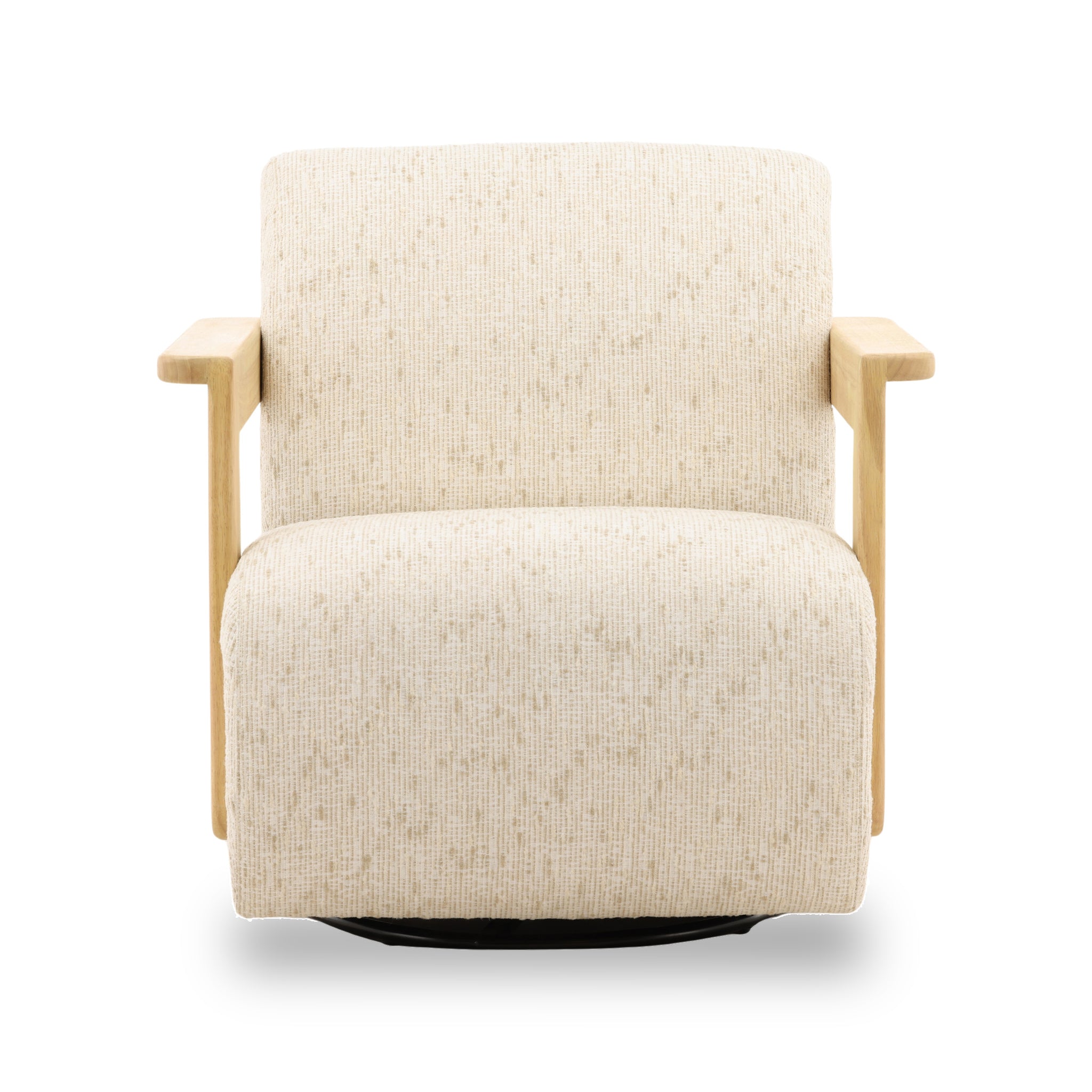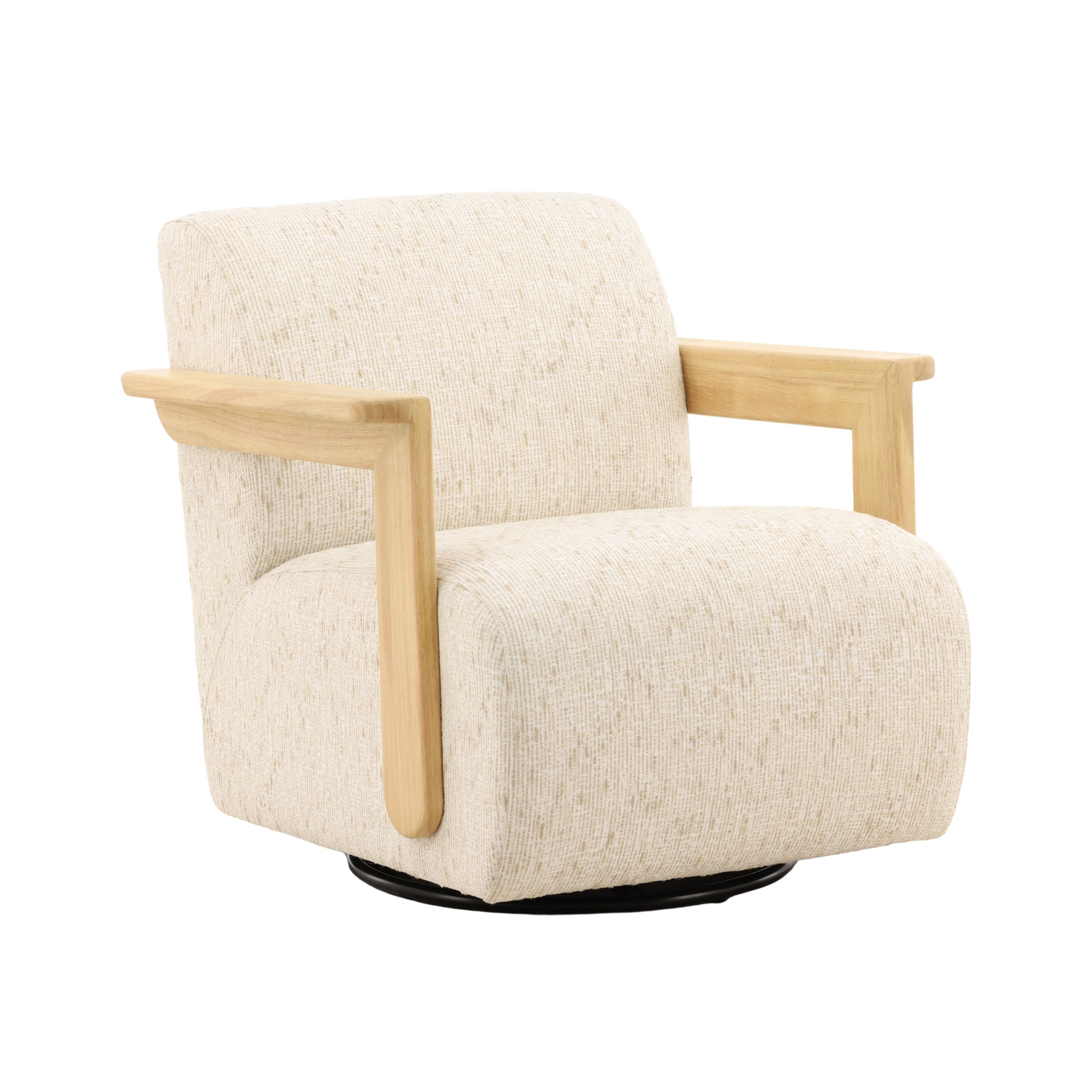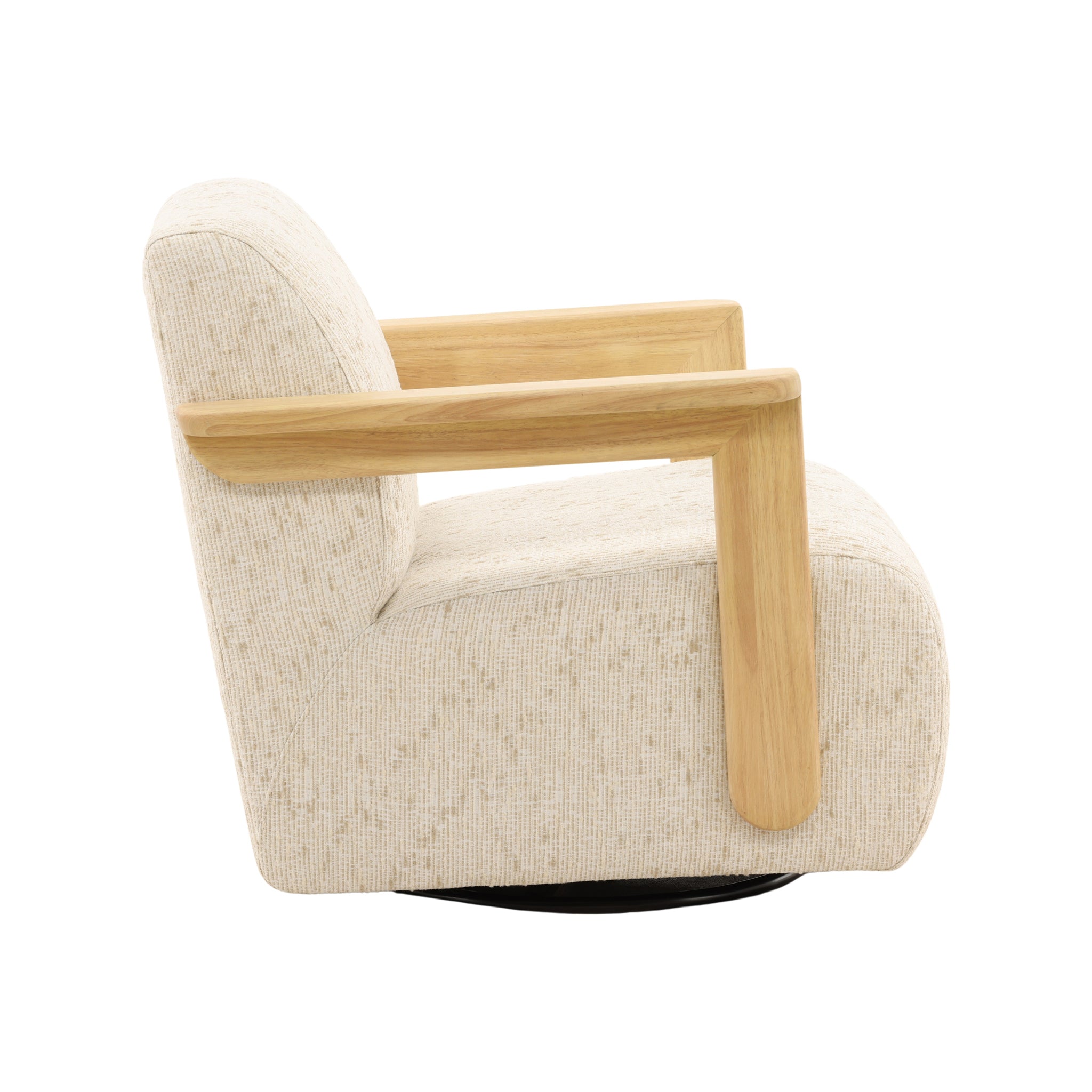 This contemporary swivel chair offers the perfect blend of style and function. Its plush, rounded silhouette, upholstered in a heavily textured, neutral fabric, creates an inviting look. The design is elegantly contrasted by sleek, light wood arms that provide a clean, modern line. With its smooth swivel base, this chair is a versatile and comfortable accent piece for a living room, home office, or any space where you need to easily turn and engage.