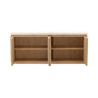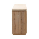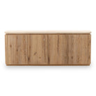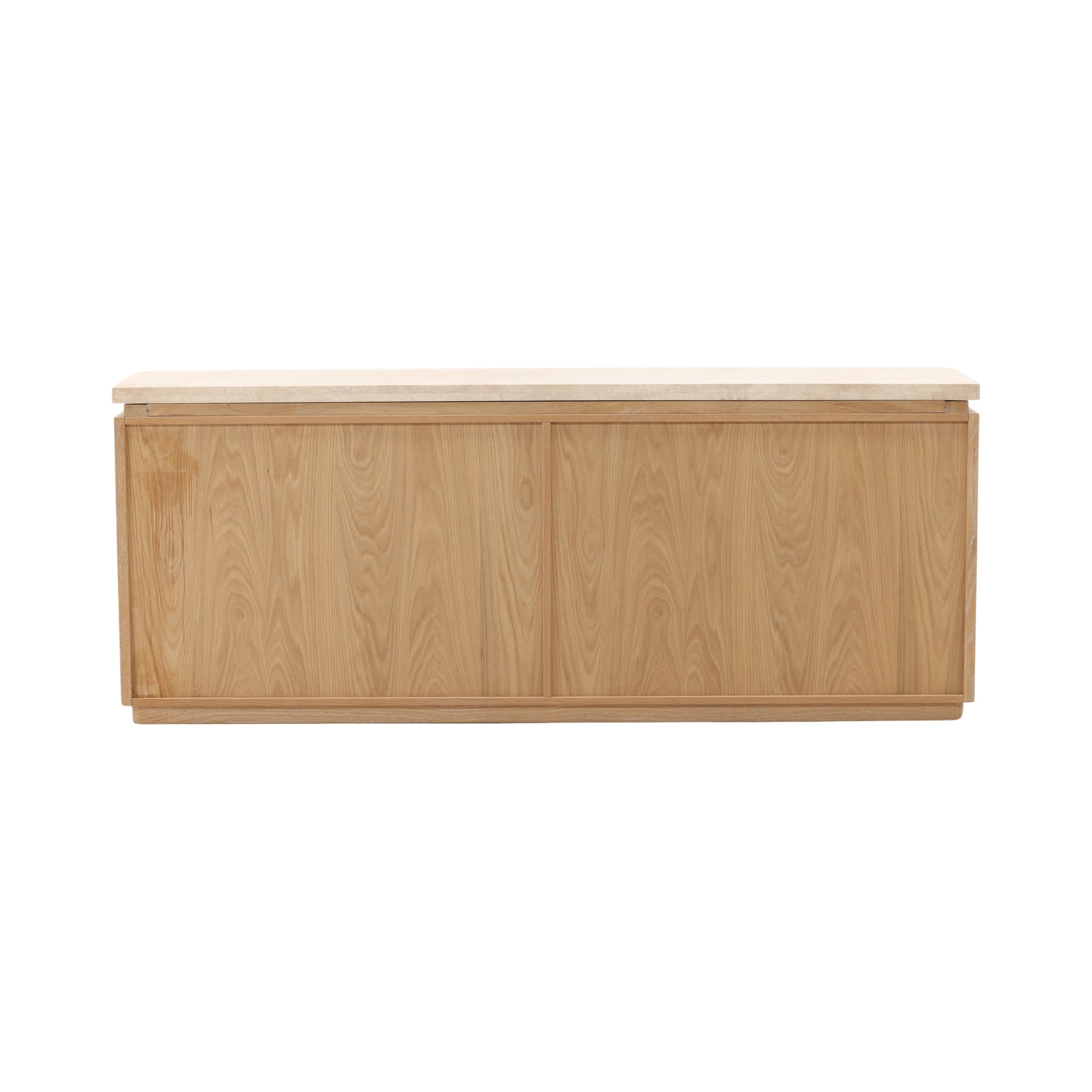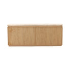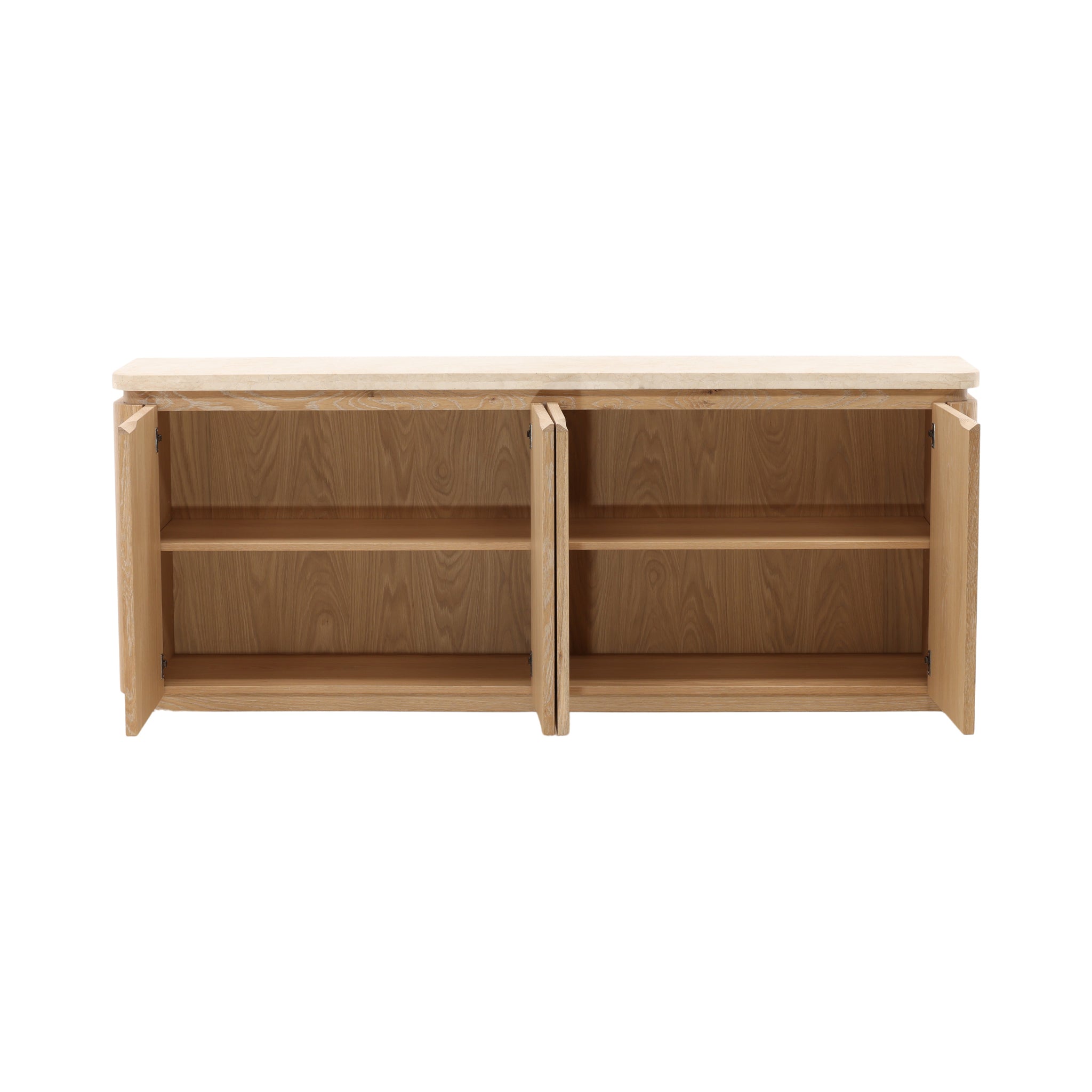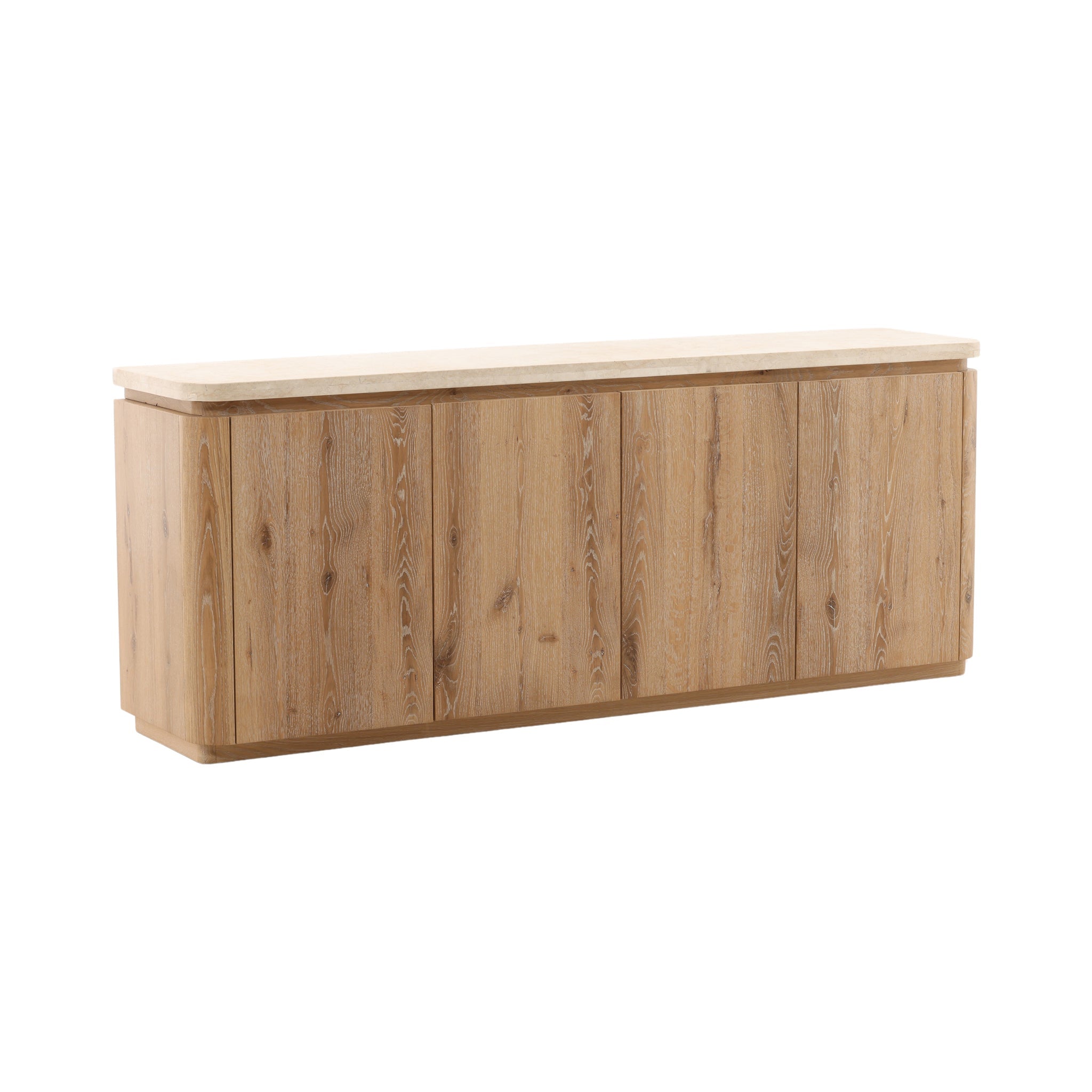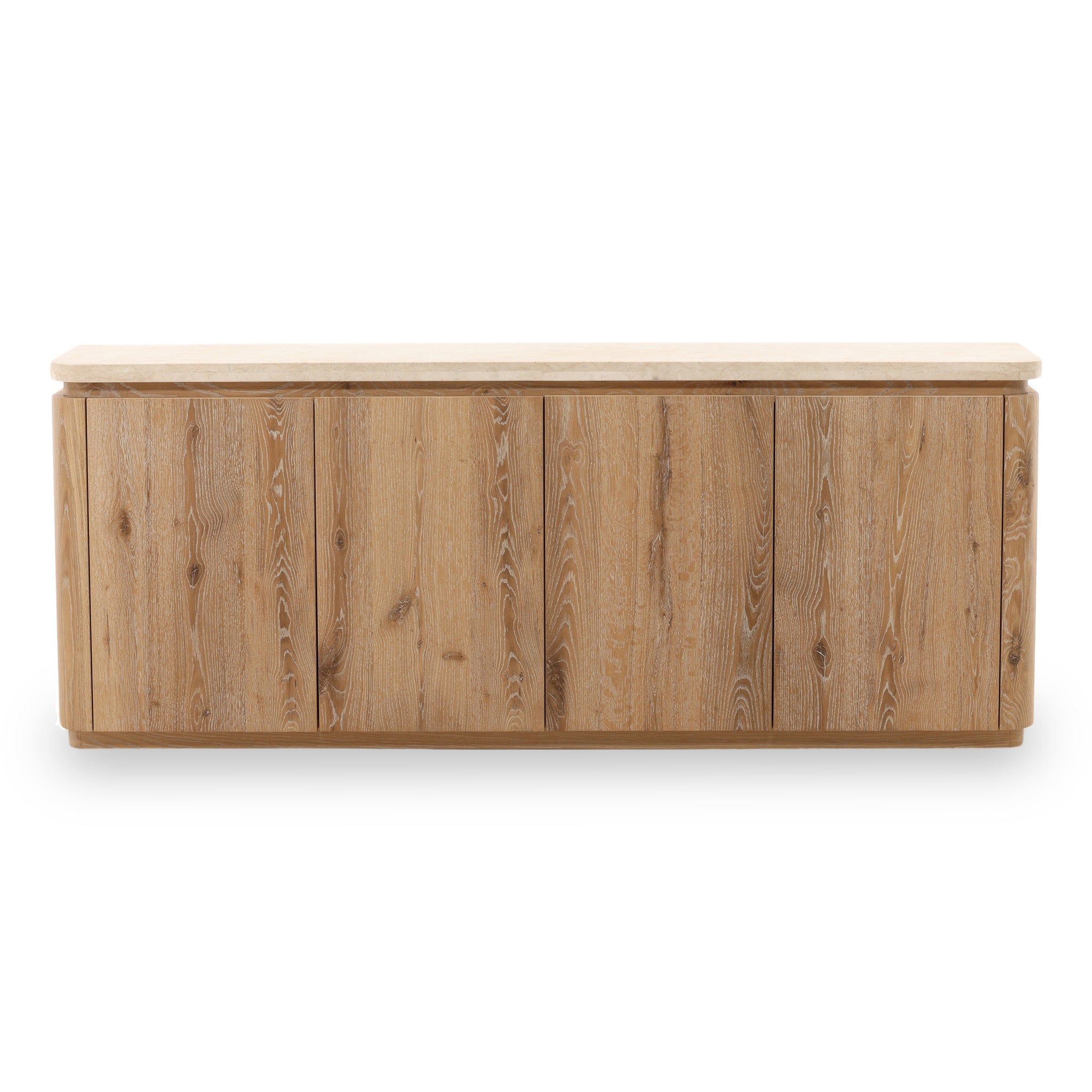 This modern sideboard is a harmonious blend of natural materials. Its long silhouette features a solid stone top with a smooth finish and gently rounded corners. The four-door cabinet body is crafted from wood with a visible grain and matching rounded ends. This piece offers ample storage for a dining room or living space while serving as an elegant, organic centerpiece.
