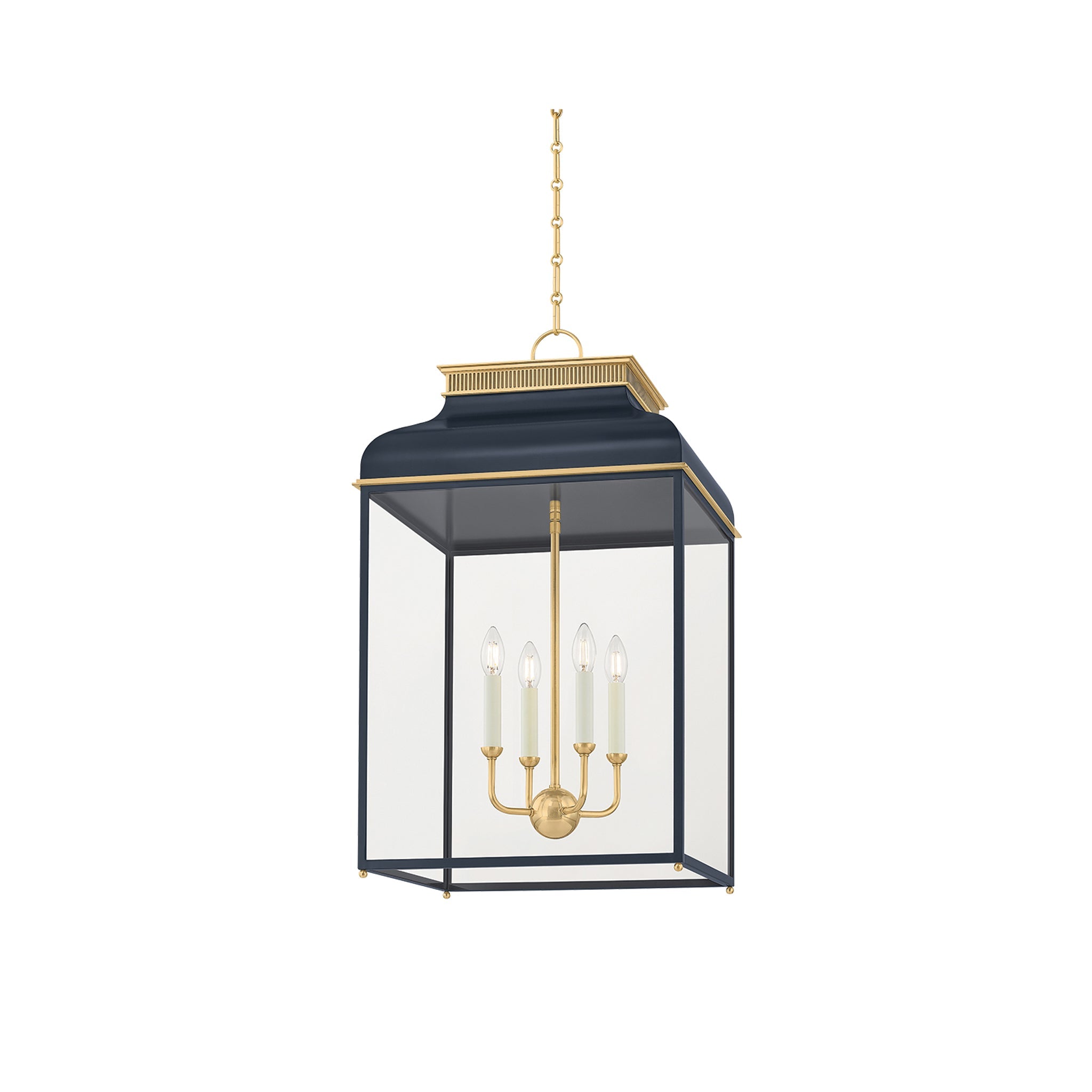 Blending traditional lines with fresh, mixed finishes, the Houghton lantern family exudes timeless elegance. Notable details include Mark D. Sikes' signature ball accent at the center of the candelabra and perforations on the shades. Complemented by warm Aged Brass/ accents, the classic silhouette ensures Houghton fits into any interior space with ease. Houghton is available in two sizes with a choice of Darkest Blue or Off White finishes. Mark D. Sikes for Hudson Valley Lighting.