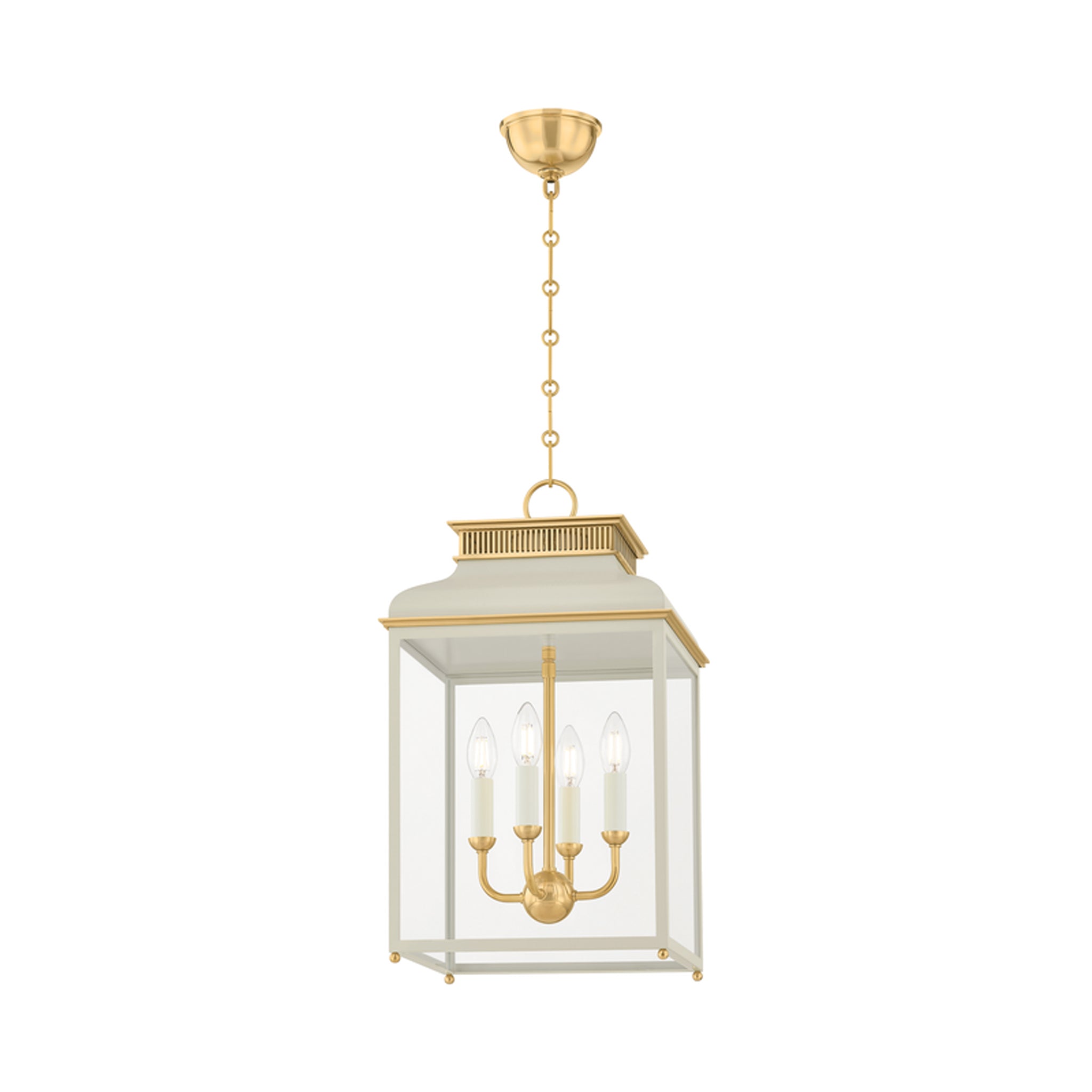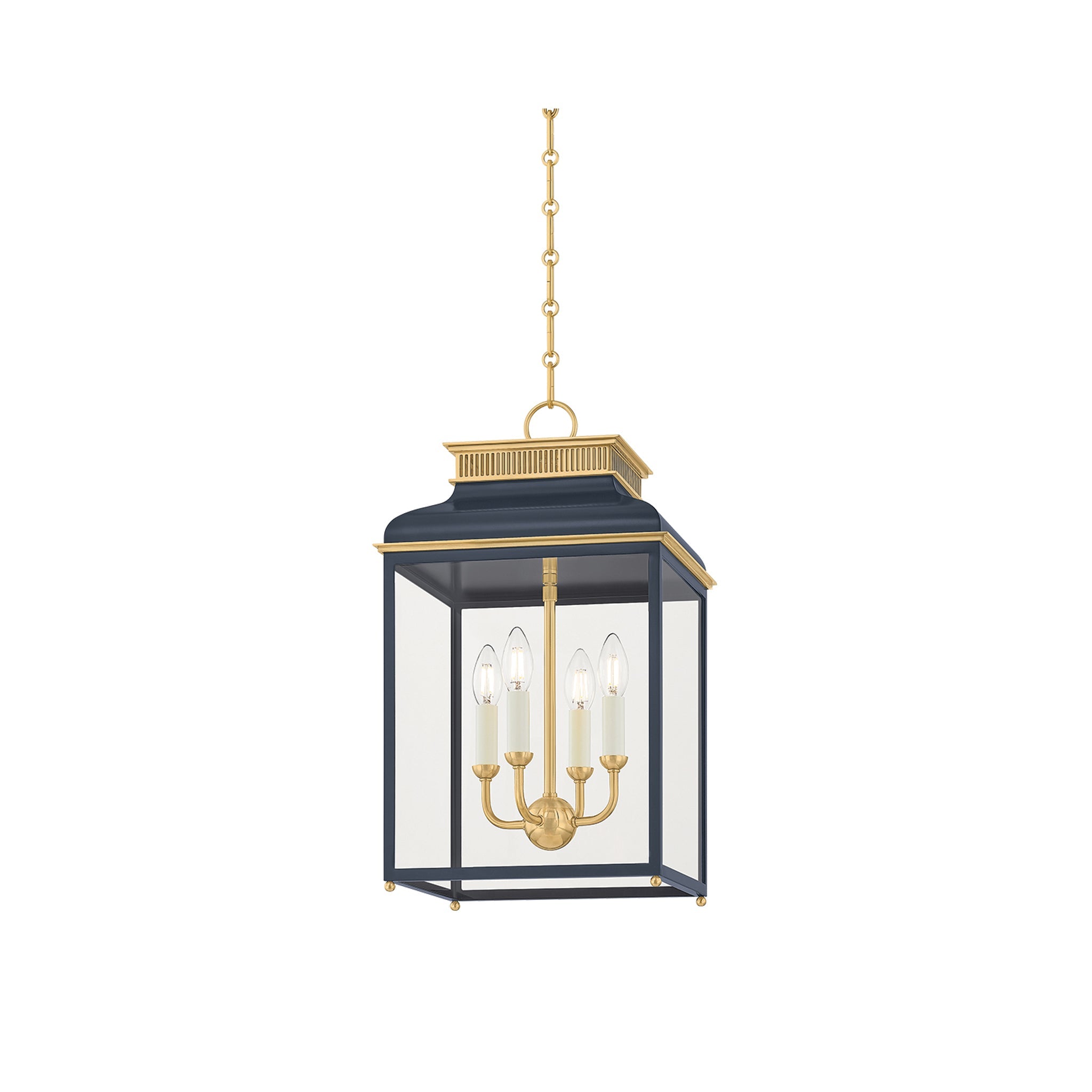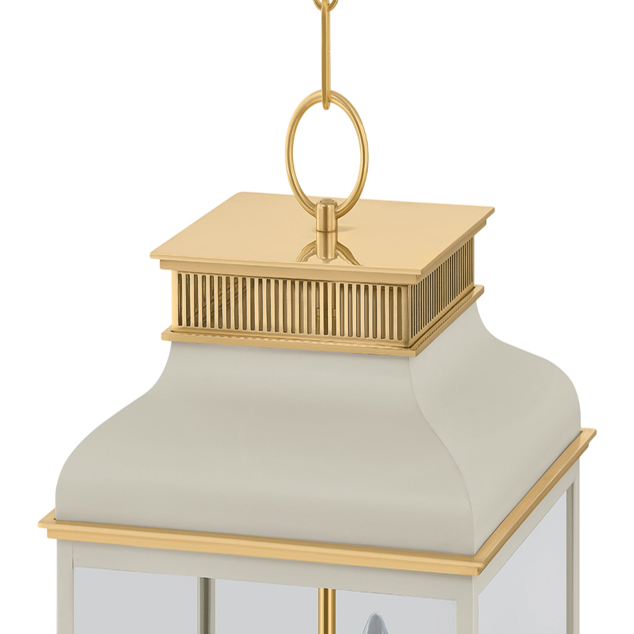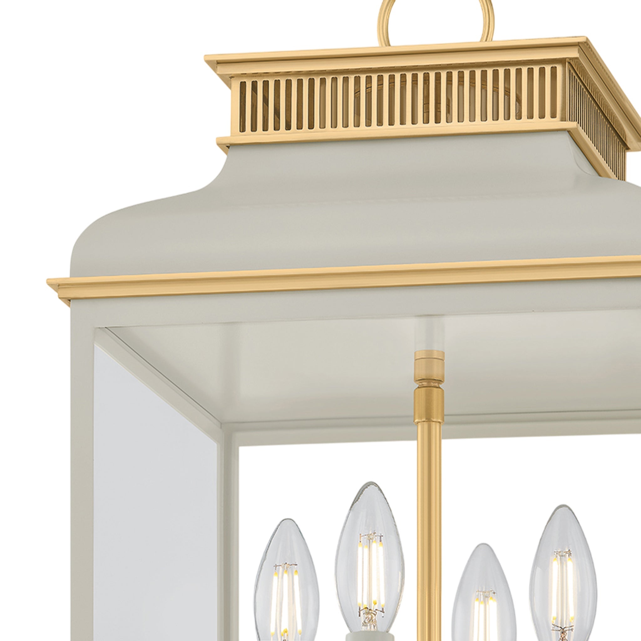 Blending traditional lines with fresh, mixed finishes, the Houghton lantern family exudes timeless elegance. Notable details include Mark D. Sikes' signature ball accent at the center of the candelabra and perforations on the shades. Complemented by warm Aged Brass accents, the classic silhouette ensures Houghton fits into any interior space with ease. Houghton is available in two sizes with a choice of Darkest Blue or Off White finishes. Mark D. Sikes for Hudson Valley Lighting.