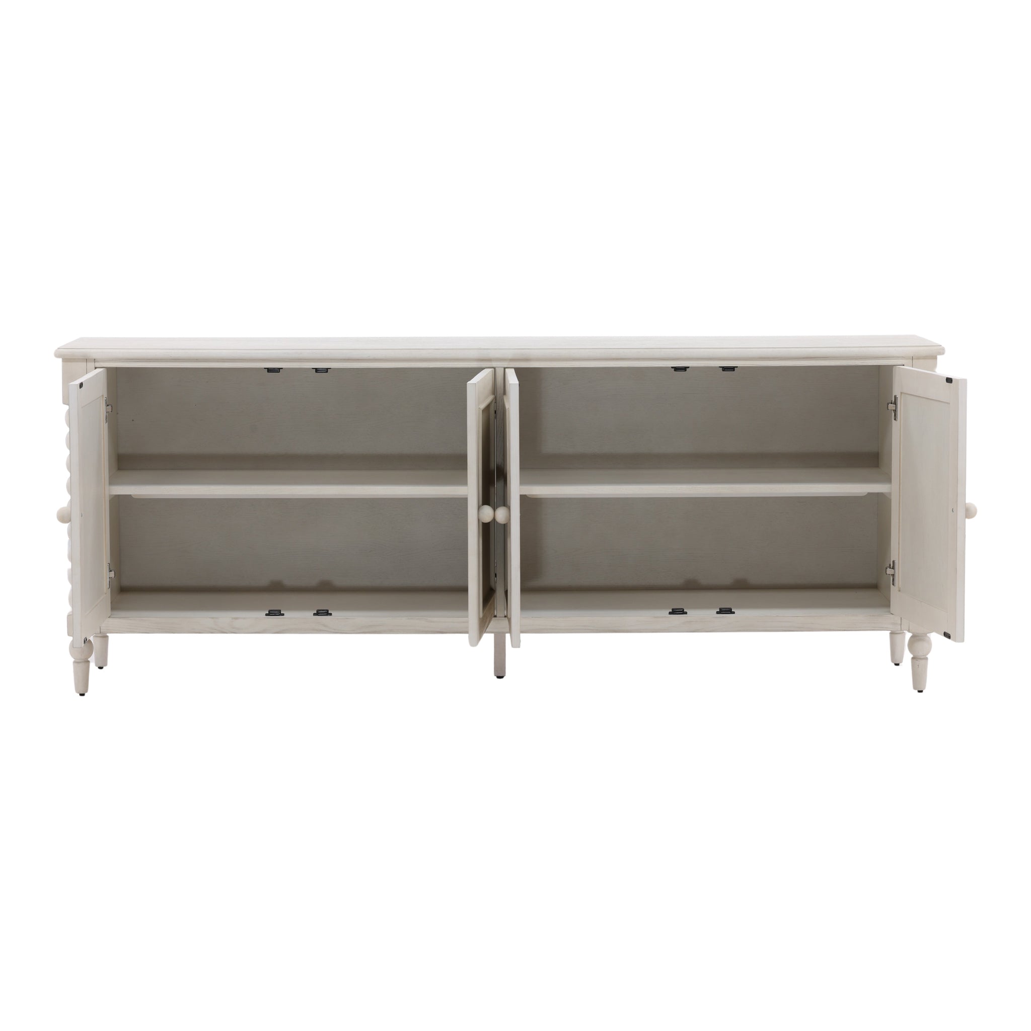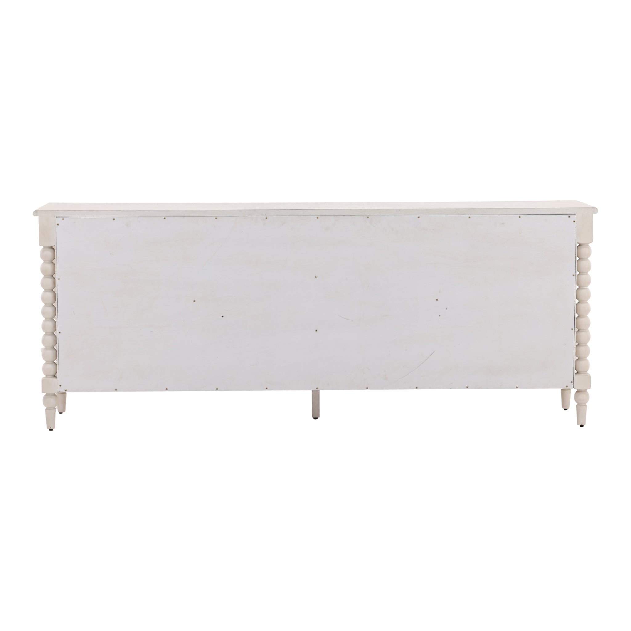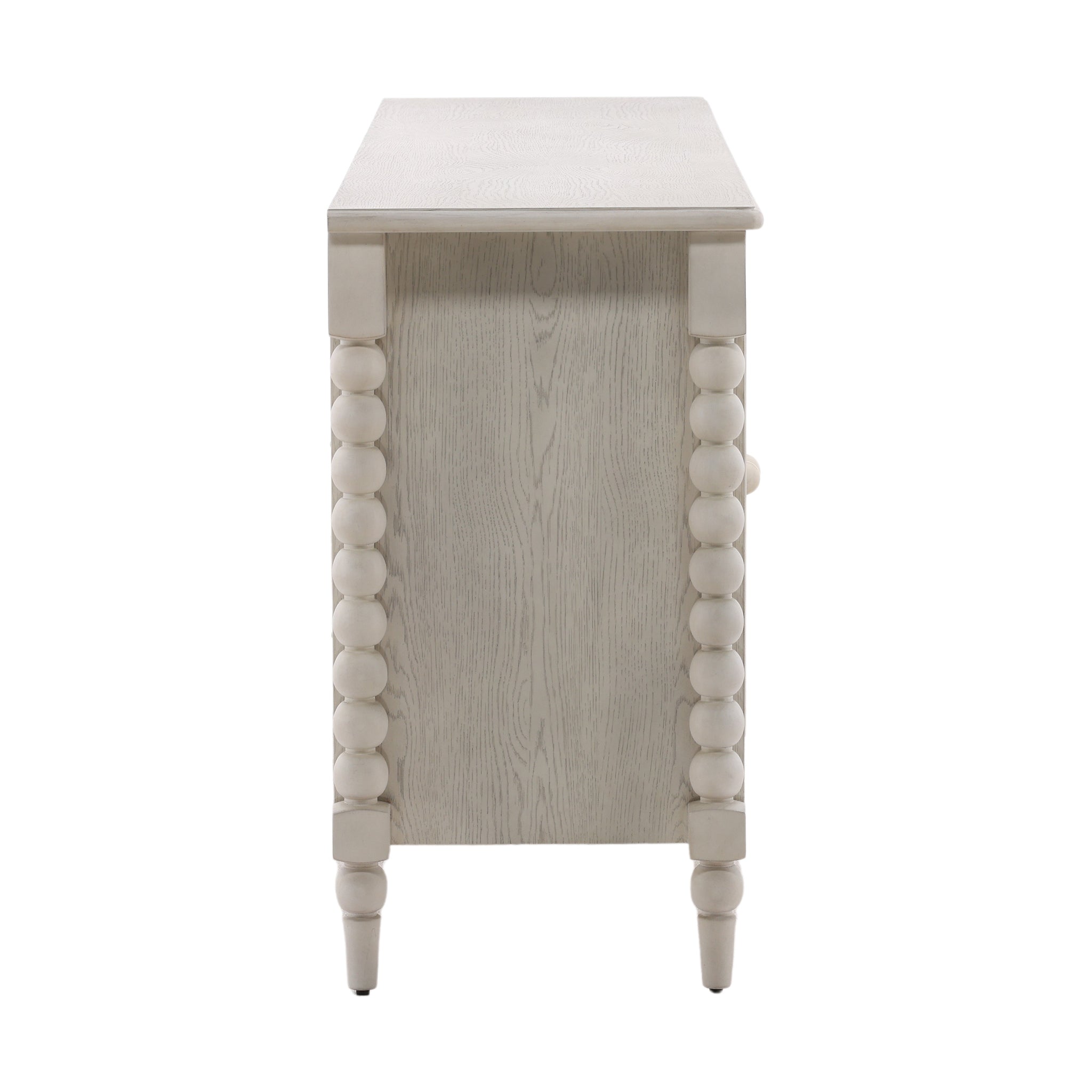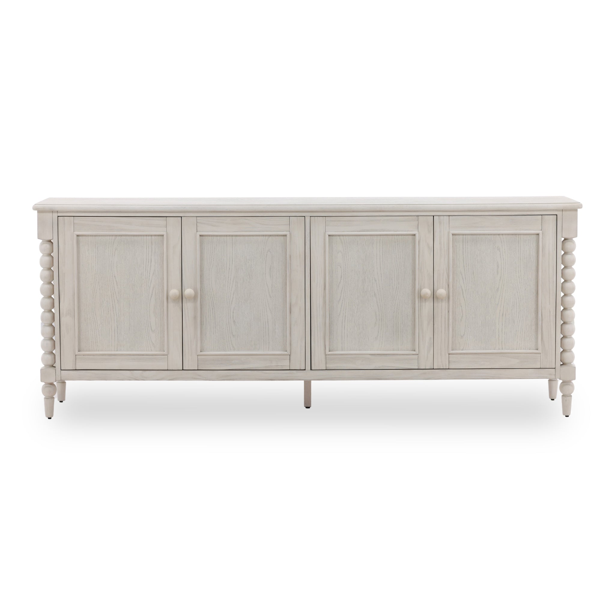 This charming, cottage-style sideboard adds a touch of rustic elegance to your home. Its most distinctive feature is the beautiful bobbin-style turned wood detailing, which forms the side columns and legs. The piece is finished in a distressed light wood with a visible grain, giving it a soft, weathered look. With four doors providing ample hidden storage, this versatile cabinet is perfect as a buffet in a dining room, a media console, or an accent piece in a living space.