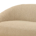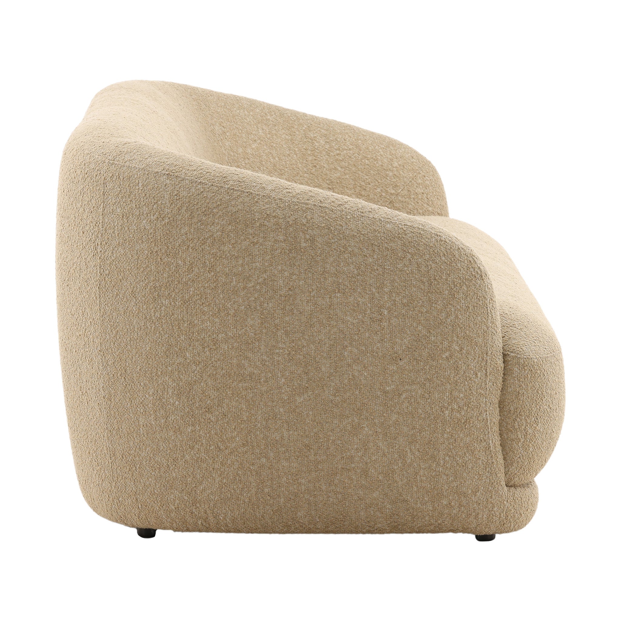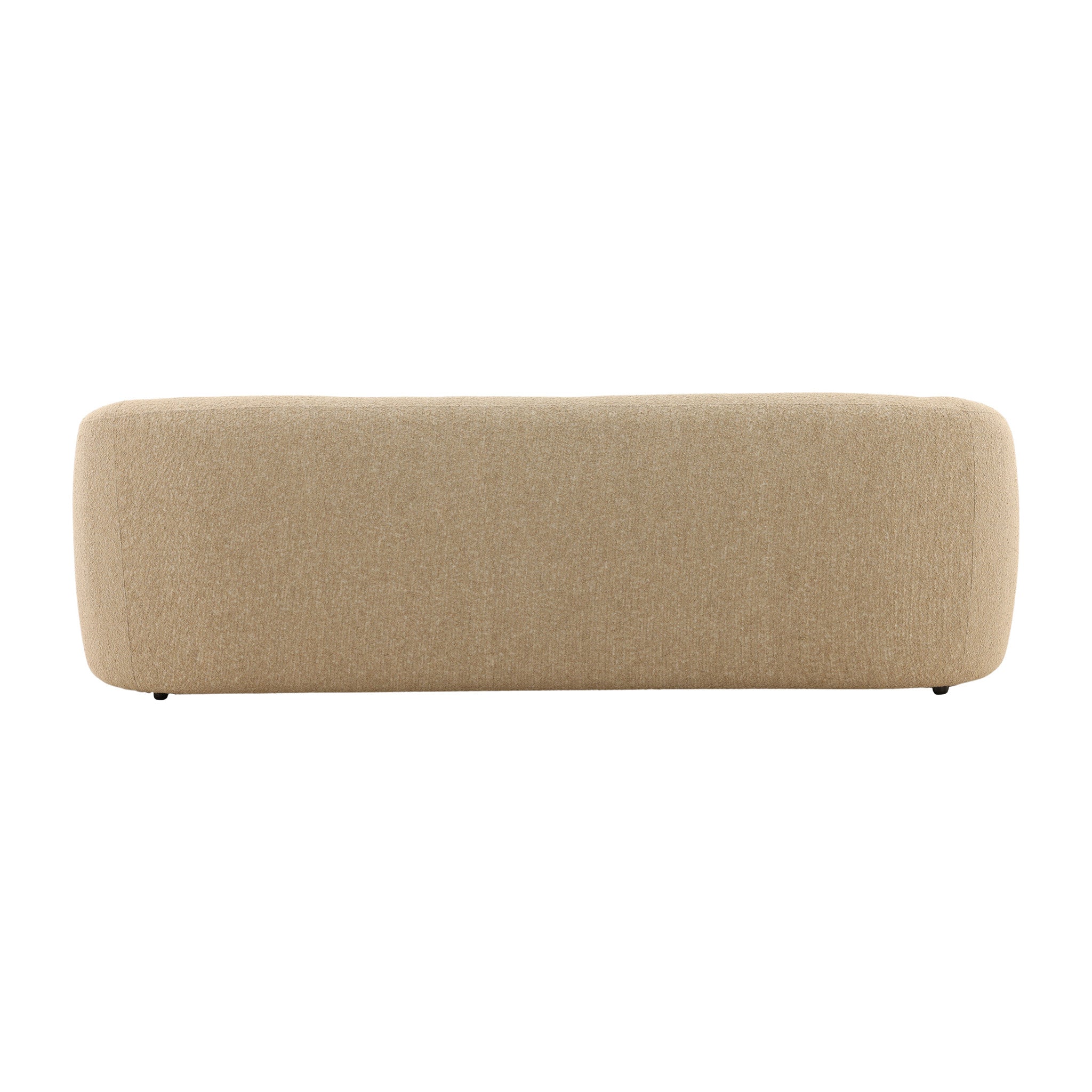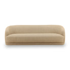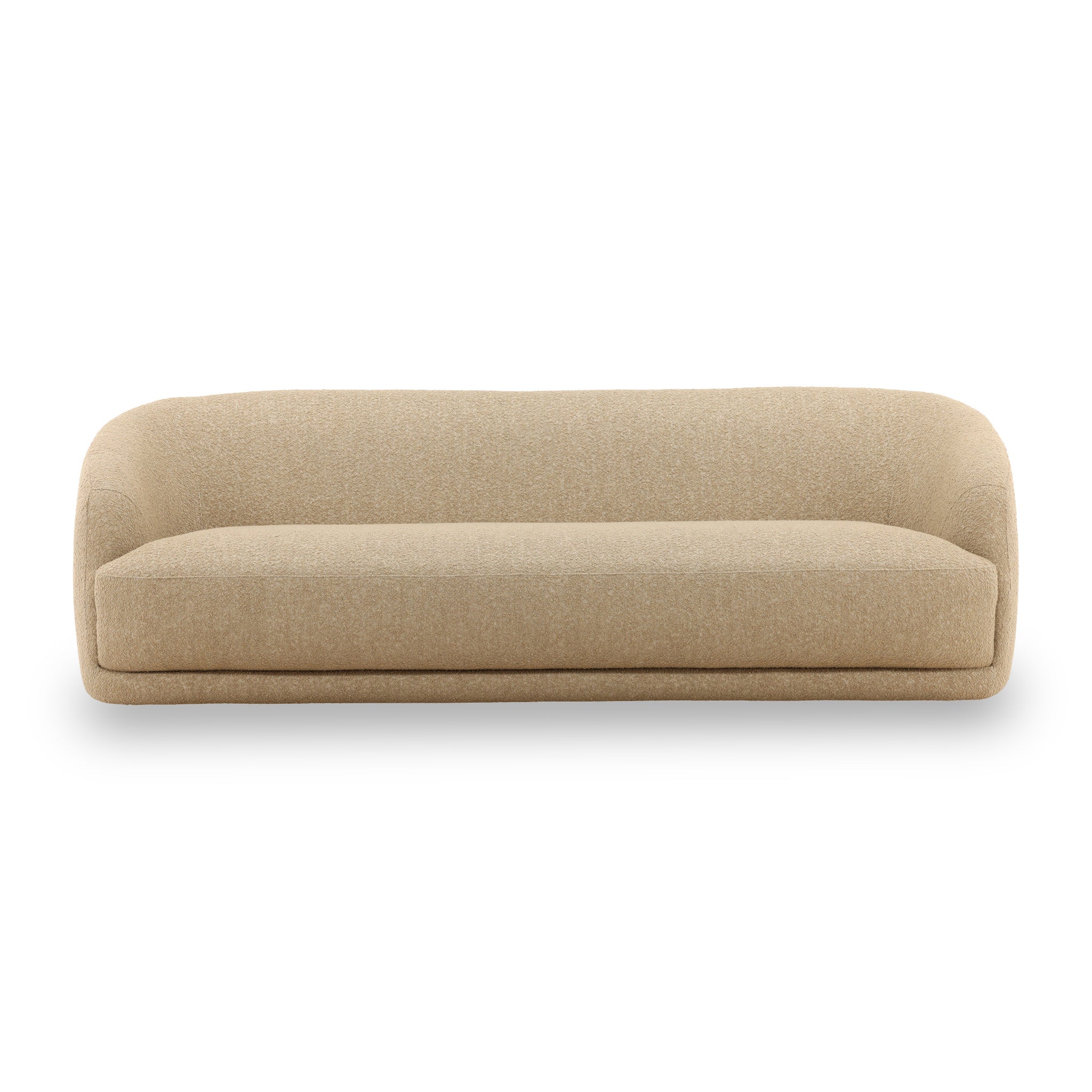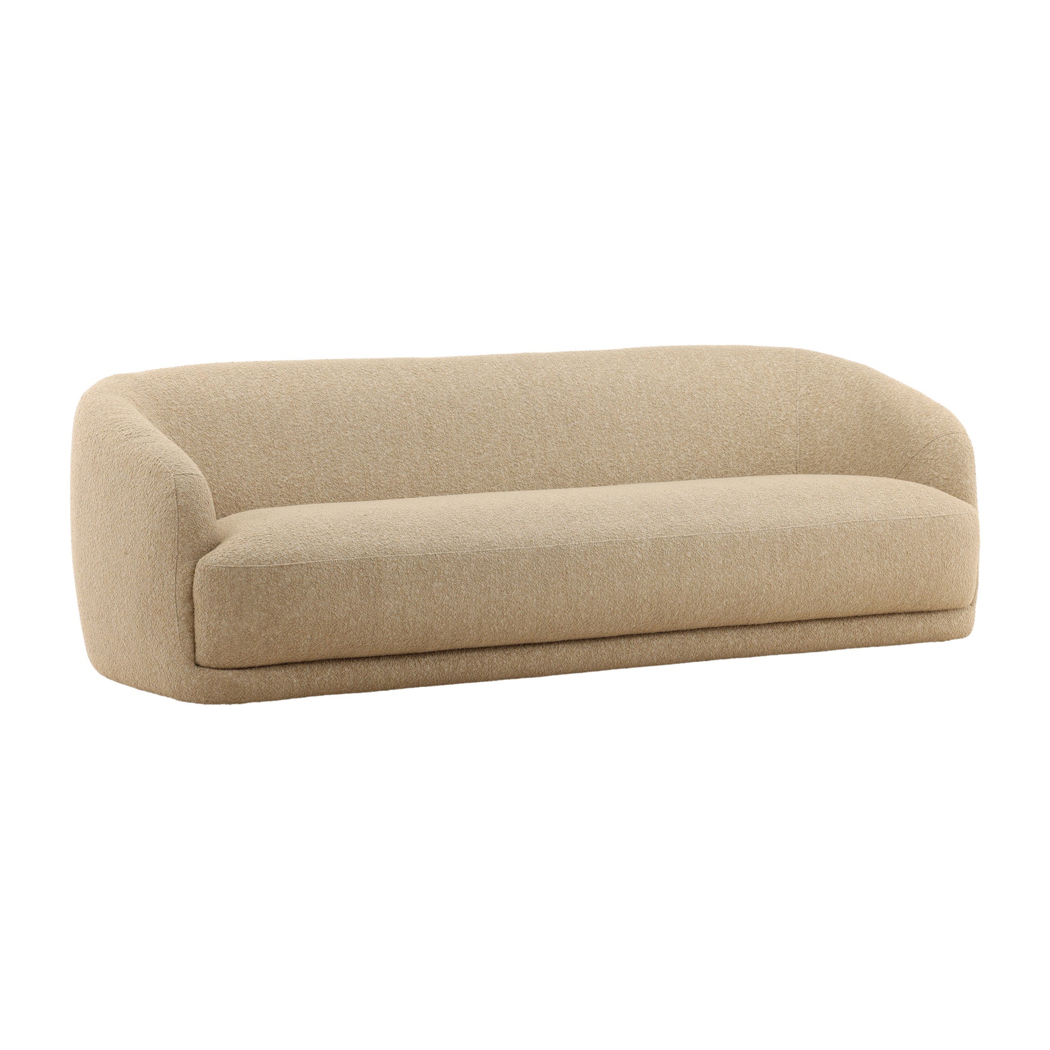 This modern sofa brings a sense of soft elegance to your living space. Its beautiful, curved silhouette and seamless form create a clean and inviting aesthetic. The piece is upholstered in a plush, textured fabric with a tactile, bouclé-like feel, offering a cozy and comfortable place to relax. The low-profile design and graceful lines make it a striking yet approachable centerpiece for any contemporary interior.