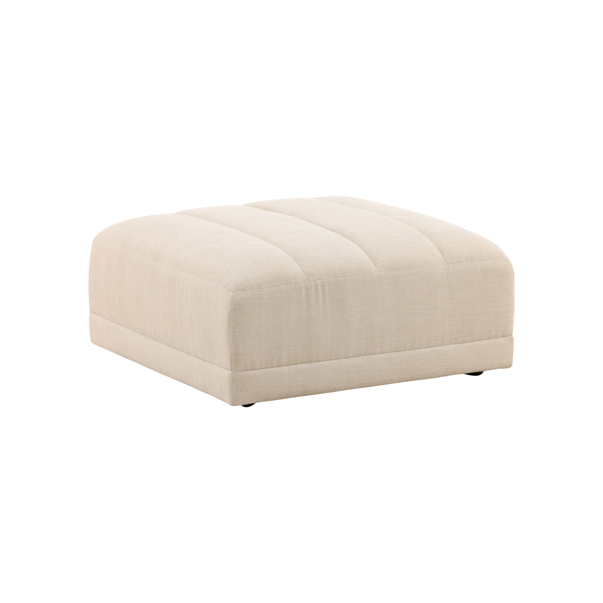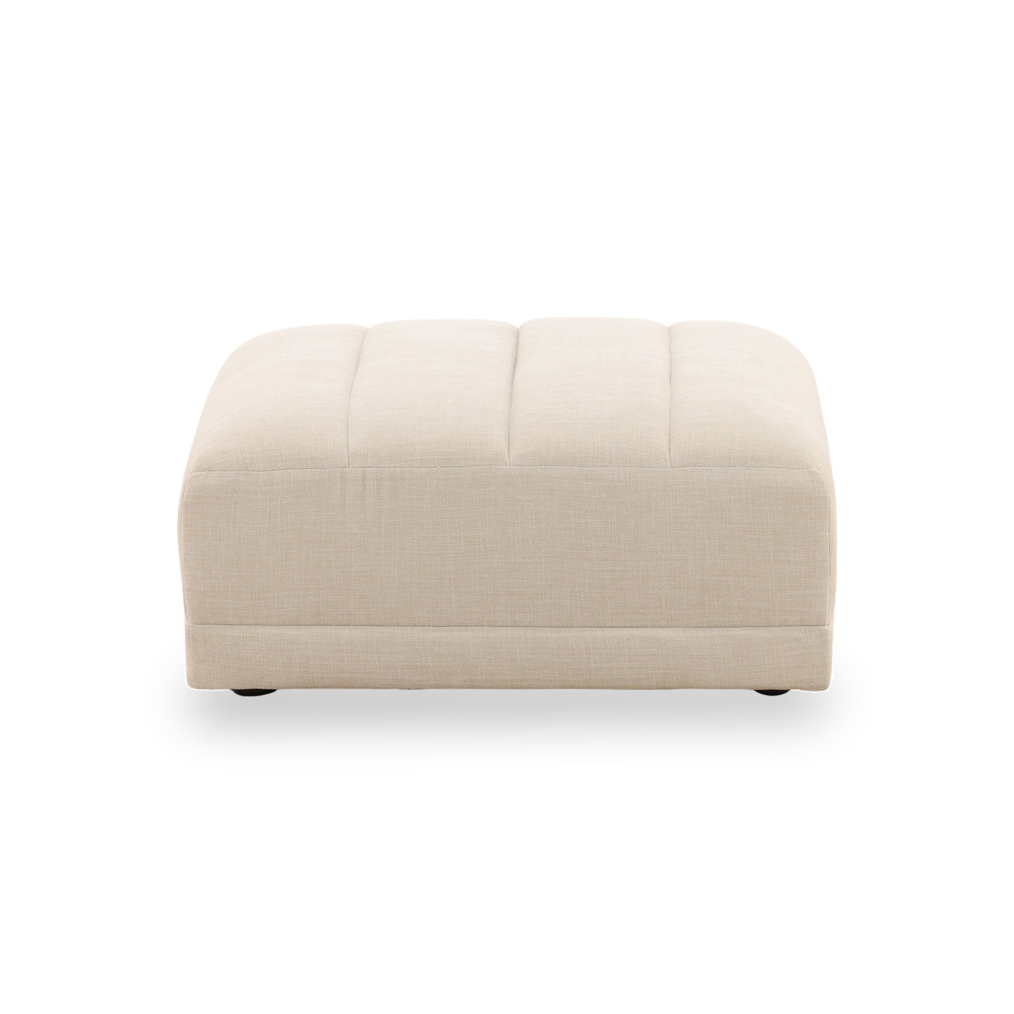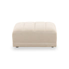 This modern ottoman brings a plush, comfortable touch to your living space. The piece is upholstered in a light, neutral fabric with a subtle texture, and the top is finished with elegant vertical channeling. Its versatile design and solid build make it perfect for use as a footrest, extra seating, or a stylish coffee table.