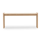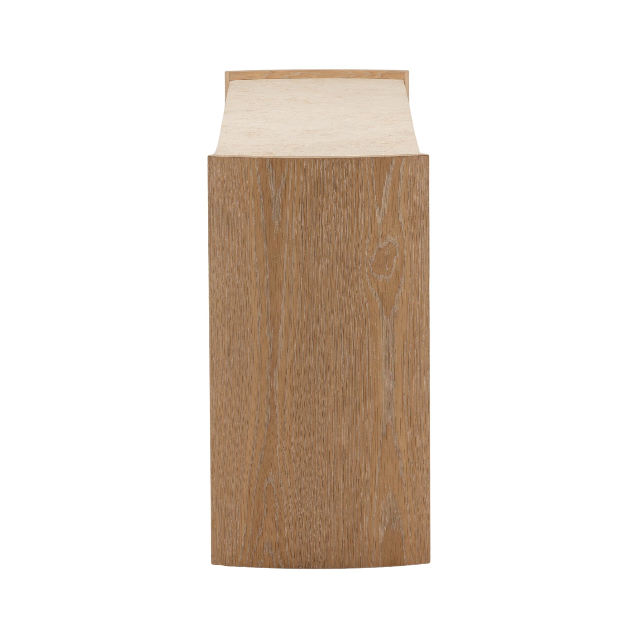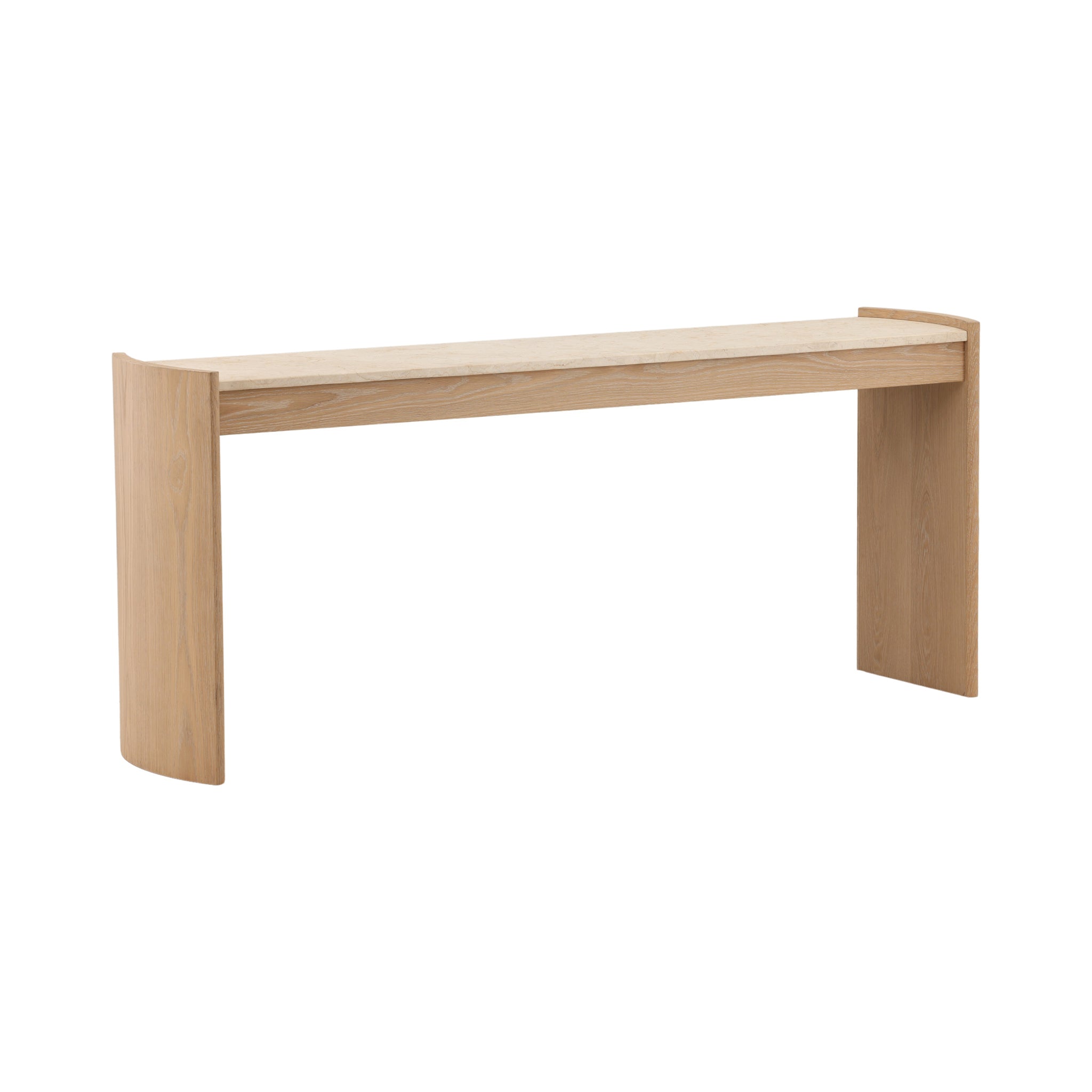 This minimalist console table is a study in material and form. It features a sleek, light wood frame with gently curved legs, creating a seamless waterfall design. The tabletop showcases a beautiful, recessed slab of natural stone, adding a luxurious and elegant contrast. With its clean lines and harmonious blend of textures, this piece is a perfect addition to an entryway, hallway, or living room.
