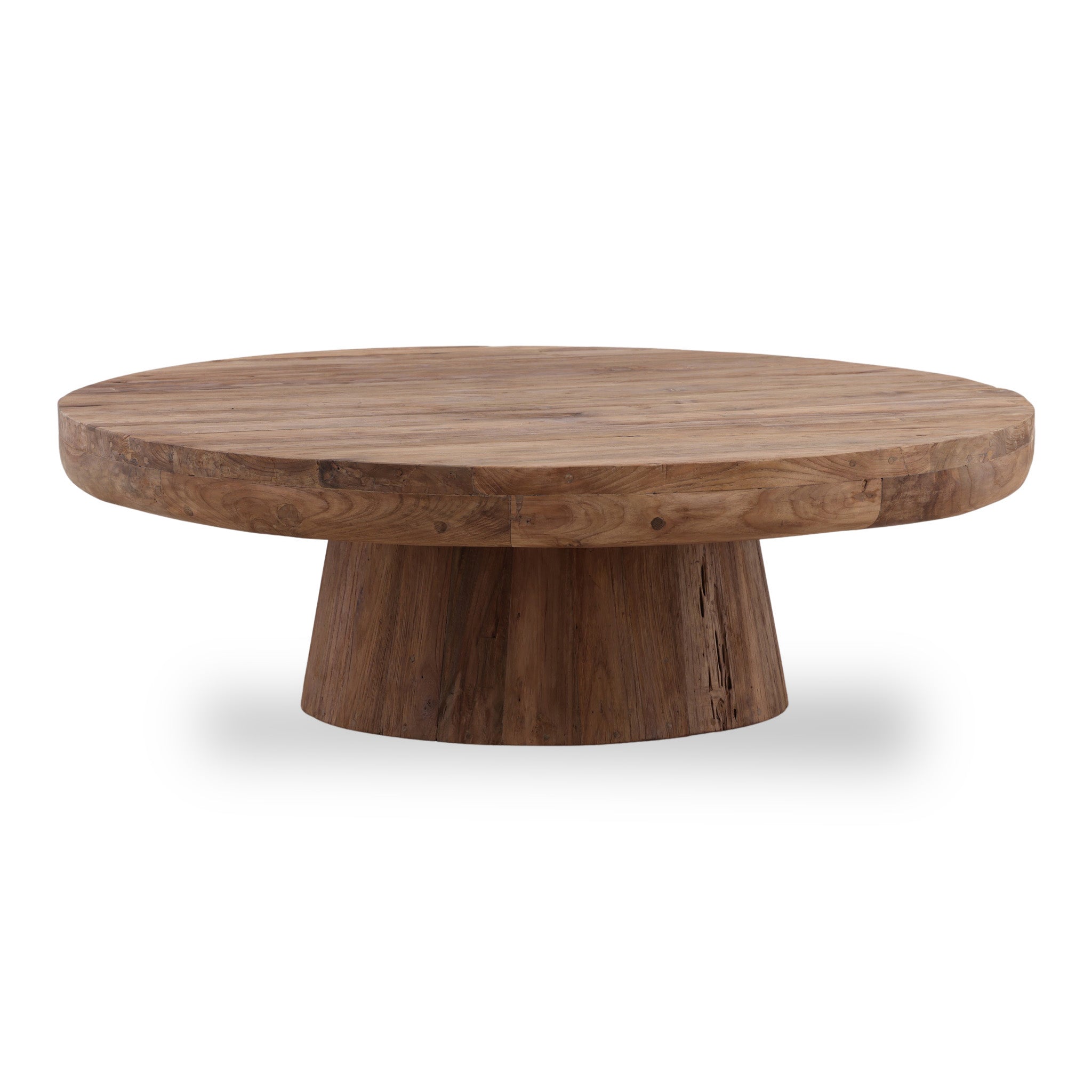 This solid wood coffee table makes a beautiful statement with its sculptural form and rustic charm. The thick, round tabletop is crafted from natural wood with visible grain and subtle imperfections, creating an organic, artisanal feel. The table is supported by a sturdy, cylindrical pedestal base, which highlights the wood's raw beauty and texture. This piece is perfect as a functional centerpiece for a living room, bringing warmth and a touch of nature to your space.