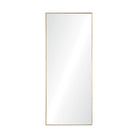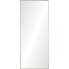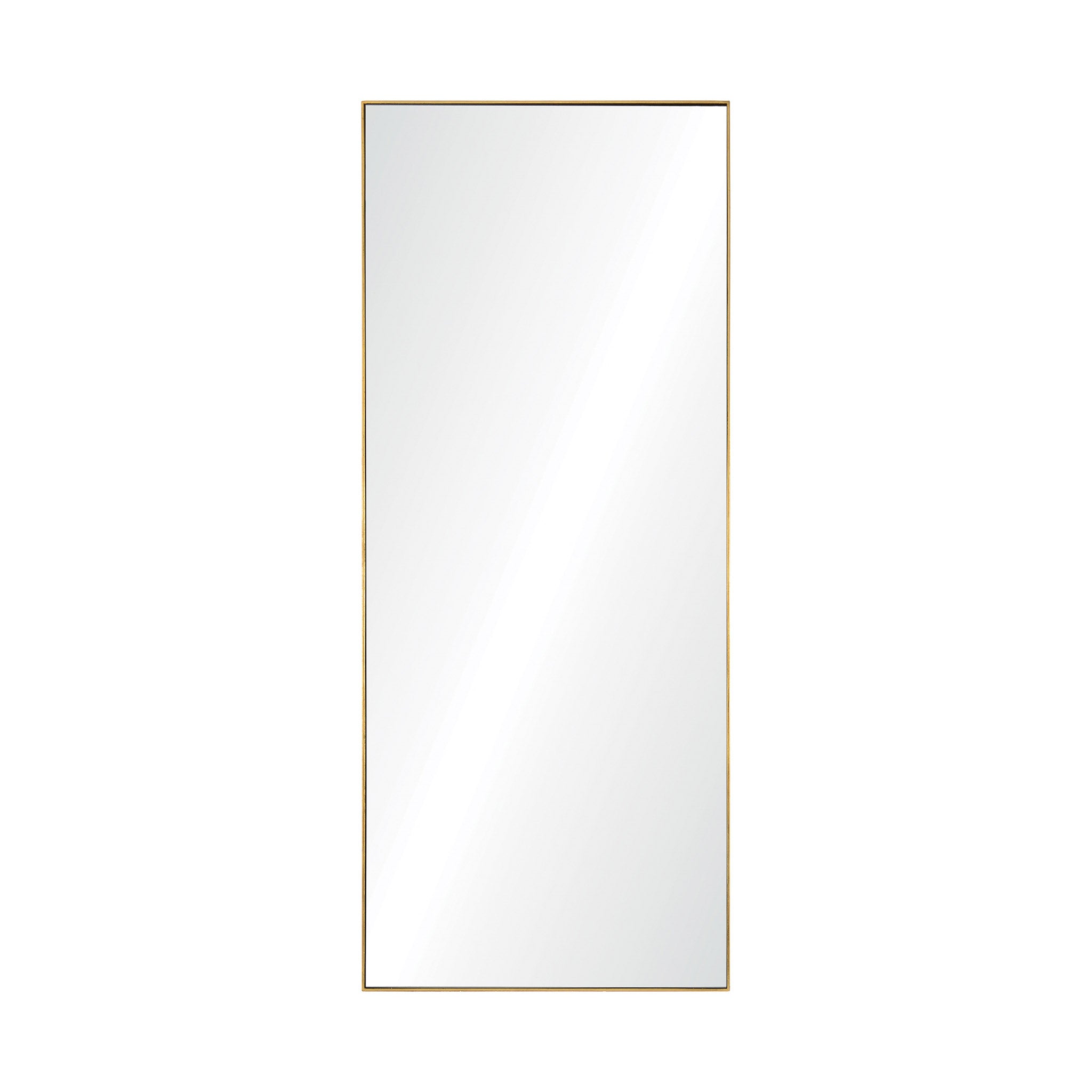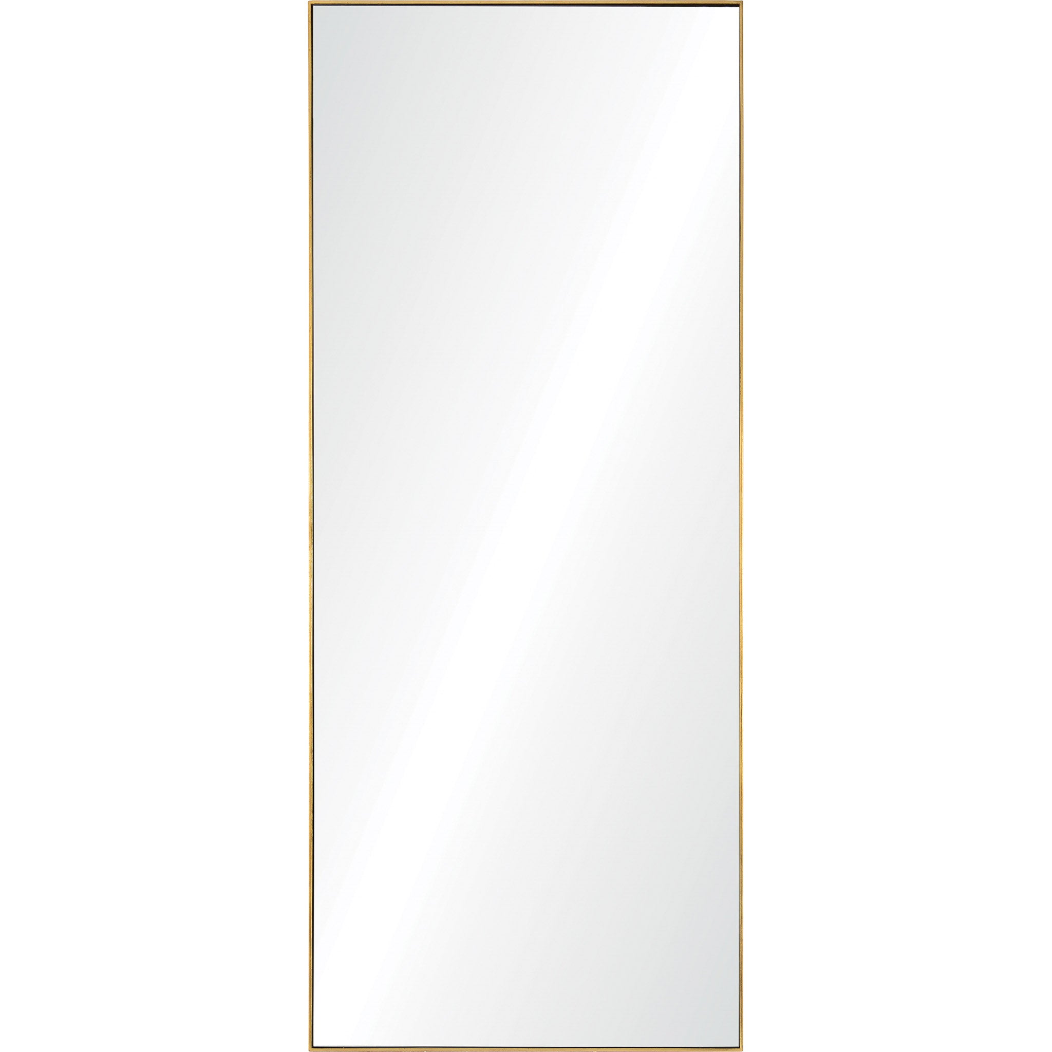 A glint of gold leaf surrounds the full-length silhouette of this modern mirror. A low-profile Iron frame mimics the beveled looking glass, encasing the glamorous mirror in sparkling metallic. The elongated rectangular format can be installed as a wall-mounted accent or casually placed in a corner, leaner style.