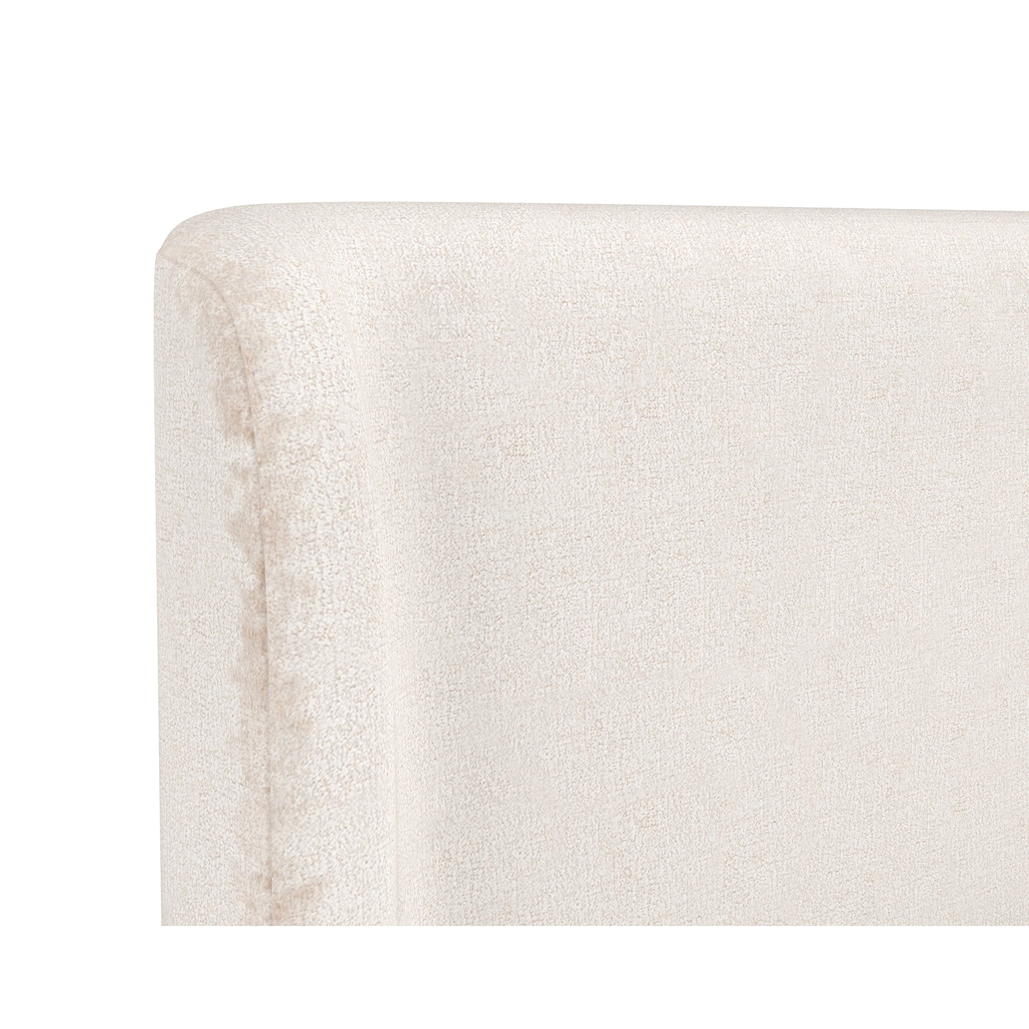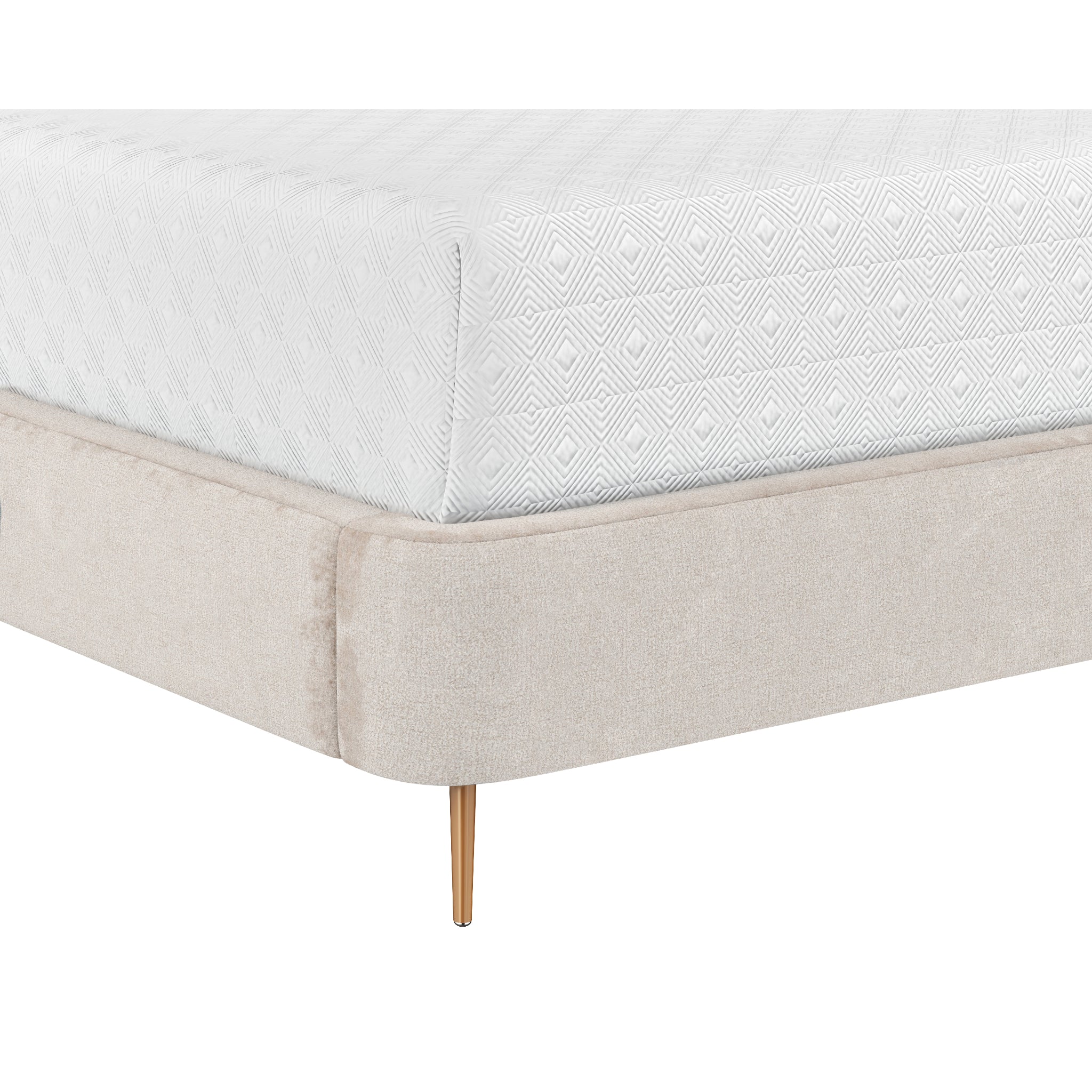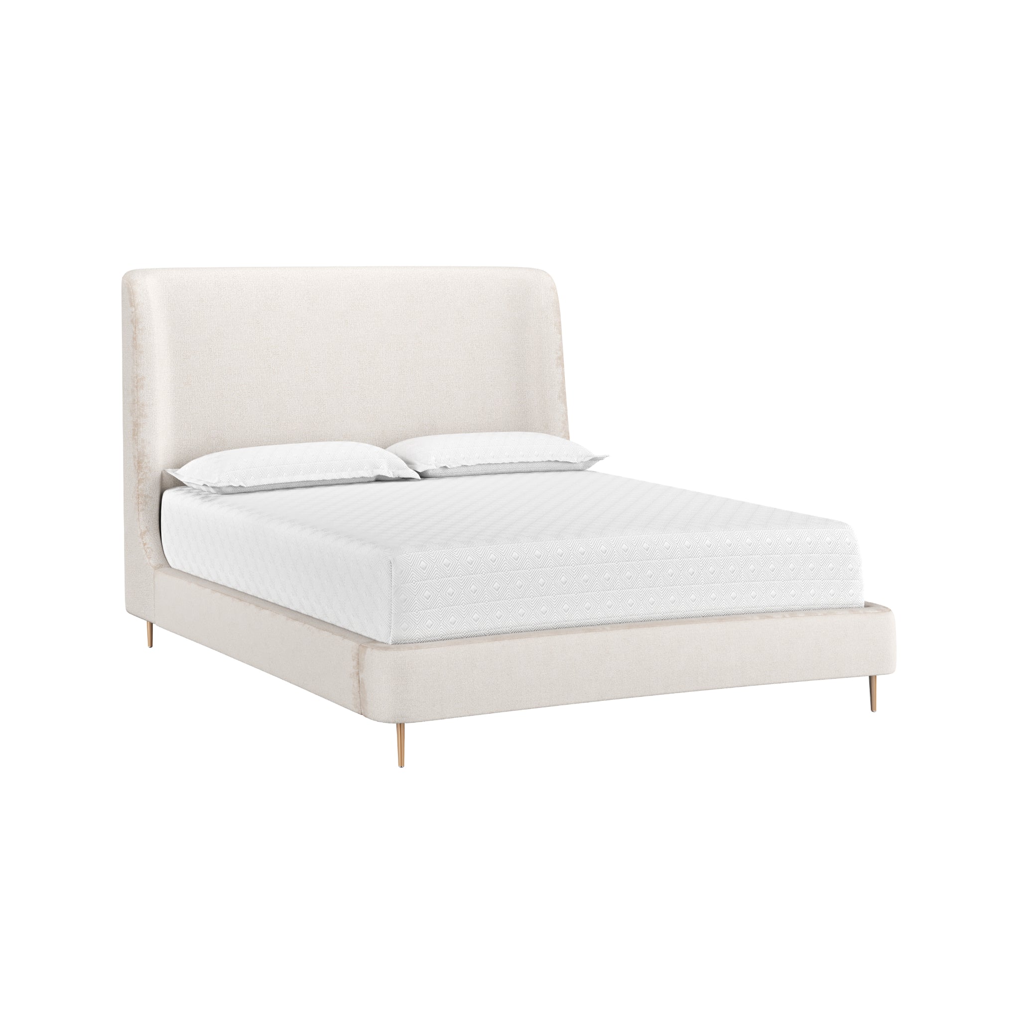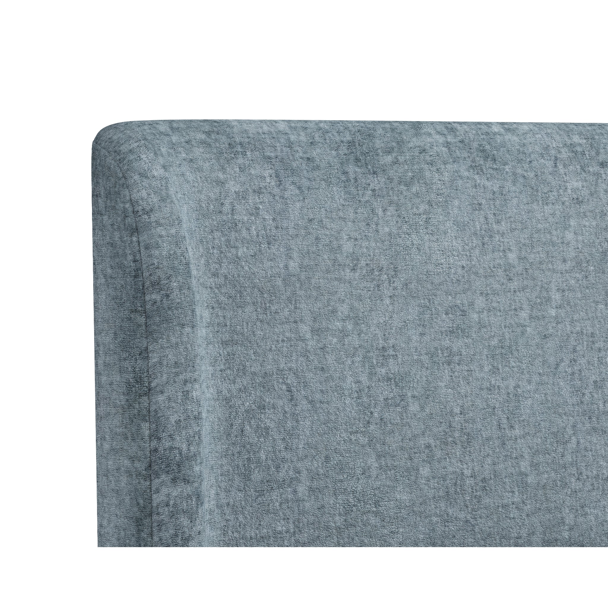 Boasting a stylish design with coastal influence, this beautiful bed exudes lavish comfort. A plush headboard with soft corners add an extra layer of coziness and fluidity. Upholstered in bergen french blue and taupe fabrics, and completed with minted copper steel legs. No box spring is required and slats are included.