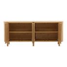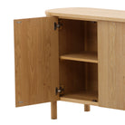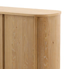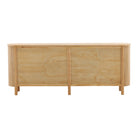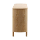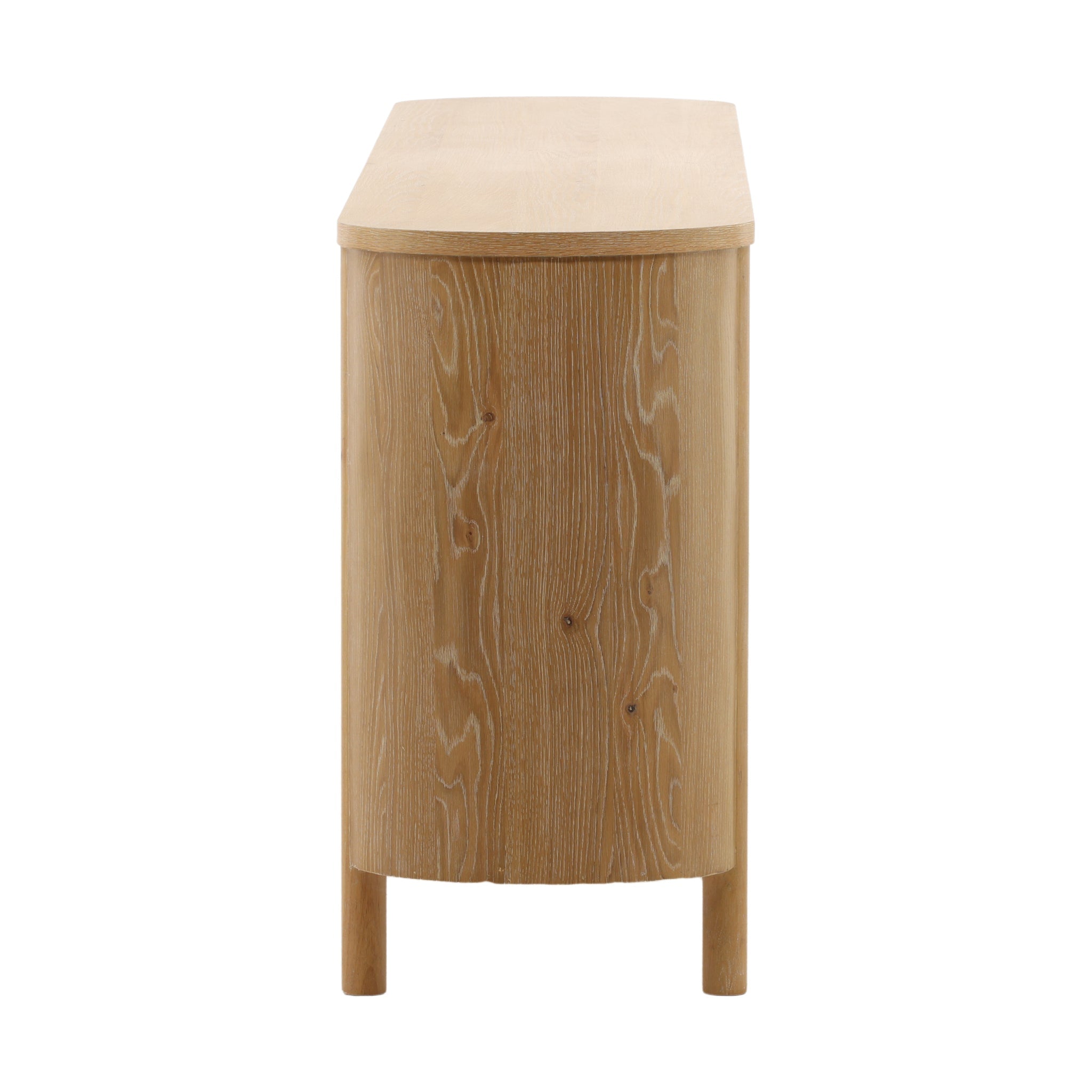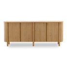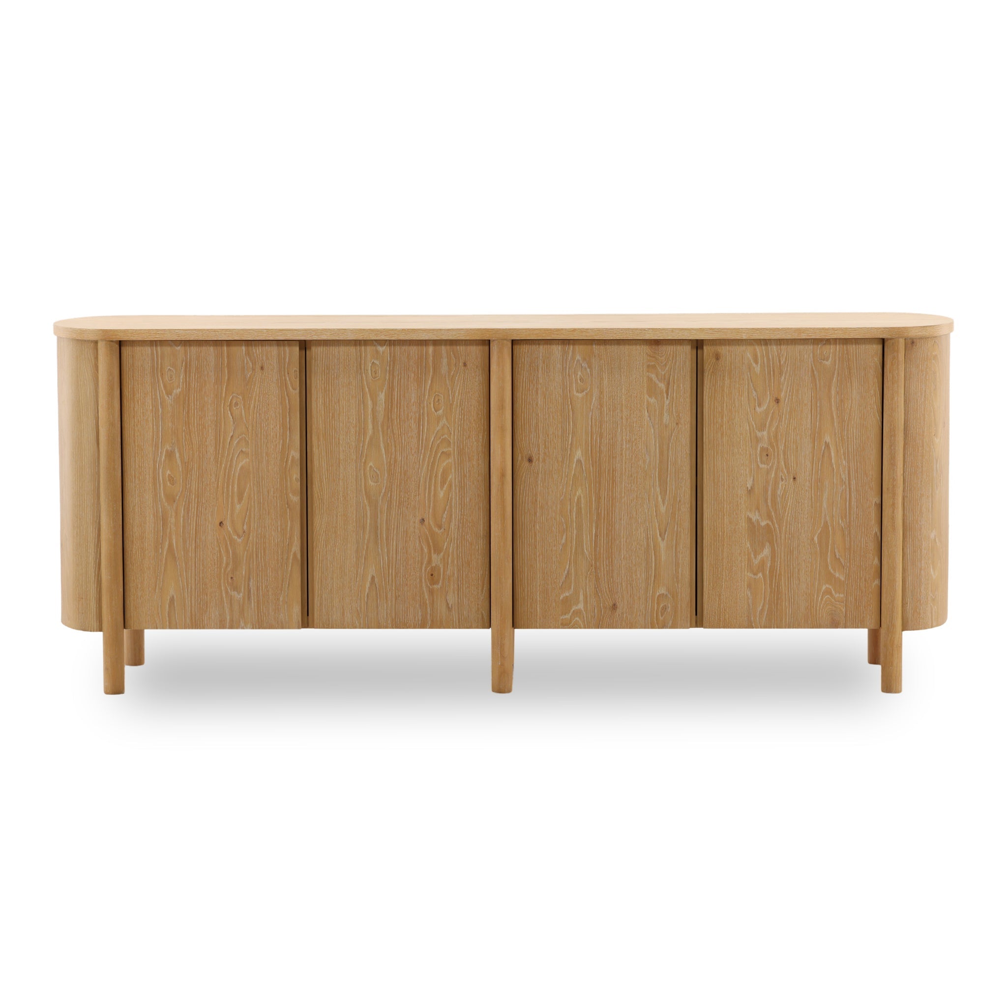 This elegant sideboard is a perfect blend of Scandinavian-inspired design and natural beauty. Its sleek, elongated silhouette is defined by soft, rounded edges and a curved base. The piece is crafted from a light-toned wood with a visible grain, and features four seamless cabinet doors with integrated pulls. The design is subtly accented by cylindrical legs that extend upward, serving as a unique and graceful detail. This piece offers both a sophisticated look and ample hidden storage.