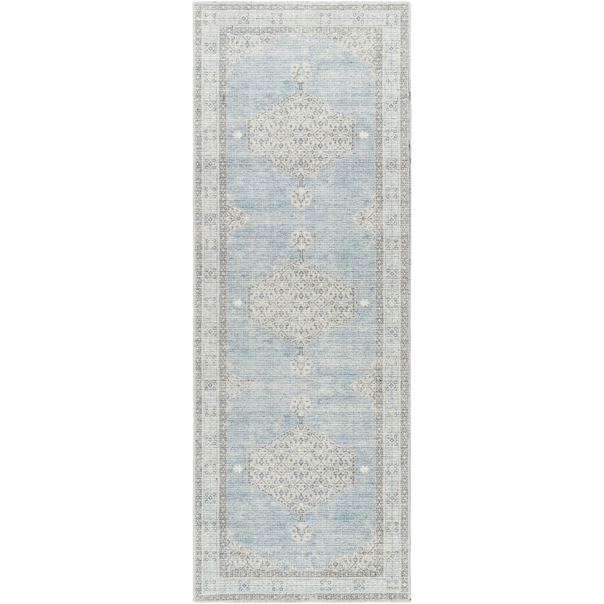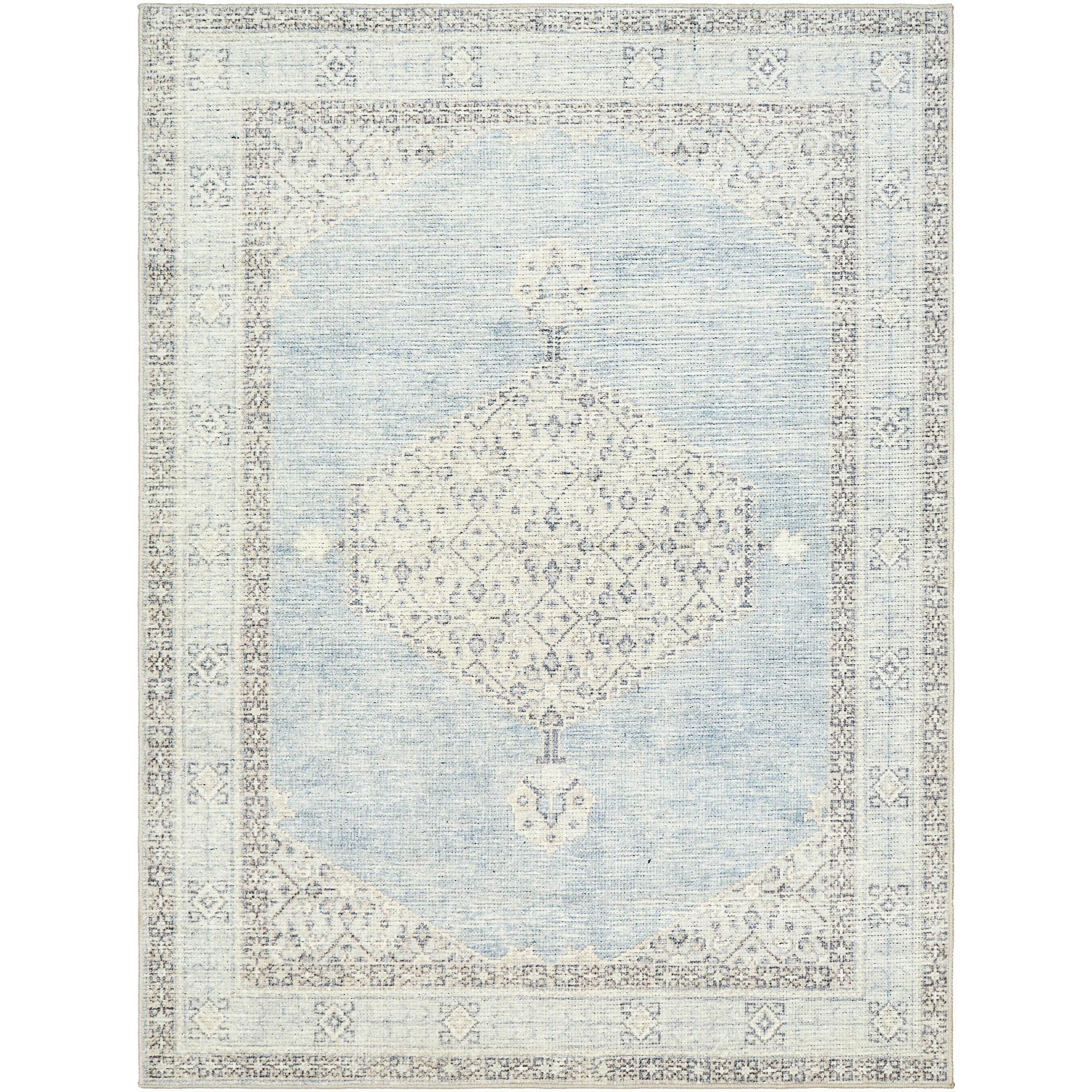The calming cool tones of blue in this Lila rug from Becki Owens x Surya, create a coastal feel that adds a pop of color and interest to any floor. These dreamy tones, combined with the soft floral details and vintage medallion, create an elegant design with a touch of old character. This rug was woven with a unique technique to mimic the texture of a handwoven rug with durability and cost in mind. Inspired by one-of-a-kind rugs, this rug will make a statement in any type of space.