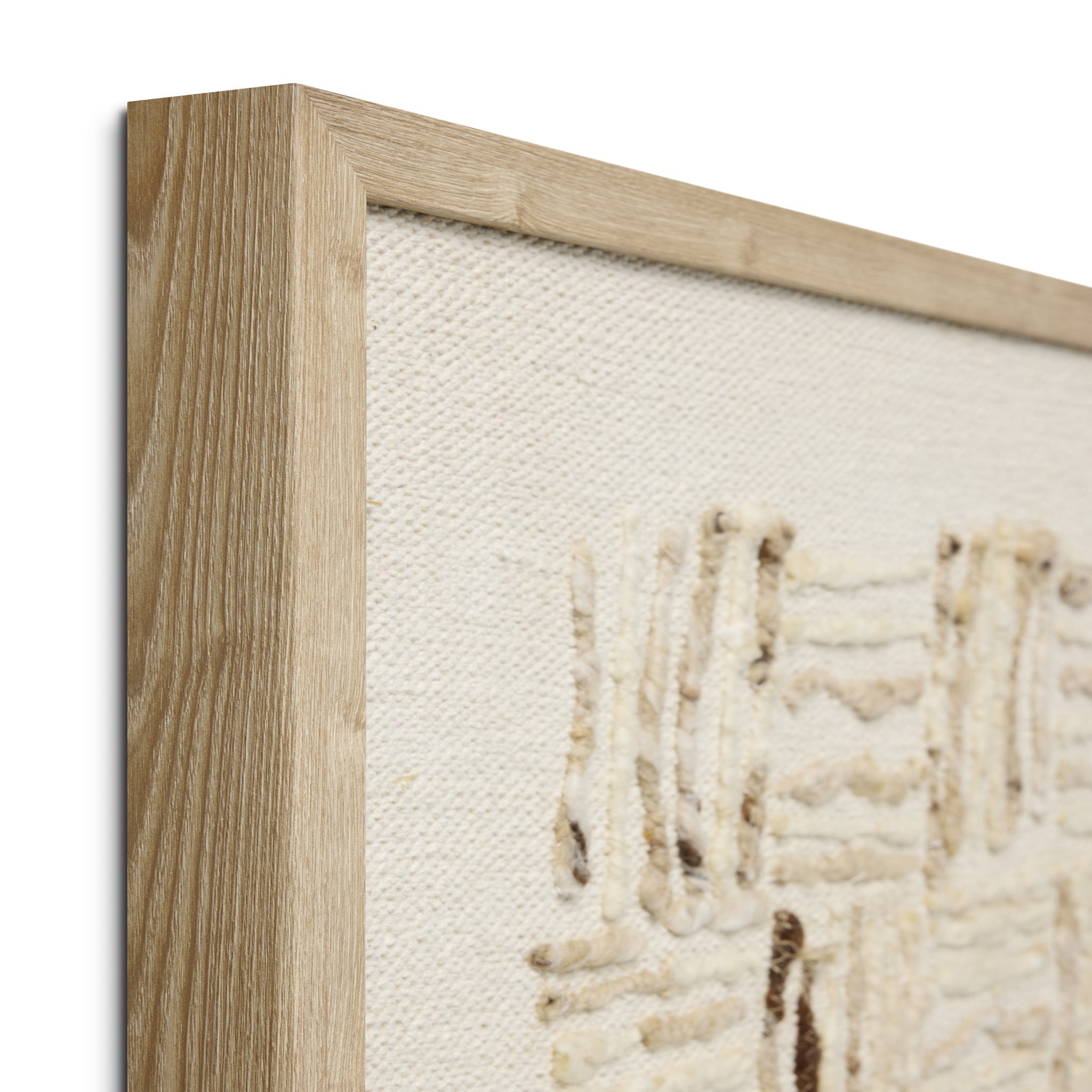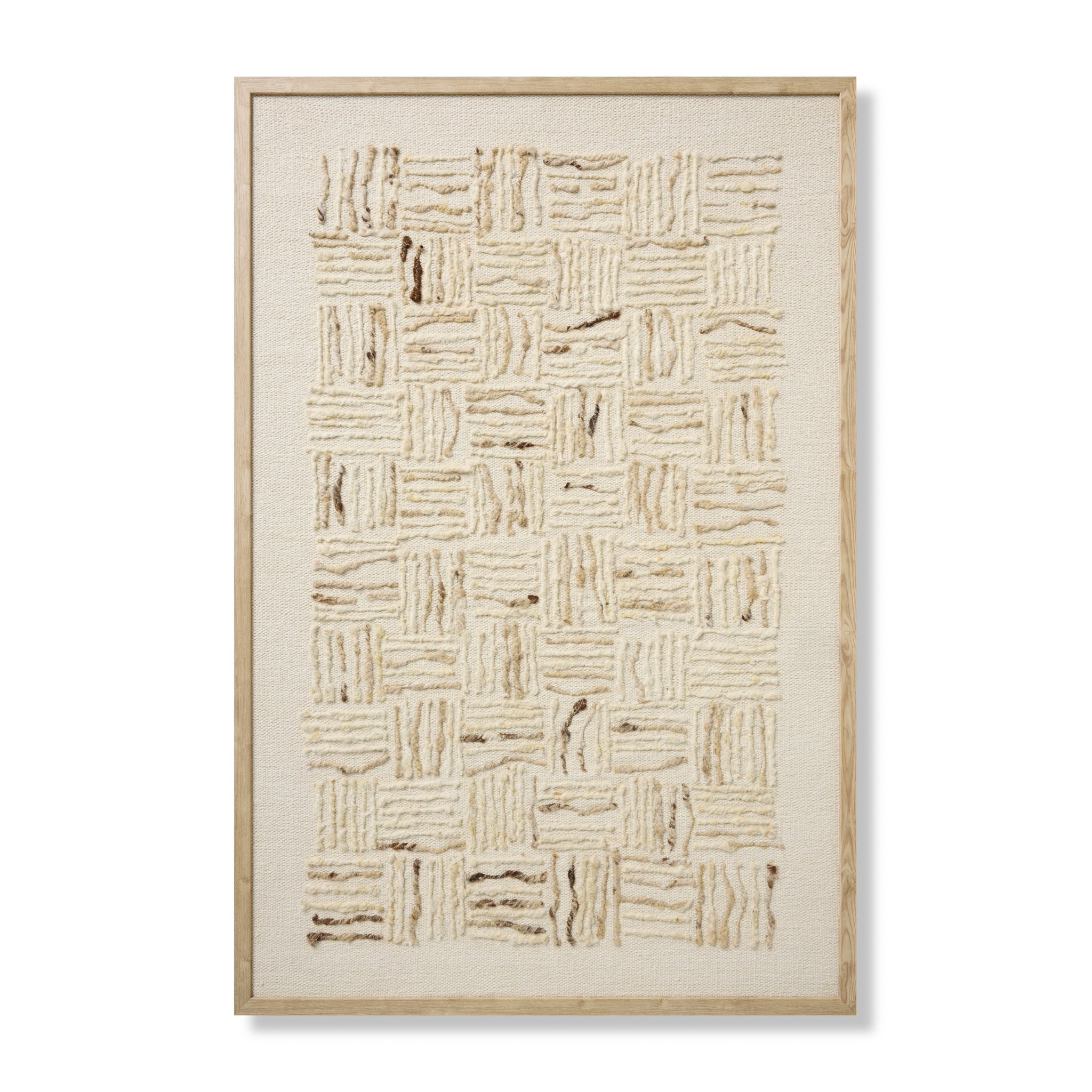 Big Sur is large wall art by Amber Lewis x Loloi with a woven abstract design that reveals natural color variation in its beige yarns, a beautiful accent for organic-modern home decor. The artwork is hand-woven in India and custom-framed by Loloi in the USA