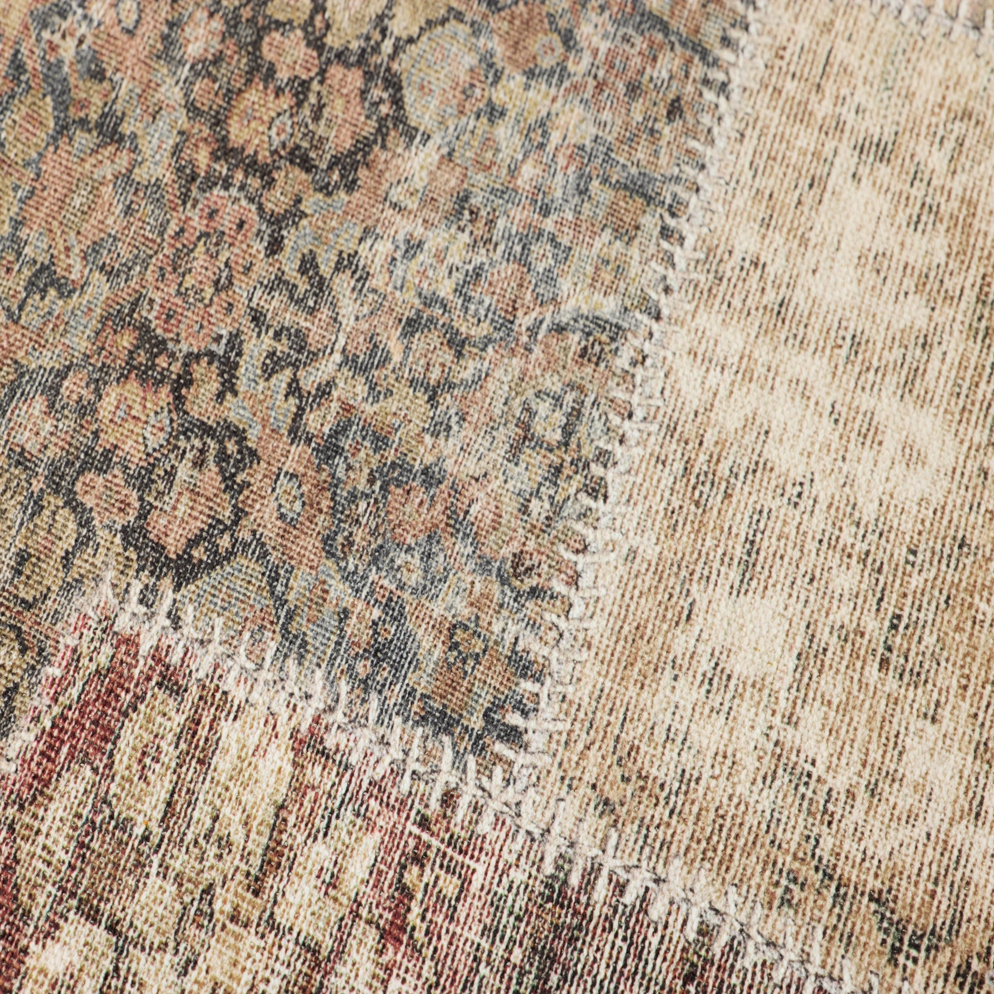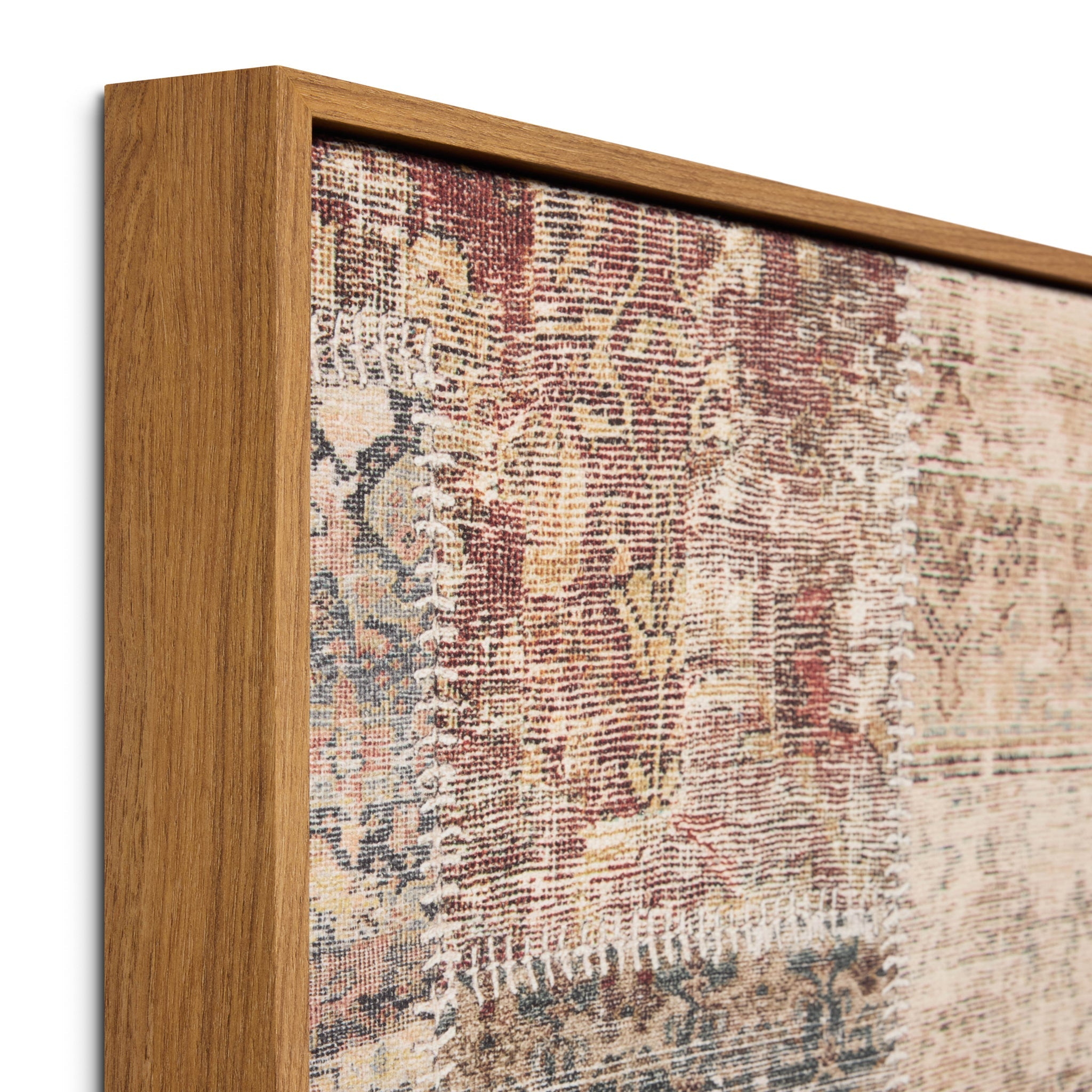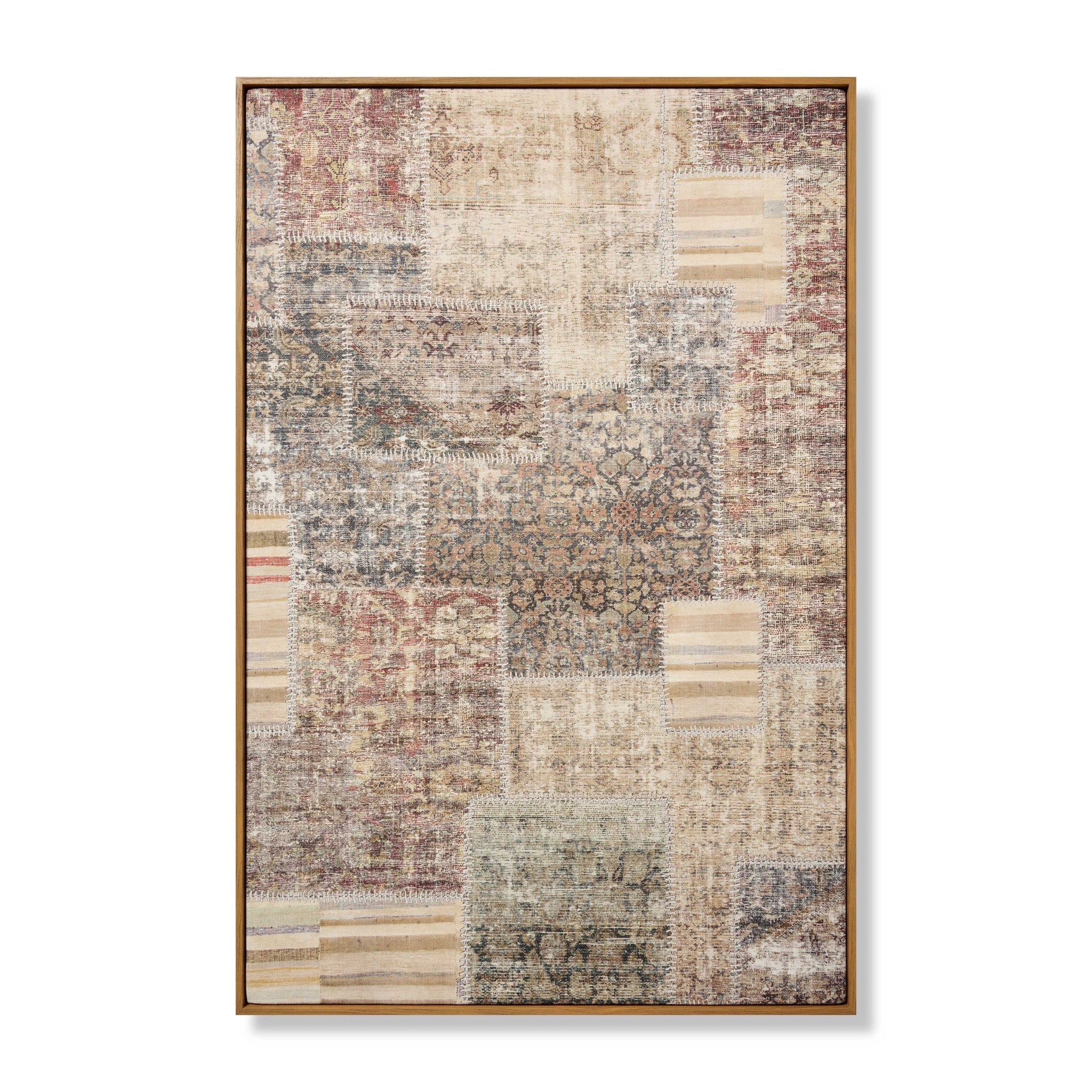 Laguna is large wall art by Amber Lewis x Loloi with a patchwork design made up of stitched vintage-inspired textiles. The earth-toned artwork is made in India and custom-framed by Loloi in the USA