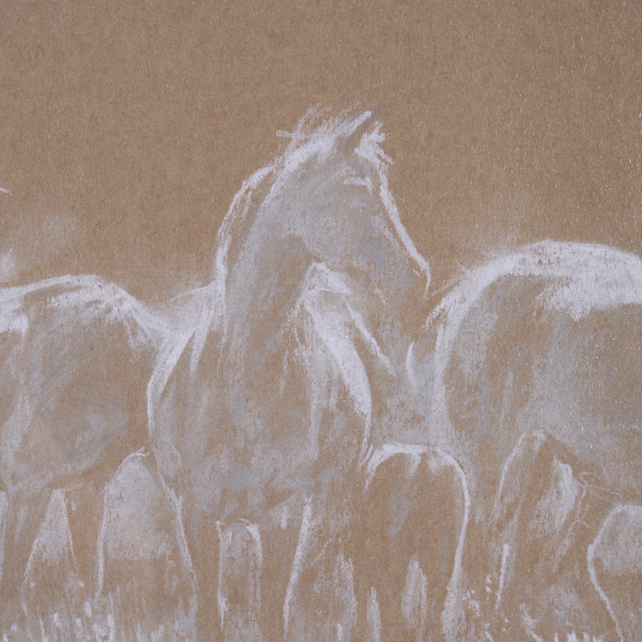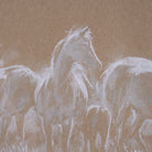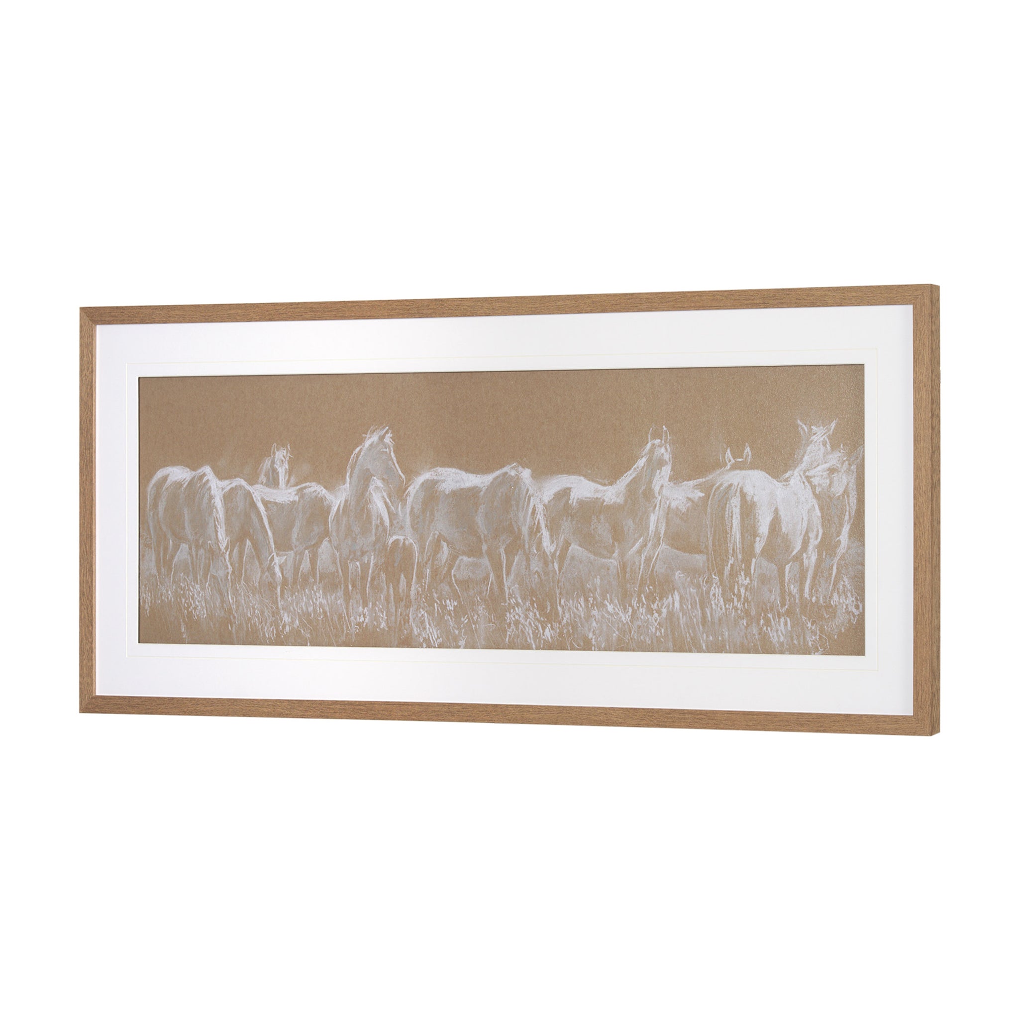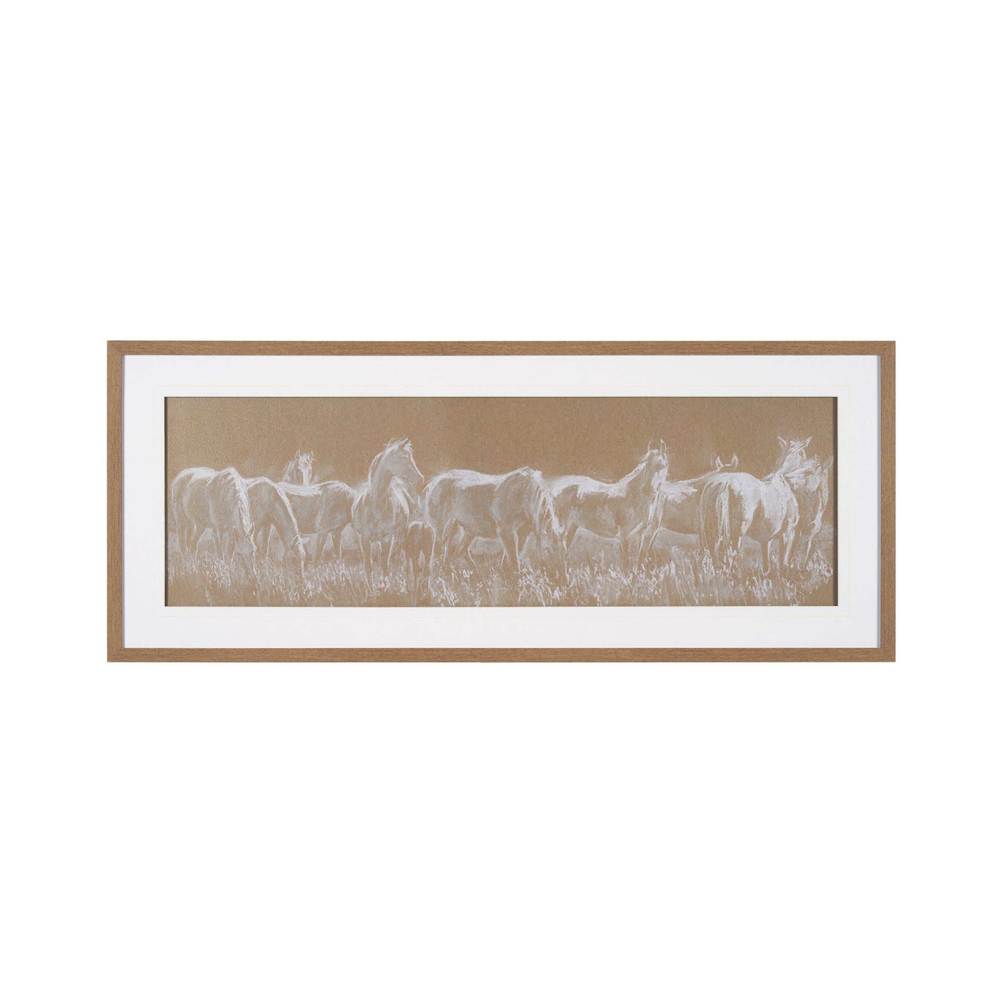 Bring the serene majesty of the open range into your home with this captivating panoramic artwork. A herd of horses is beautifully rendered with delicate white and light tones against a rich, earthy background, creating a soft, textured sketch effect. Framed with a clean white mat, this wide piece offers a tranquil and elegant focal point, perfect for accentuating a long wall and adding natural grace to any space.